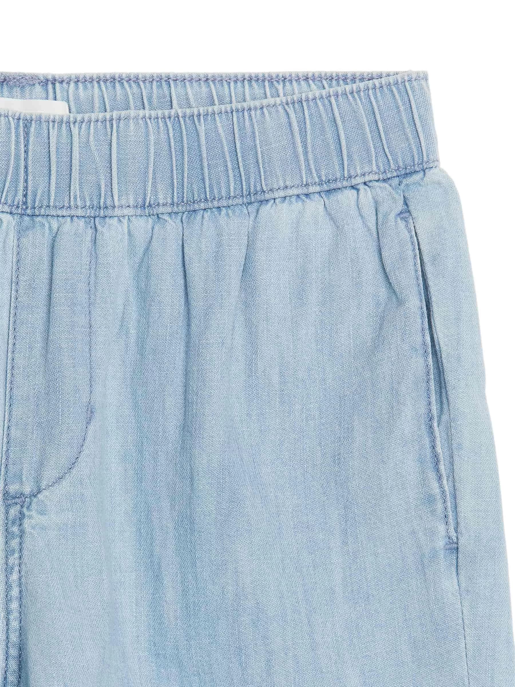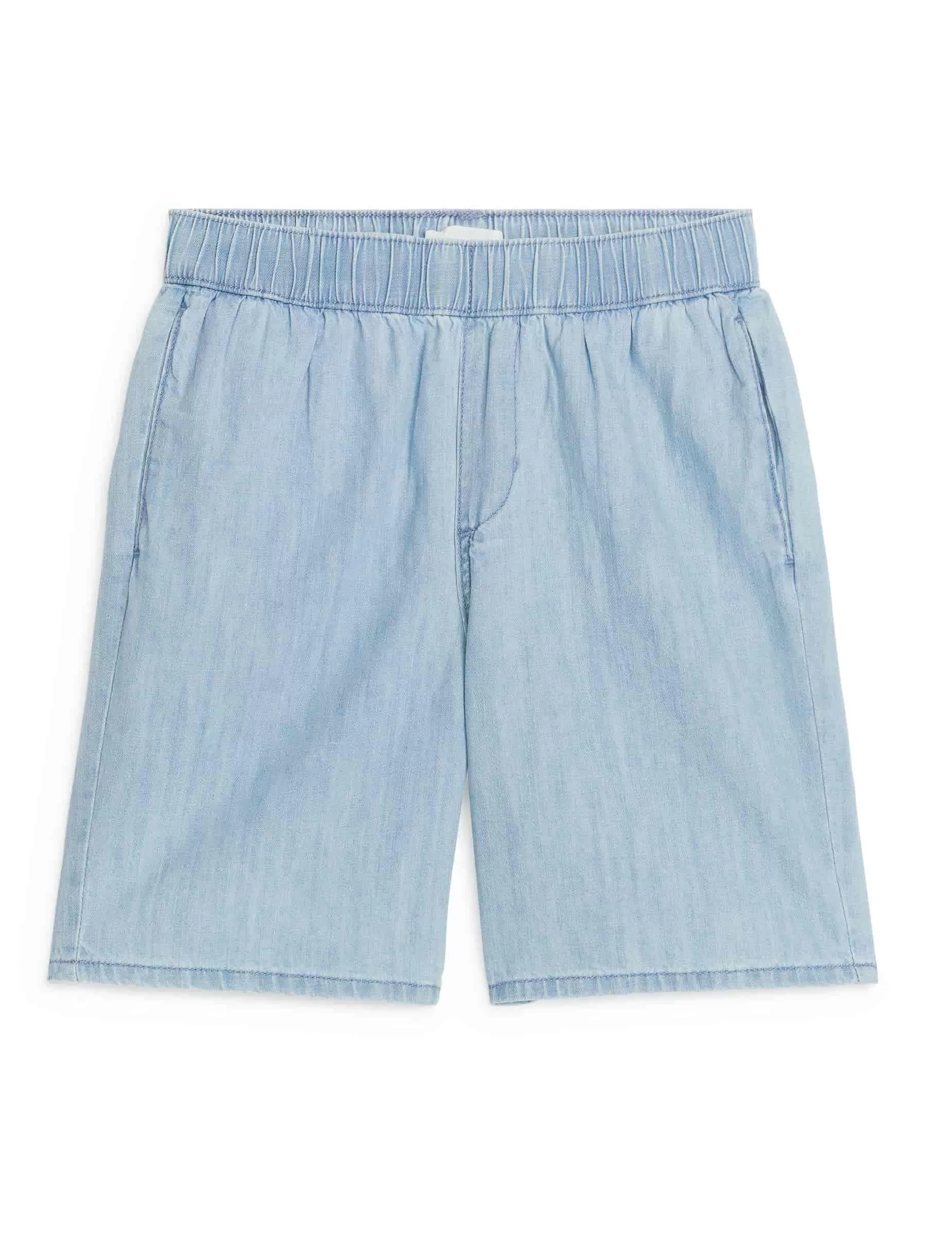 Denimshorts med avslappnad passform i lätt väv av denim. En pull-on-stil med justerbara resårer i midjan, sidosömsfickor och en enda passpoalficka bak. Klipp för att falla ovanför knäet. Falsk fluga. Del av uppsättningen.