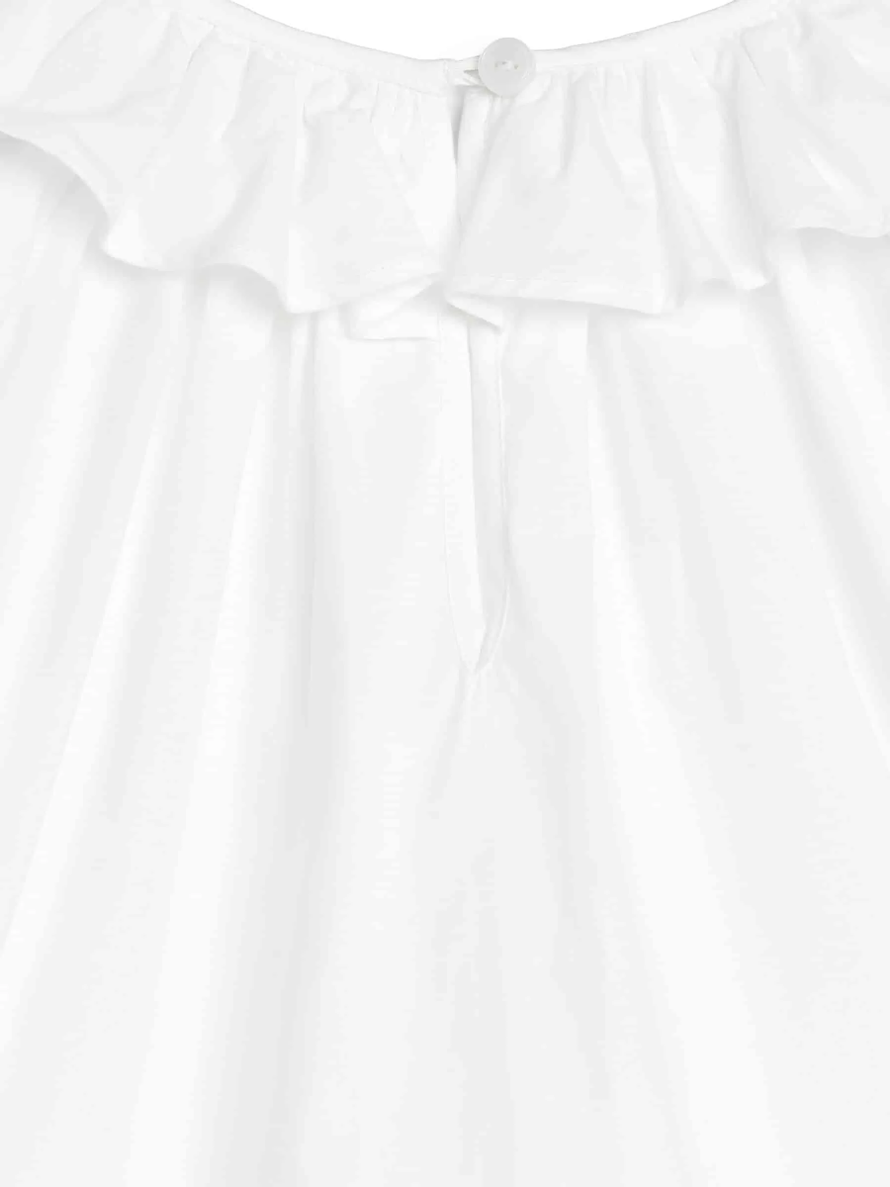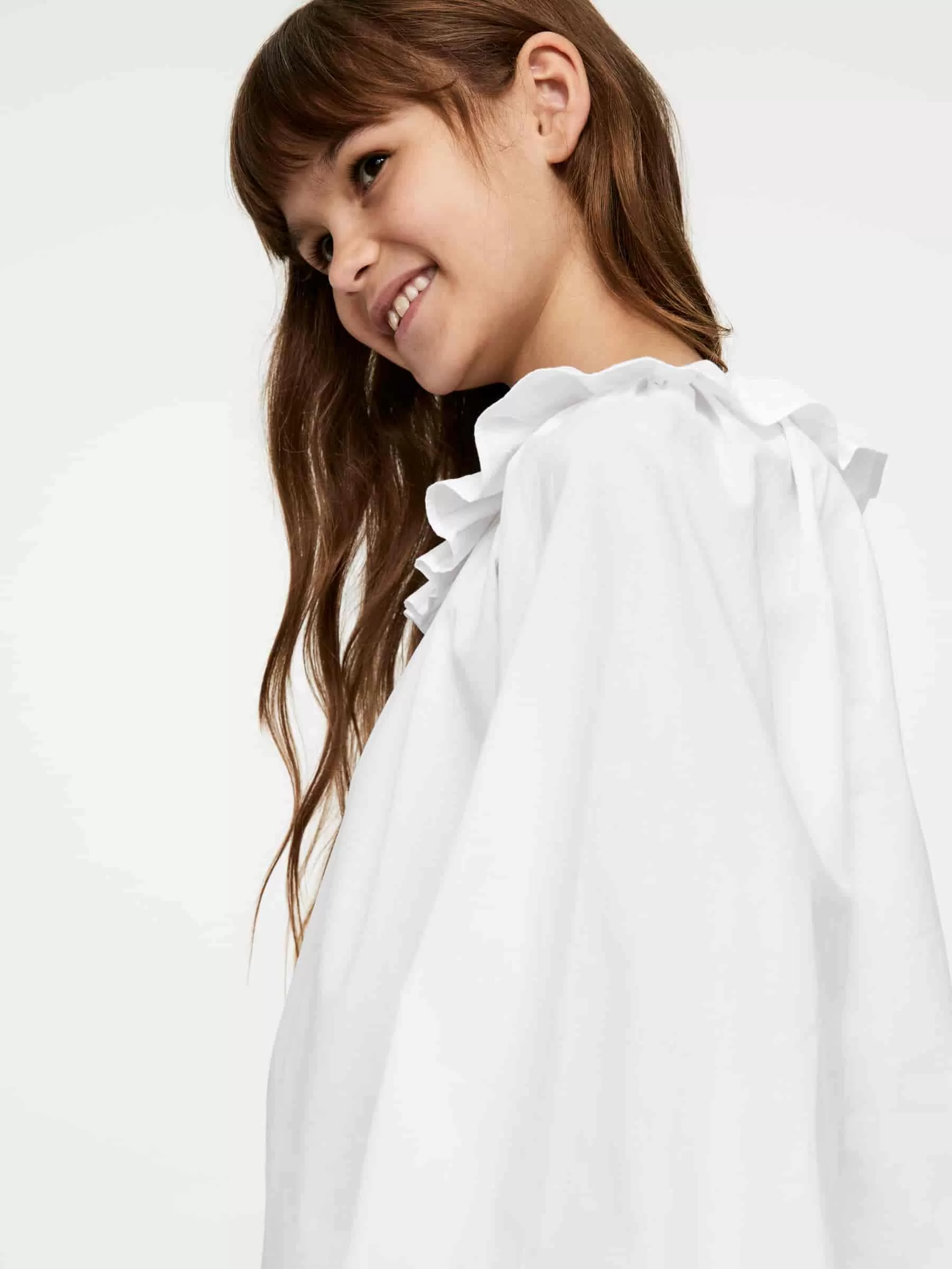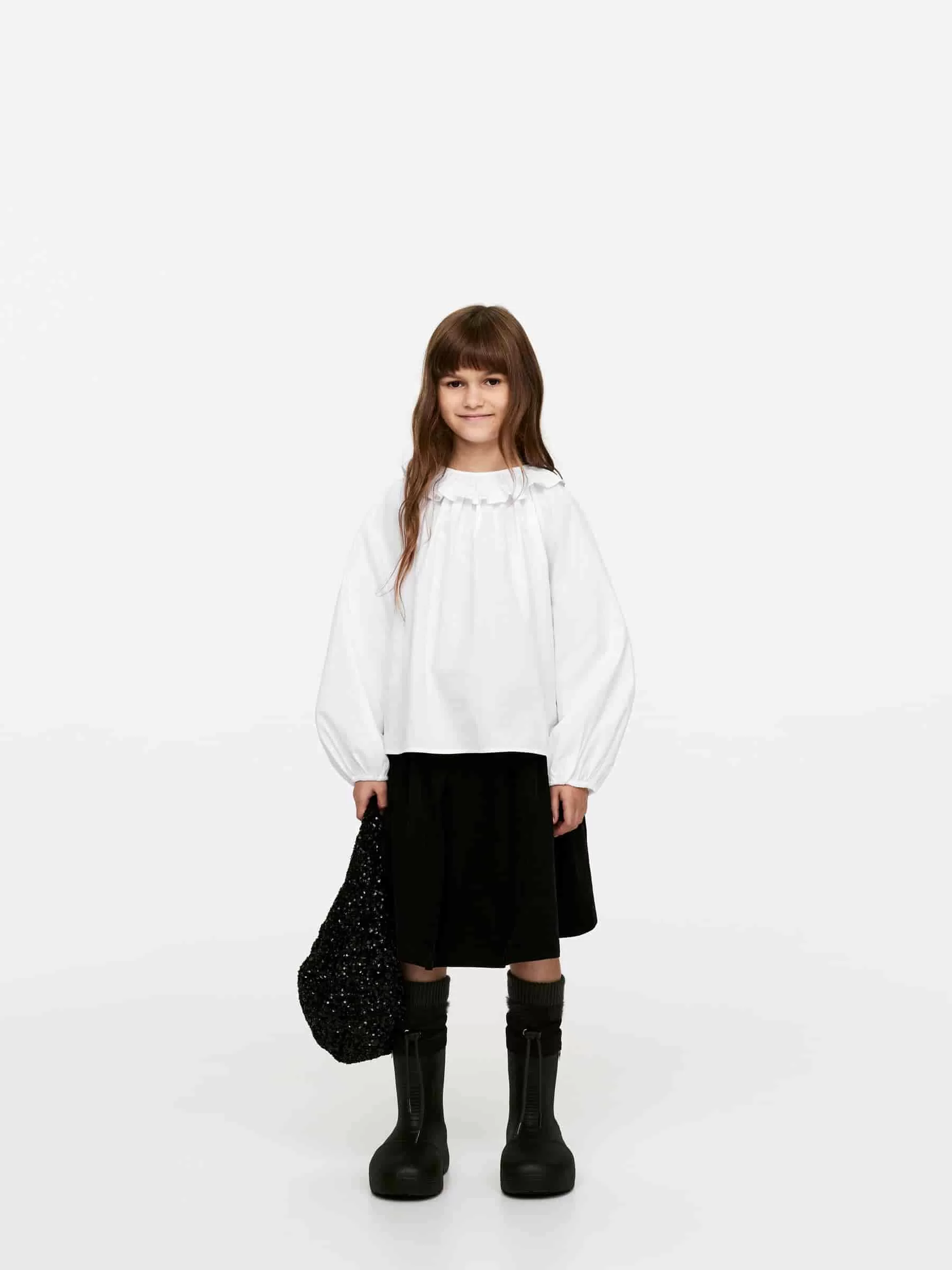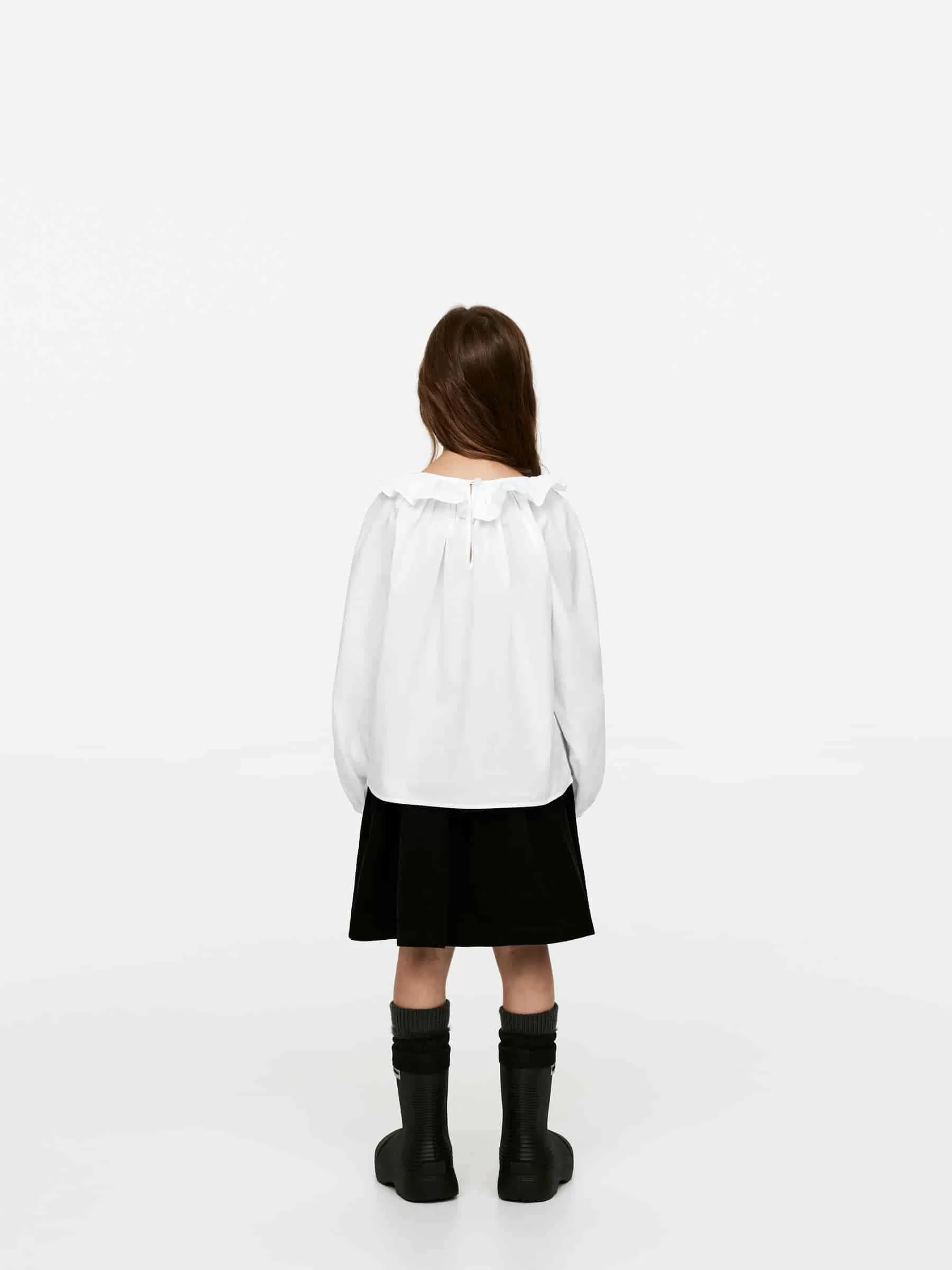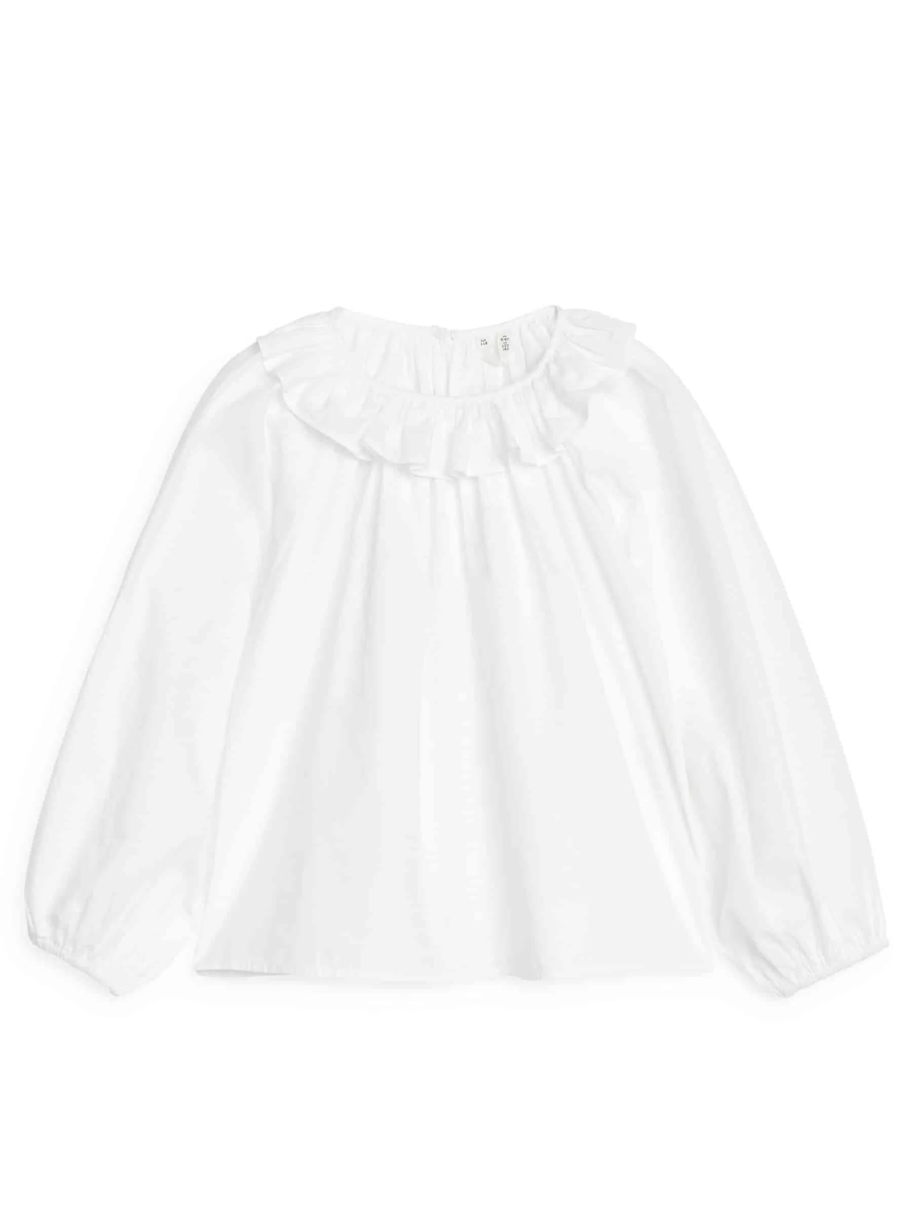 Bomullsblus med volangkrage och raglanärmar. Ögla och knappstängning mitt bak.