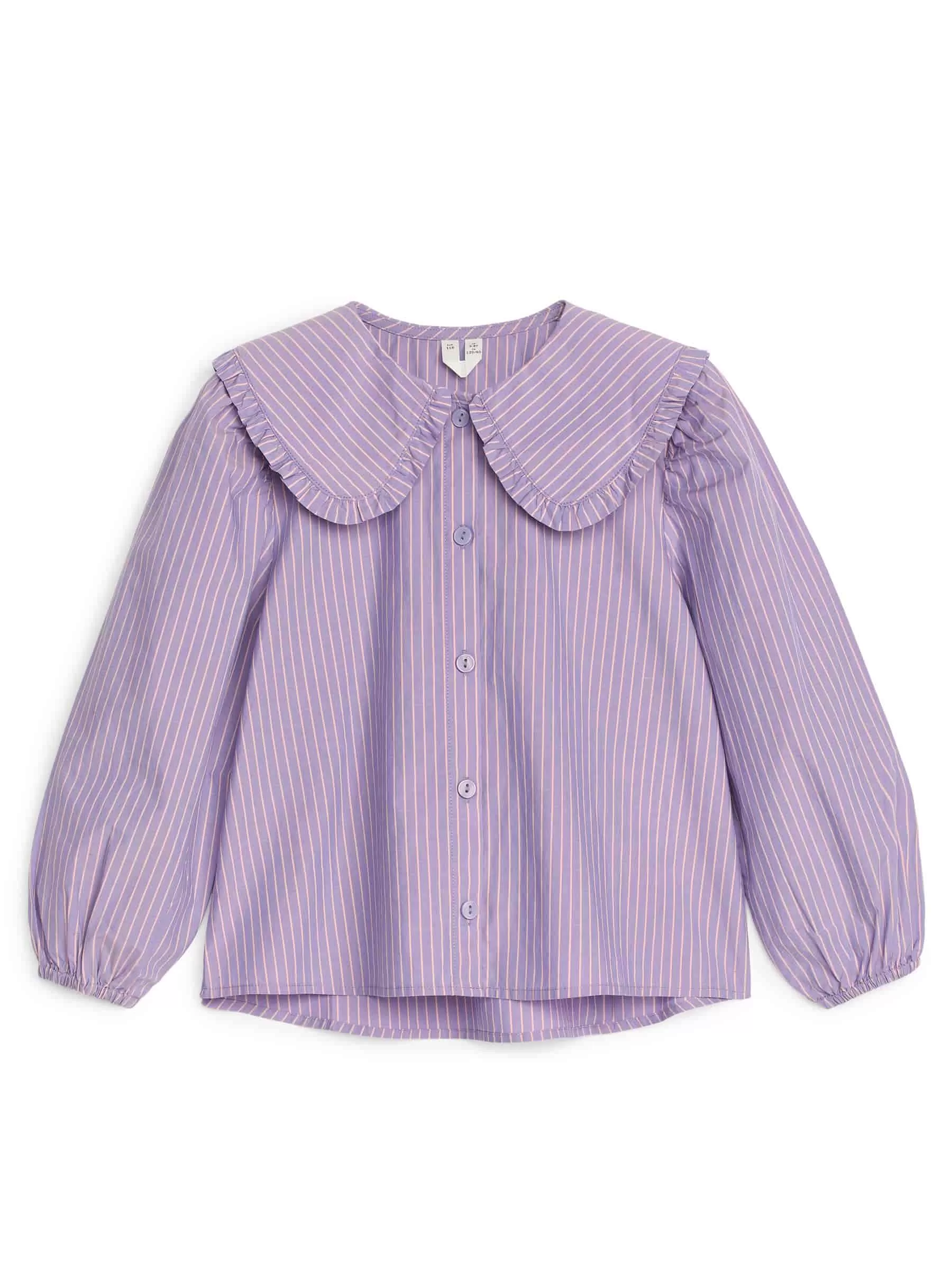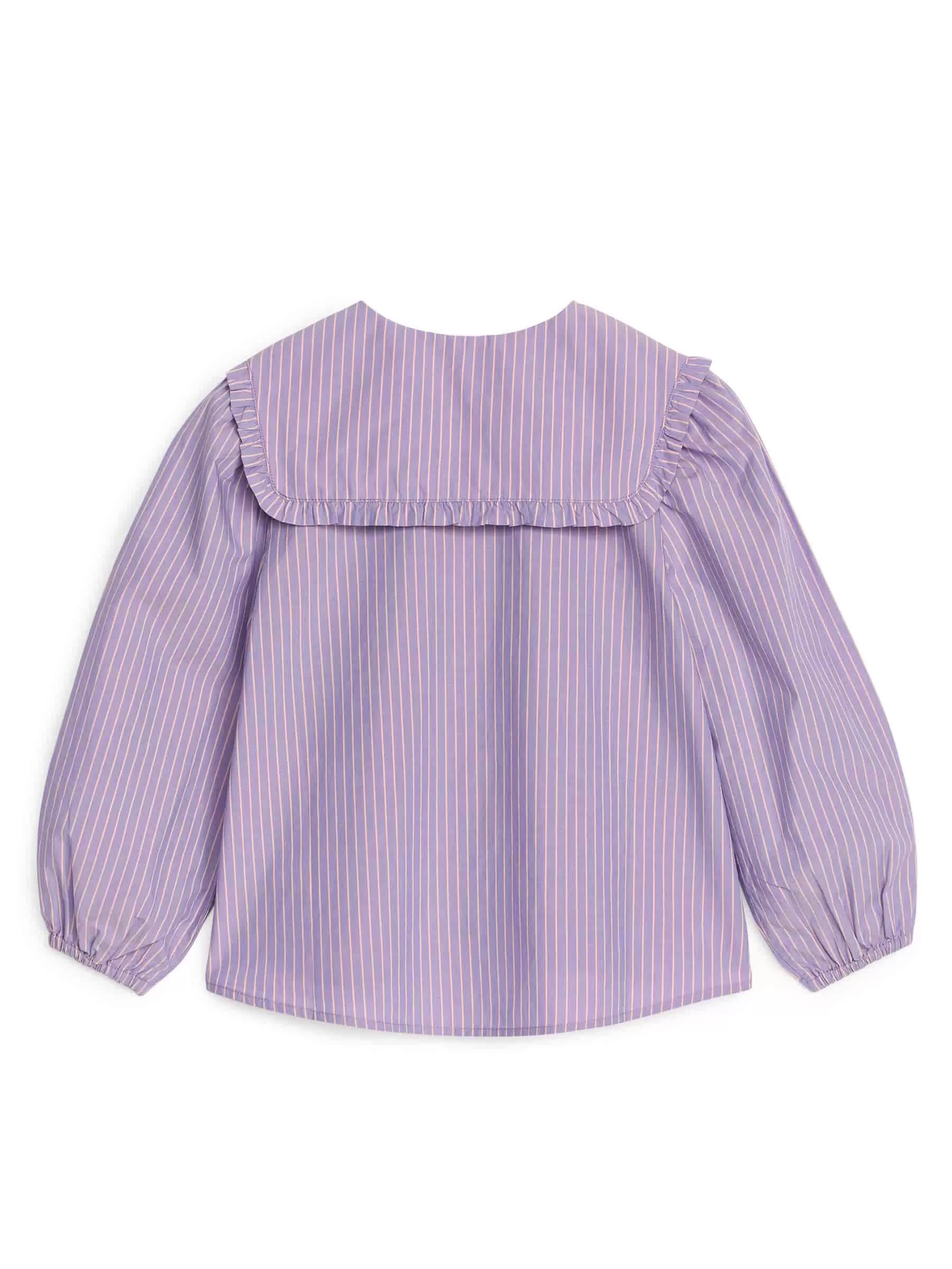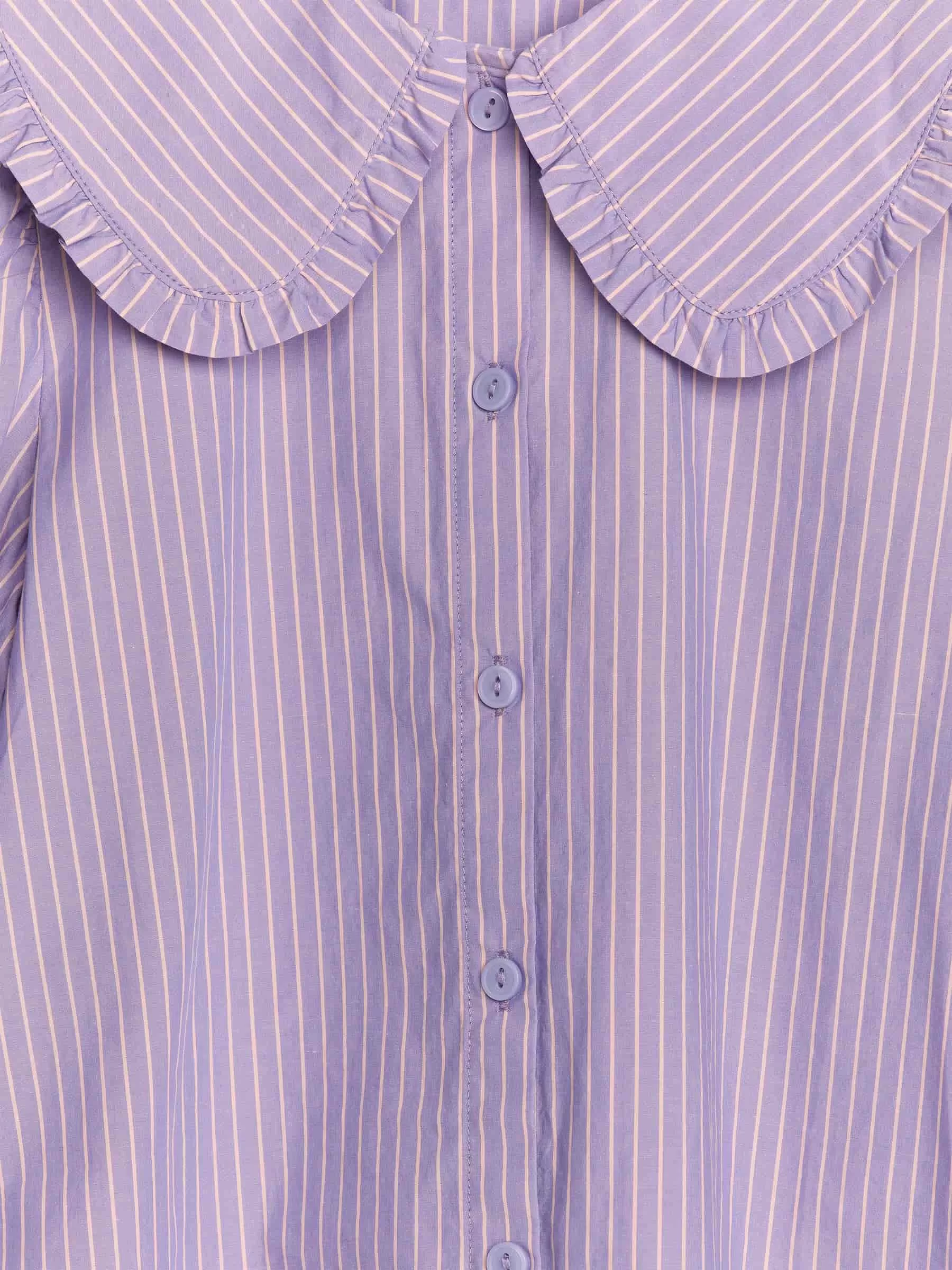 Blus med rundad krage med volang och knappstängning mitt fram. Rynk och resår vid ärmkanter. Normal passform.