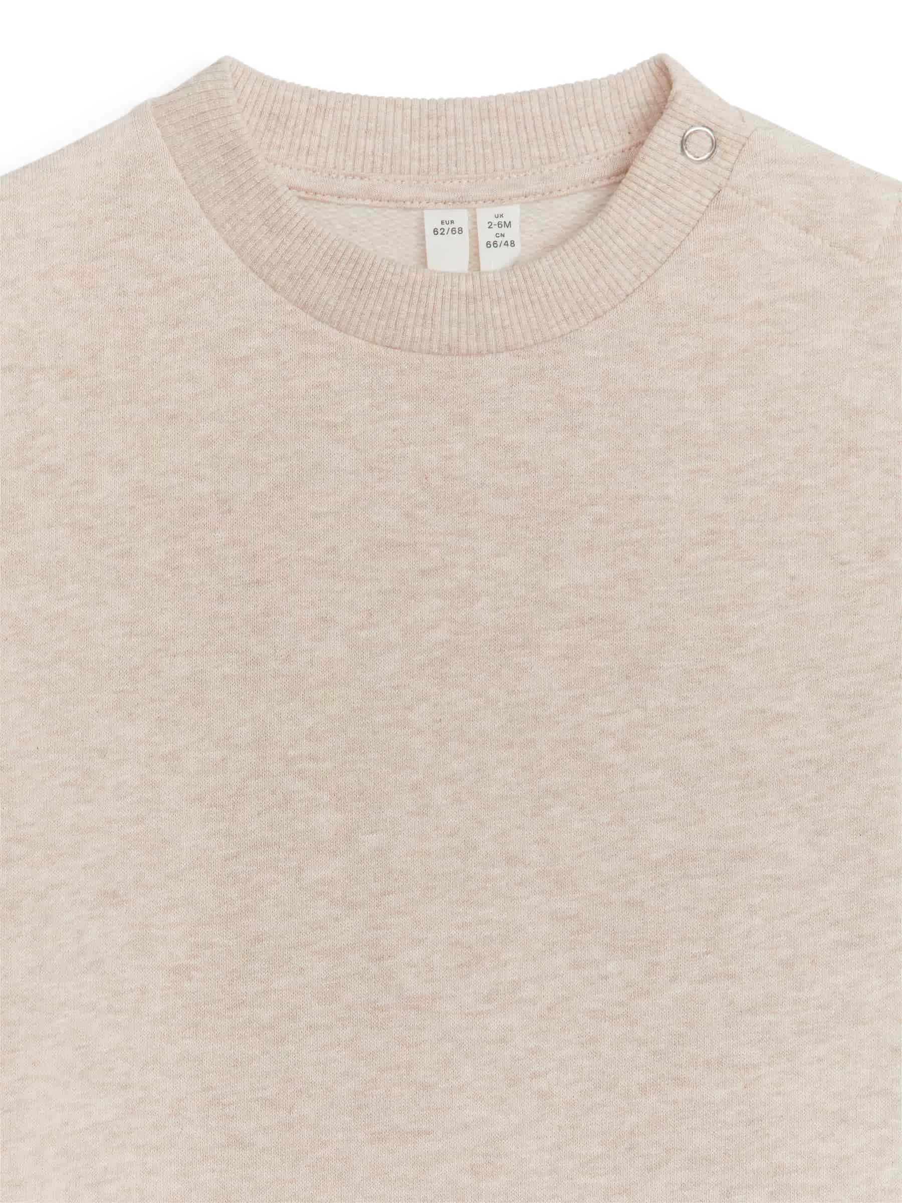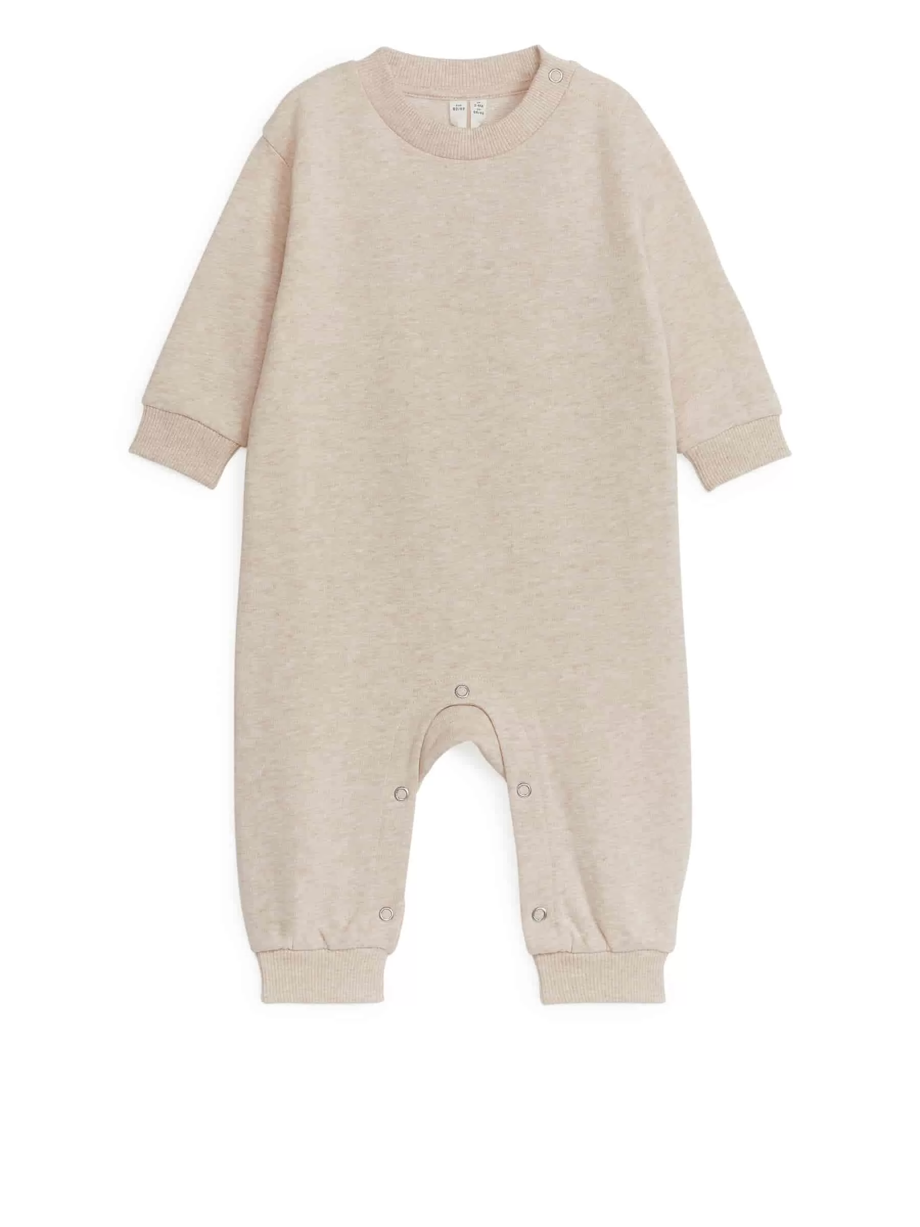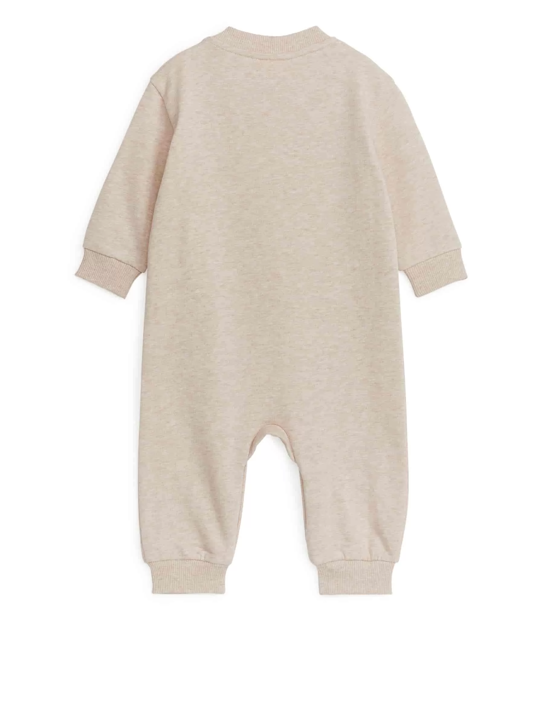 Overall i mjukt fransk frottétyg. Klippt för en bekvämt lös passform och stylad med ribbad kant. Tryckknappar i grenen och på axeln för enkel påklädning.