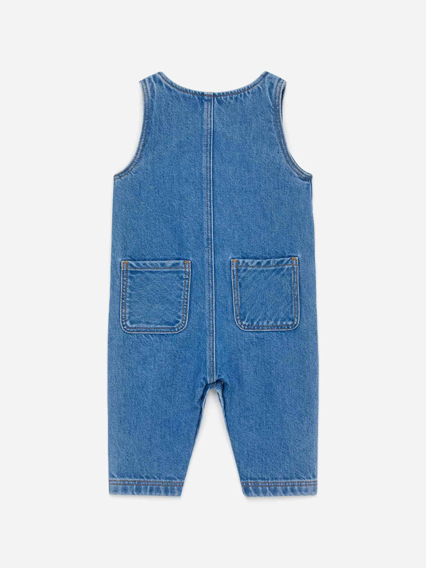 Ärmlös jumpsuit skuren av denimtwill av bomull. Tryckknappar fram och i grenen för alla storlekar utom 86-92. Bakfickor.