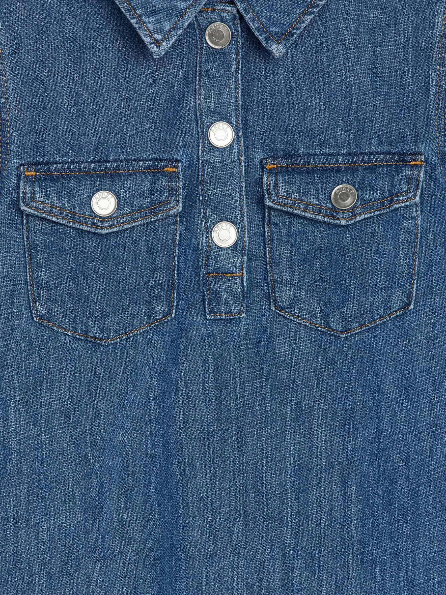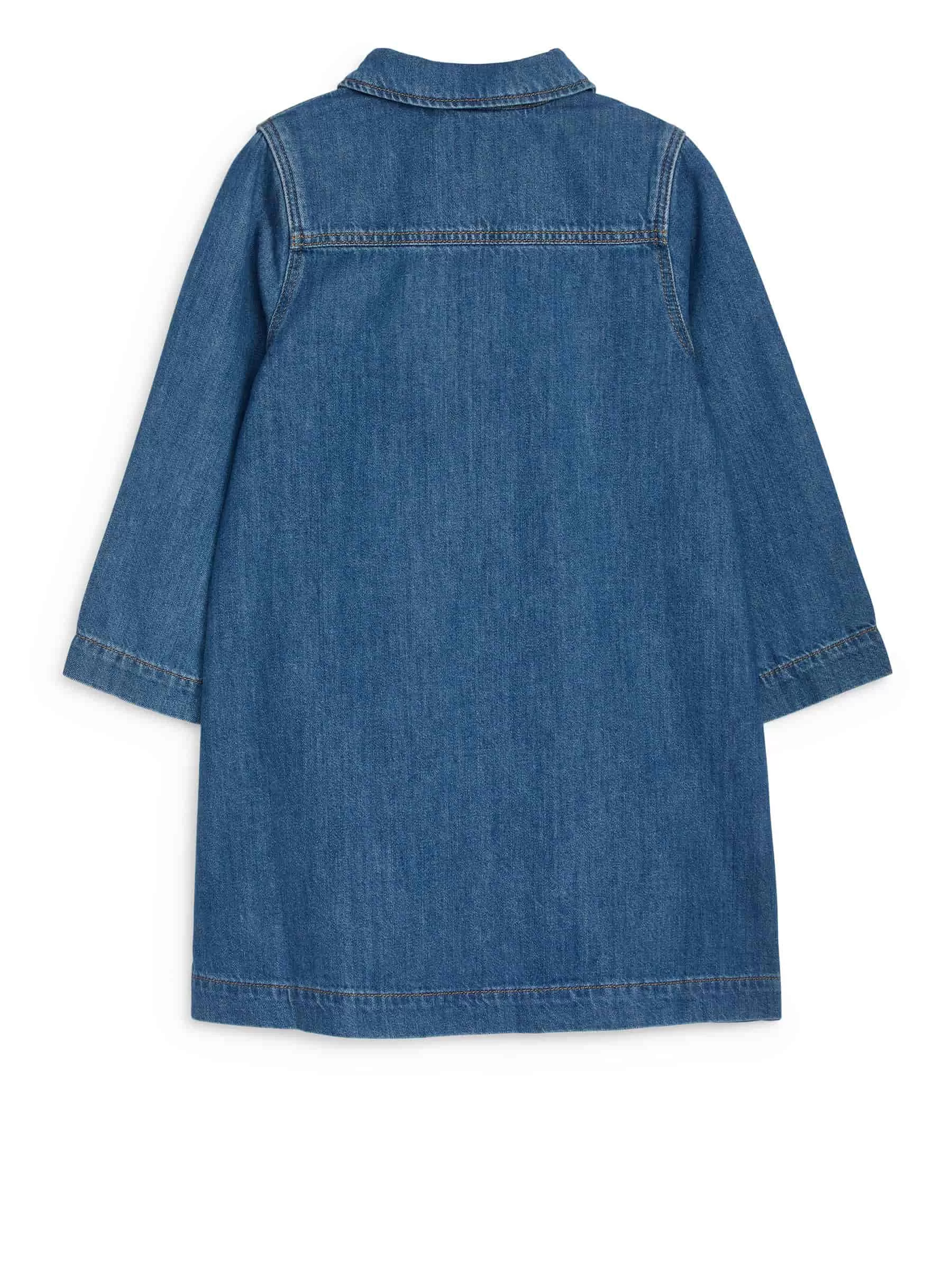 Långärmad denimklänning tillverkad av en bomullsblandning. Skjortkrage och halvknäppning med tryckknappar. Fickor med tryckknappar fram.