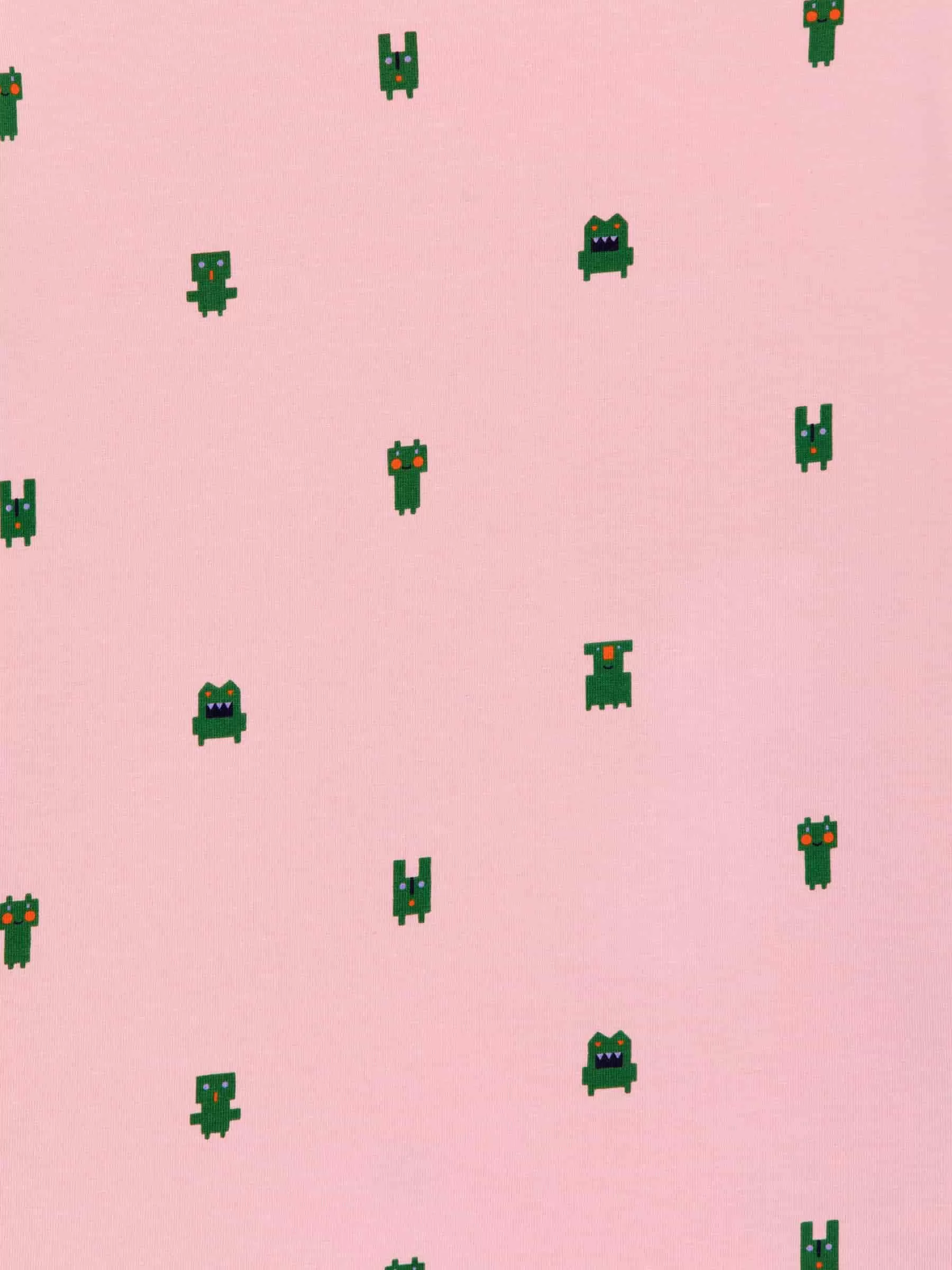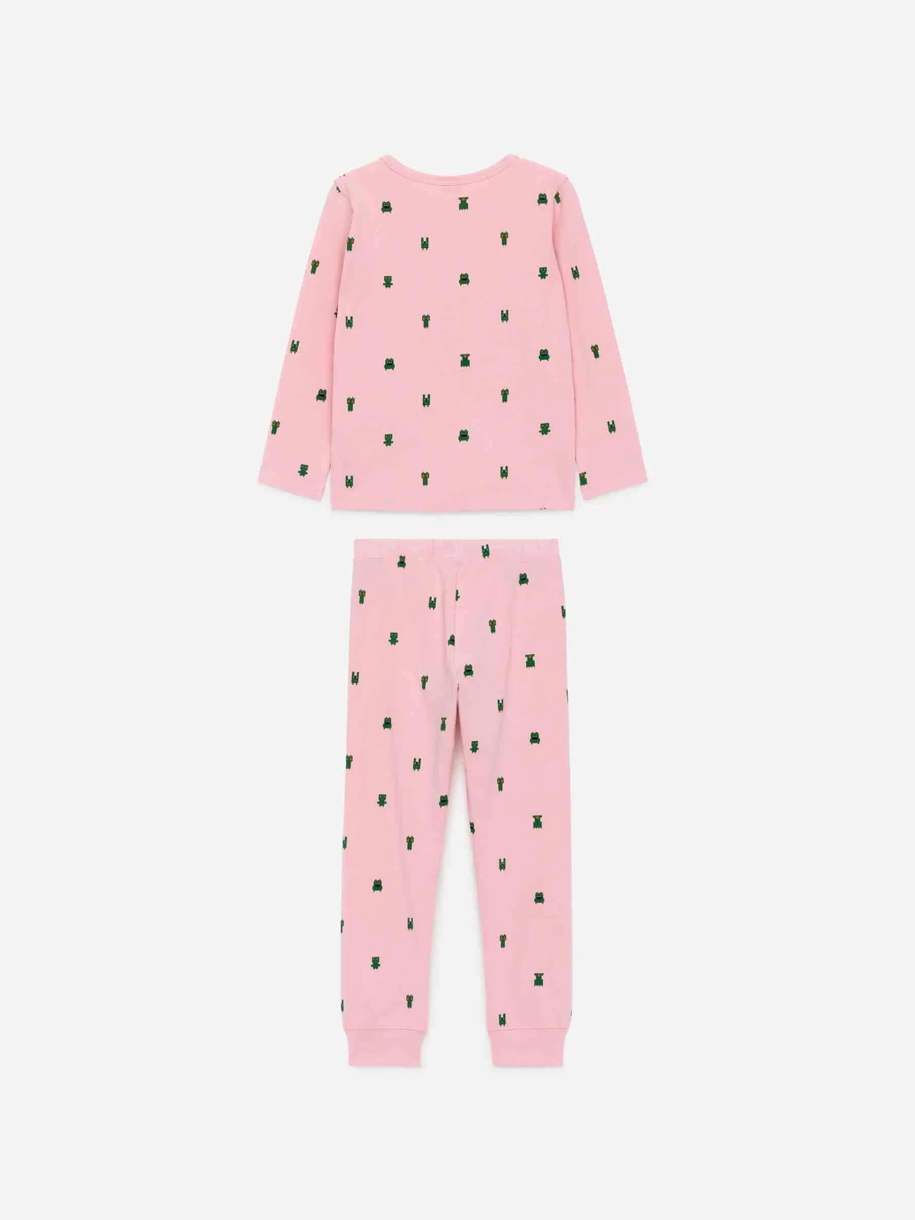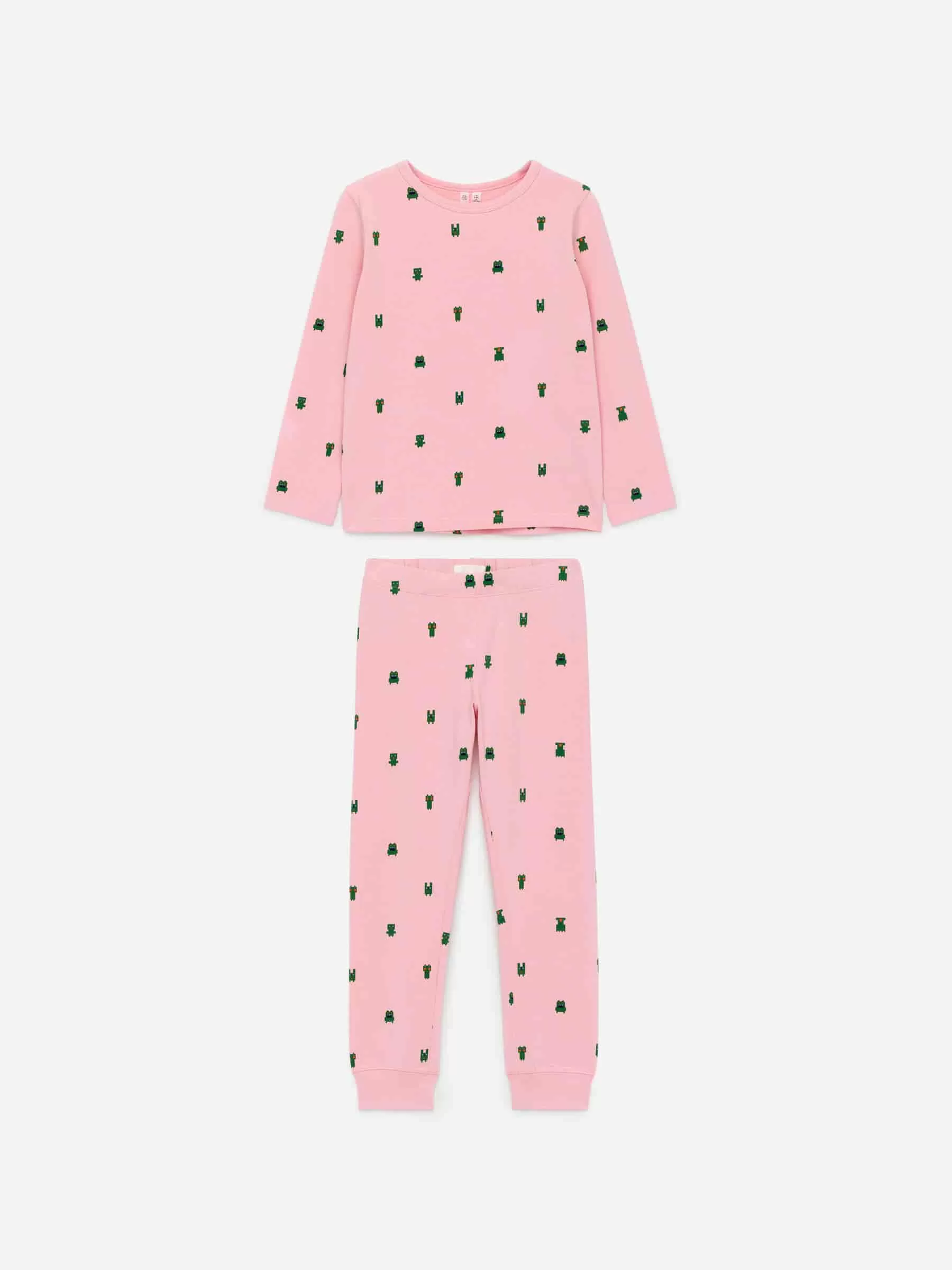 Den här tvådelade pyjamasen är sydd av ett mjukt jerseytyg i bomull. En rundad pyjamastopp med långa ärmar och byxor med resår i midjan. Ribbstickade muddar vid både ärmar och ben.