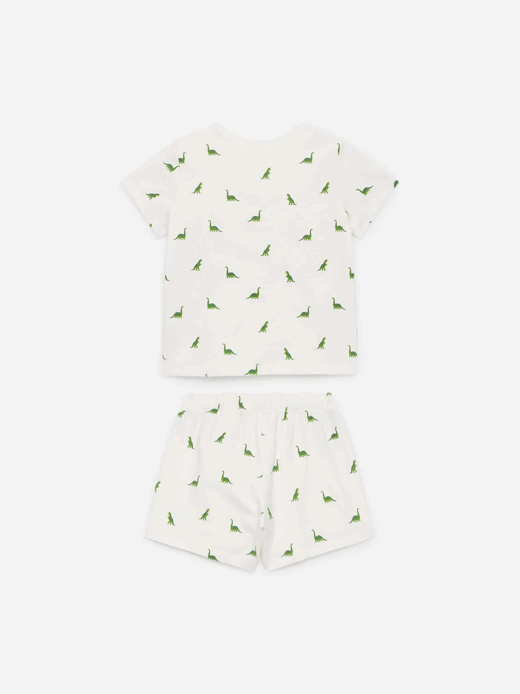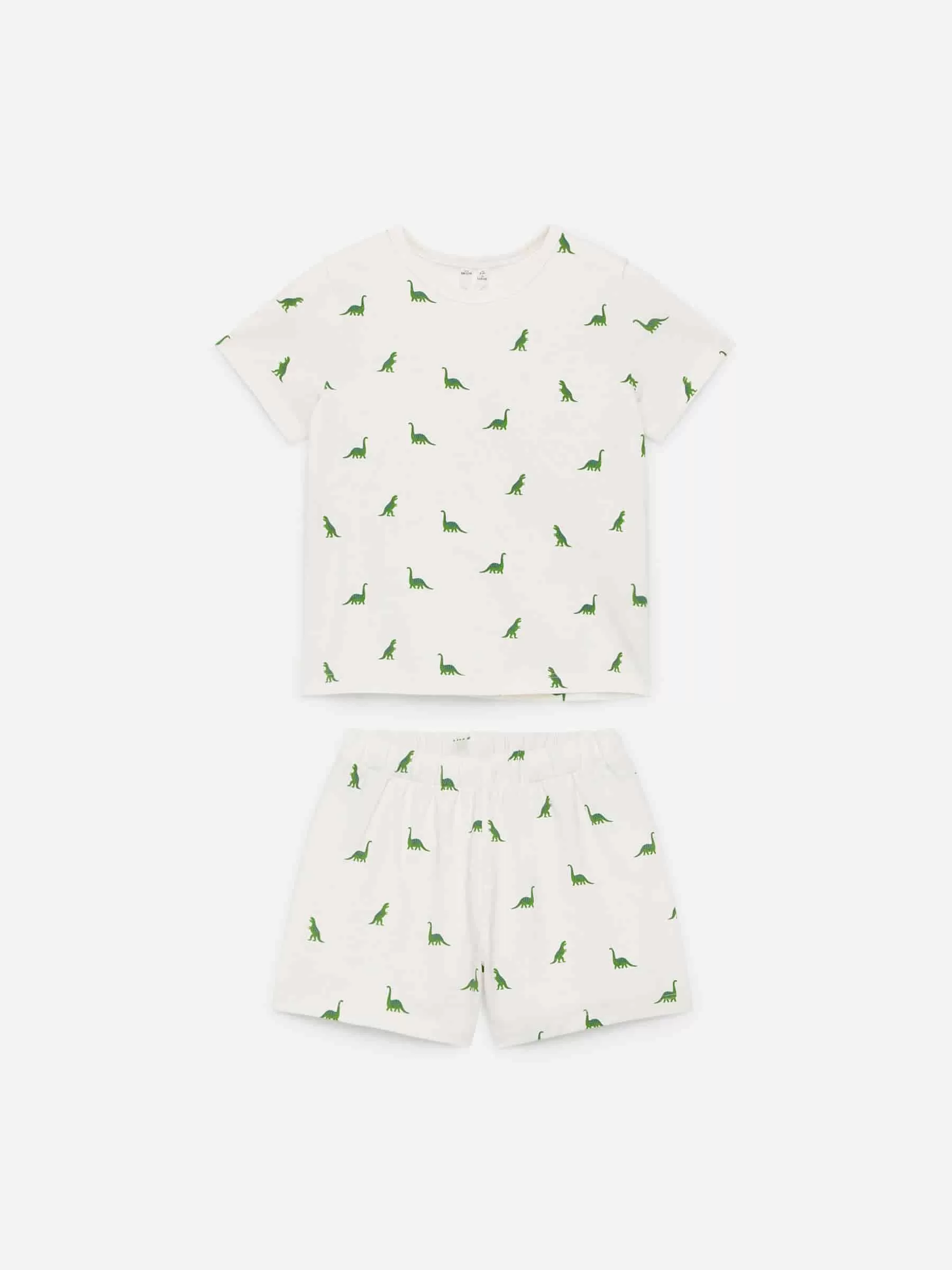Mjukt pyjamasset sytt av bomullsjersey med en delikat ribbad struktur. Setet innehåller en T-shirt med normal passform och ett par shorts med resår i midjan.