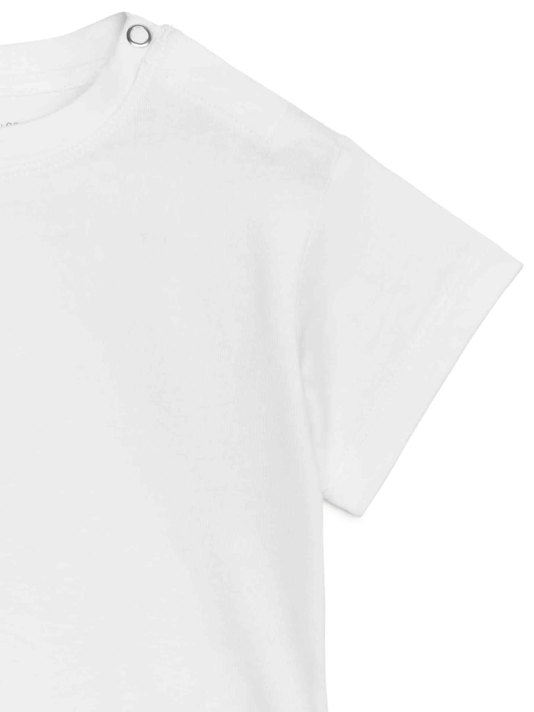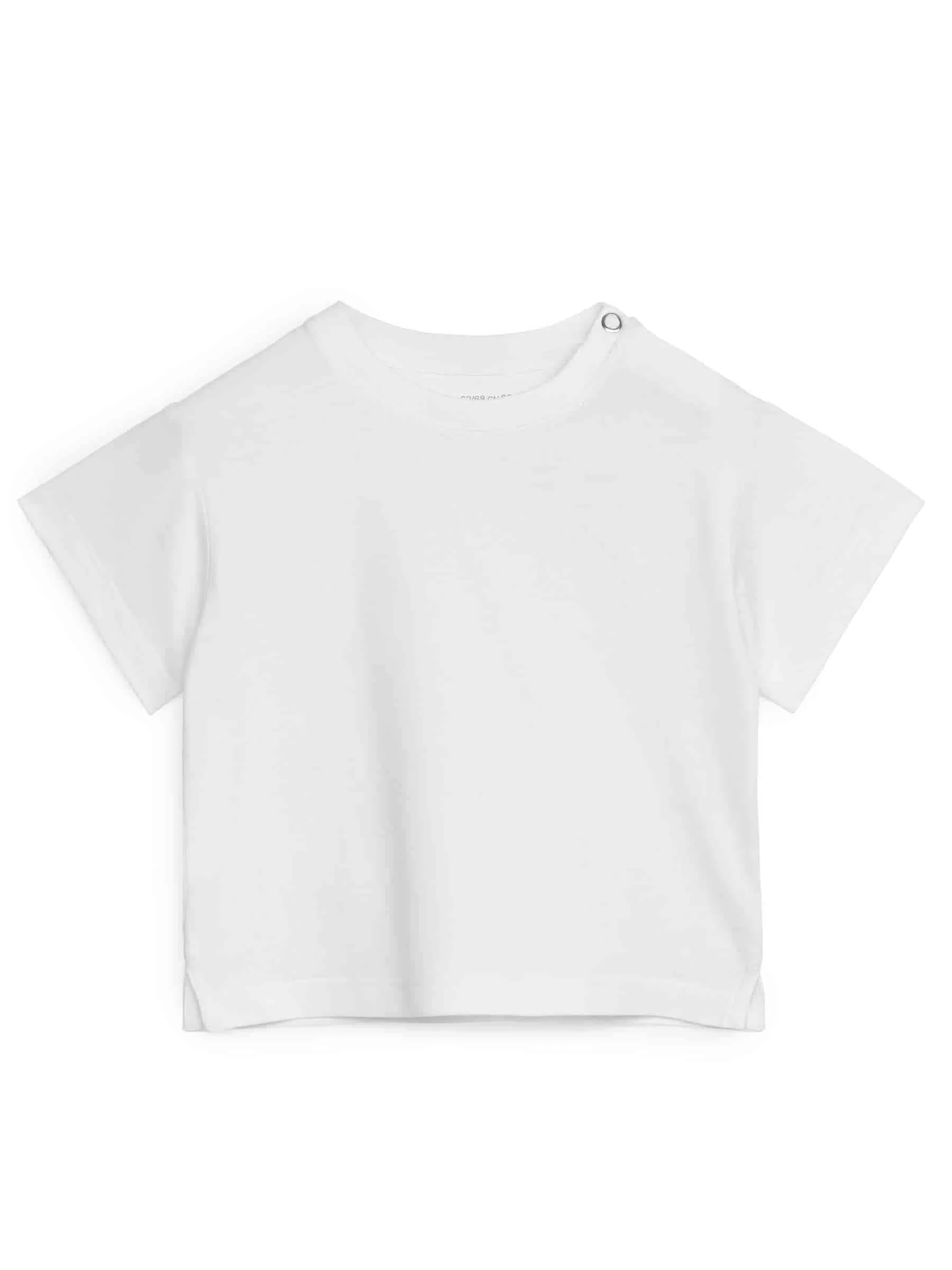 T-shirt med kort ärm gjord av en mjuk singeltröja av bomull. Klipp för en lös passform med lätt tappade axlar. Tryckknapp på vänster axel för enkel påklädning. Slitsar i sidsömmarna.