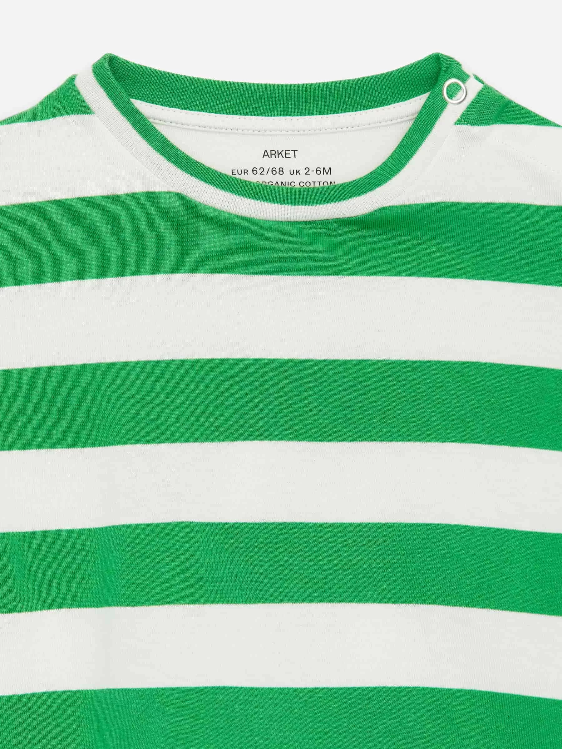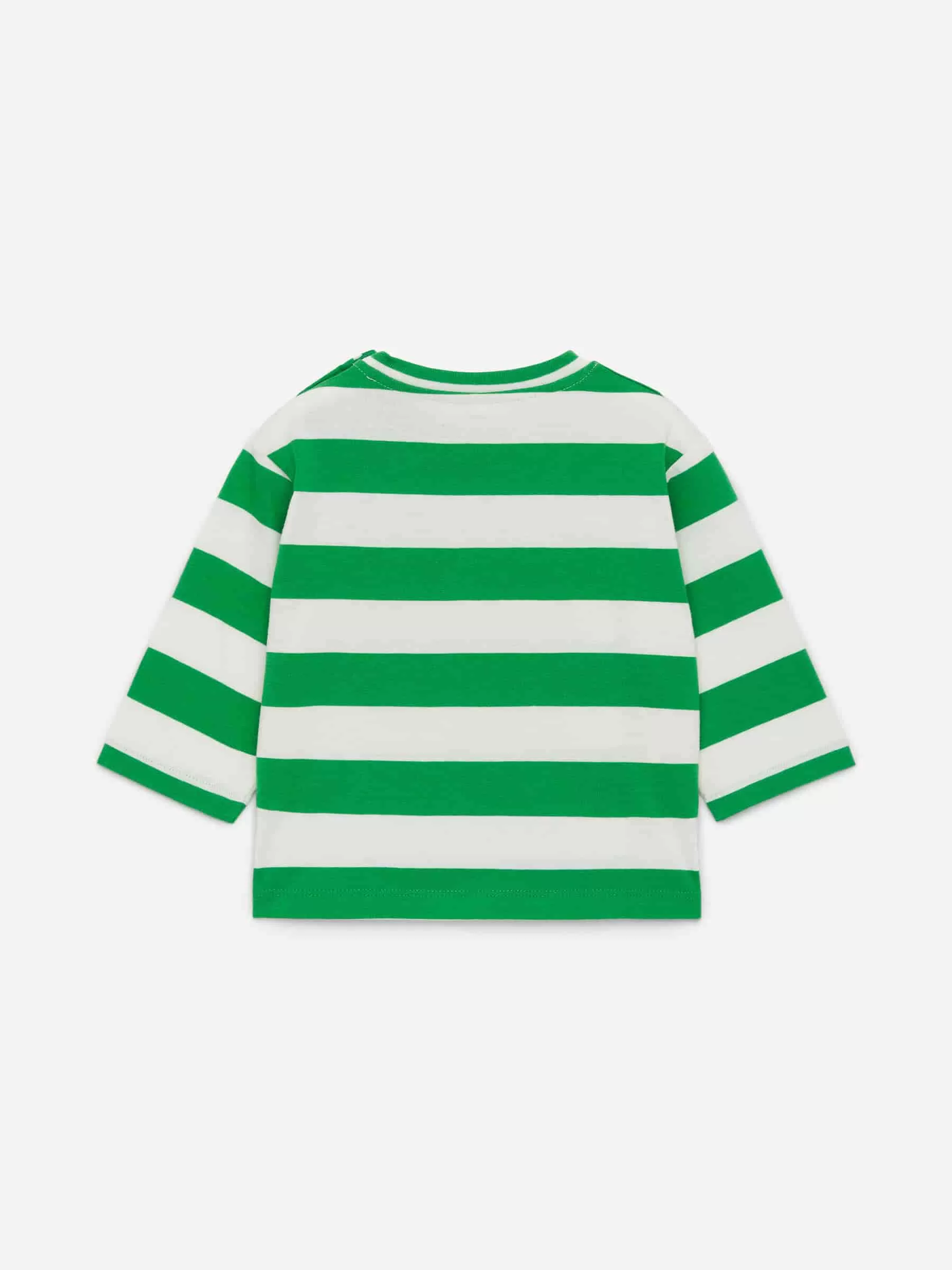 Långärmad topp sydd av mjuk enkeljersey i bomull. En rund halsad stil med tryckknappar på vänster axel för enkel påklädning. Små slitsar i sidsömmarna.