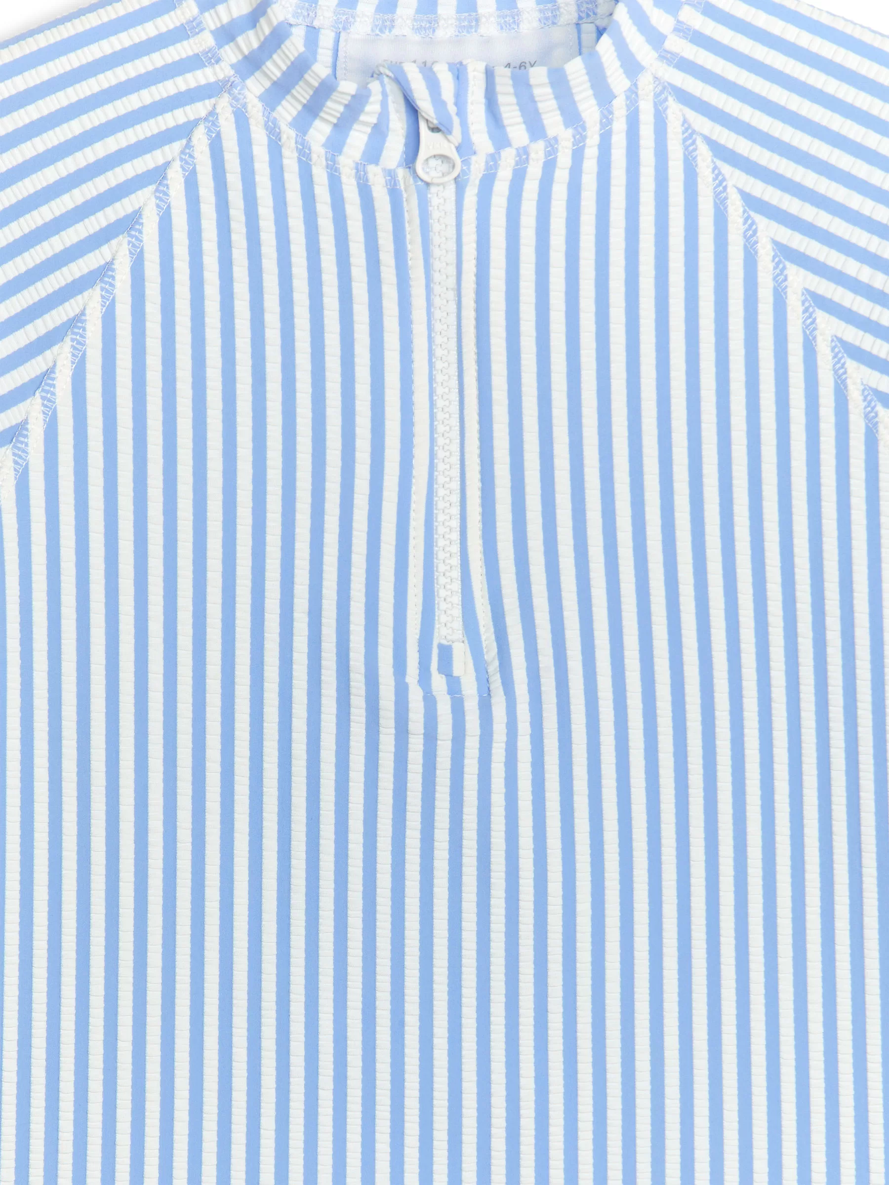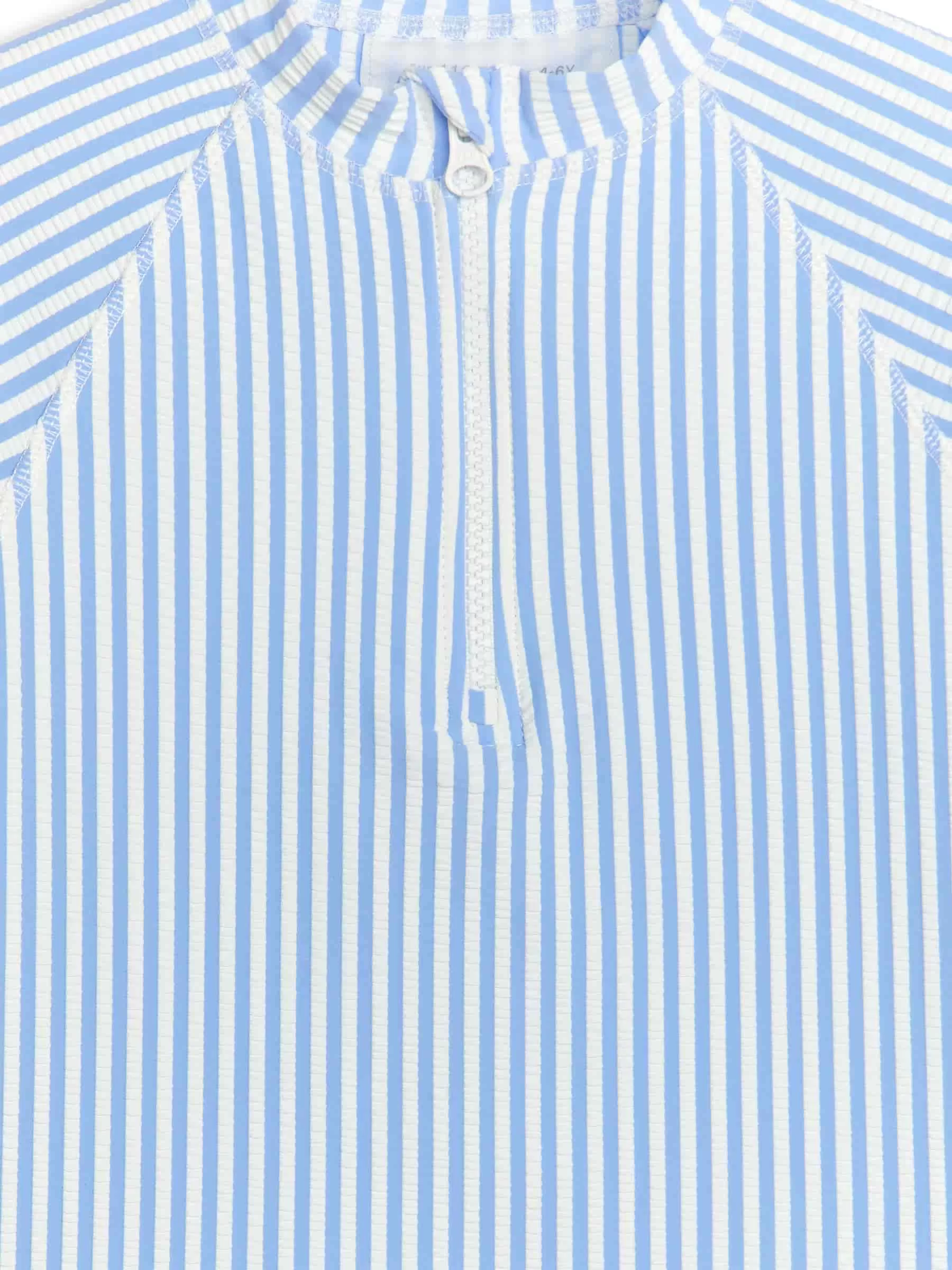 Långärmad simtopp med UV-skyddsteknik och dragkedja framtill. Materialet är snabbtorkande seersucker-tyg.
