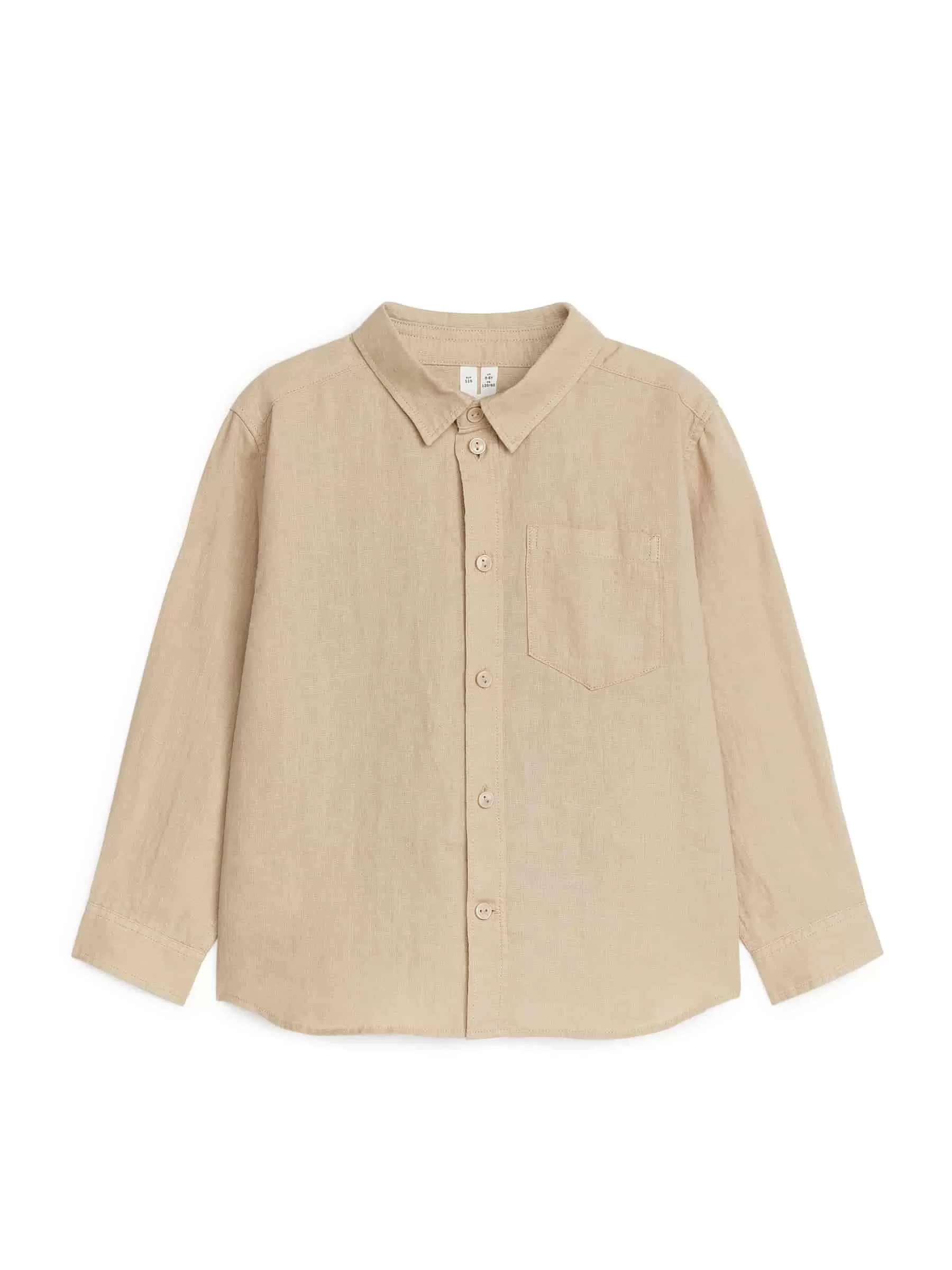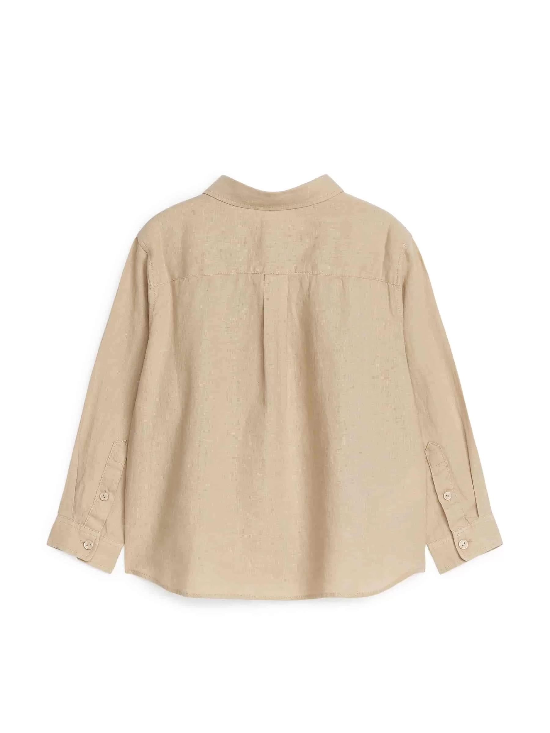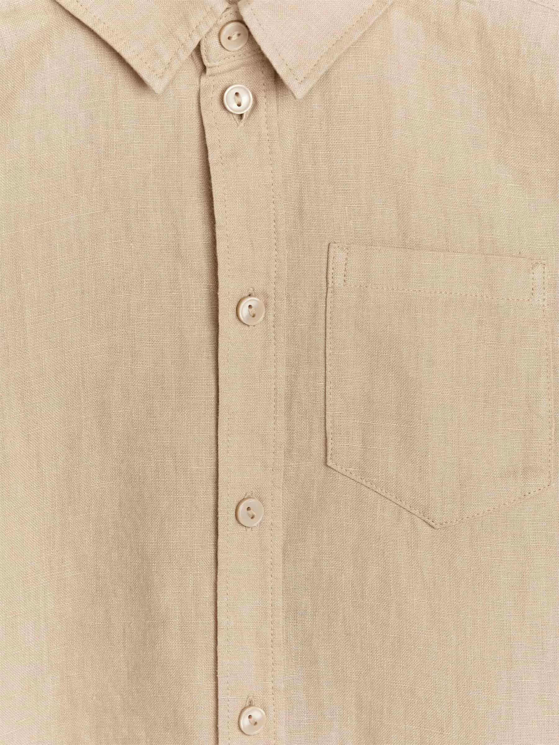 Linneskjorta för en normal passform. Stylad med vanlig krage, knäppning fram och en patchficka på bröstet. Manschetter med knäppning. Böjd fåll.