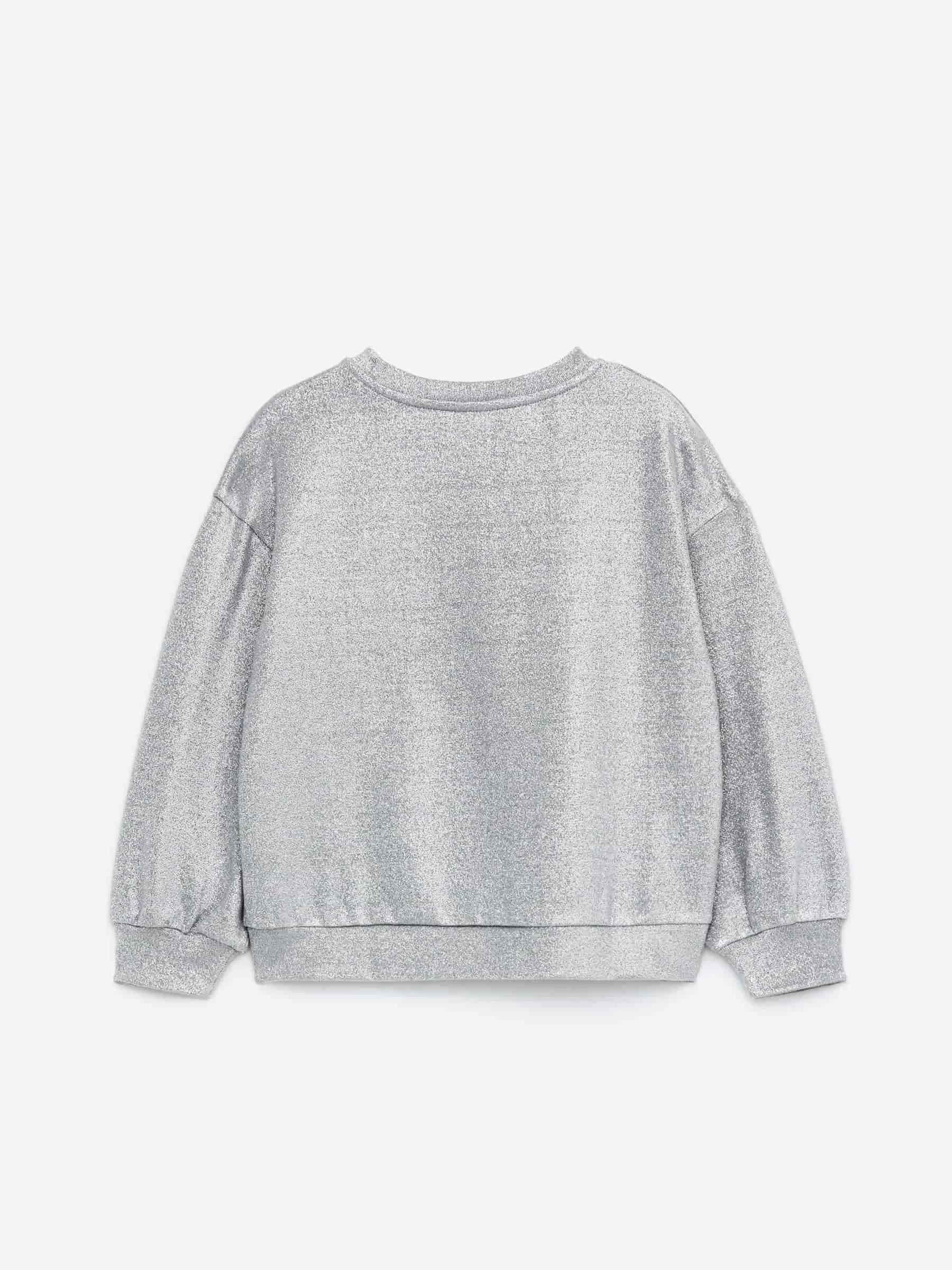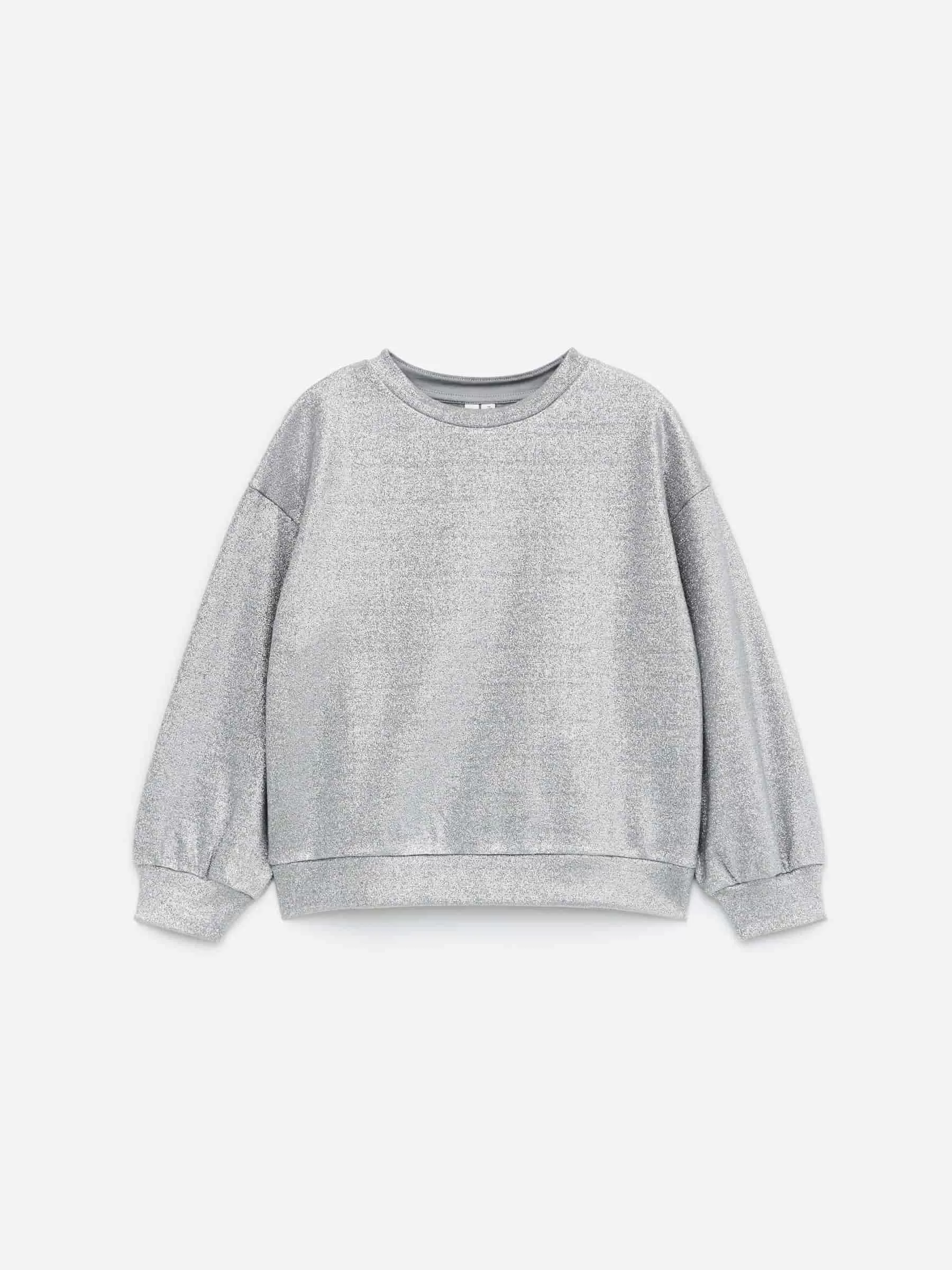 Tröja tillverkad av stretchig bomull och en metallisk lurextråd som skapar en vacker glittrig effekt. Designad med rund hals och ribbad kant. Avslappnad passform.