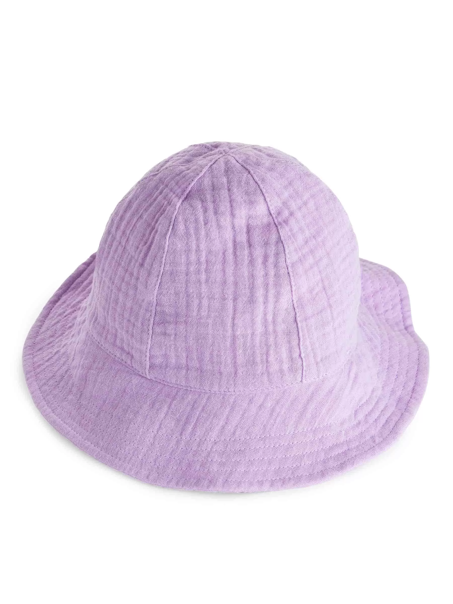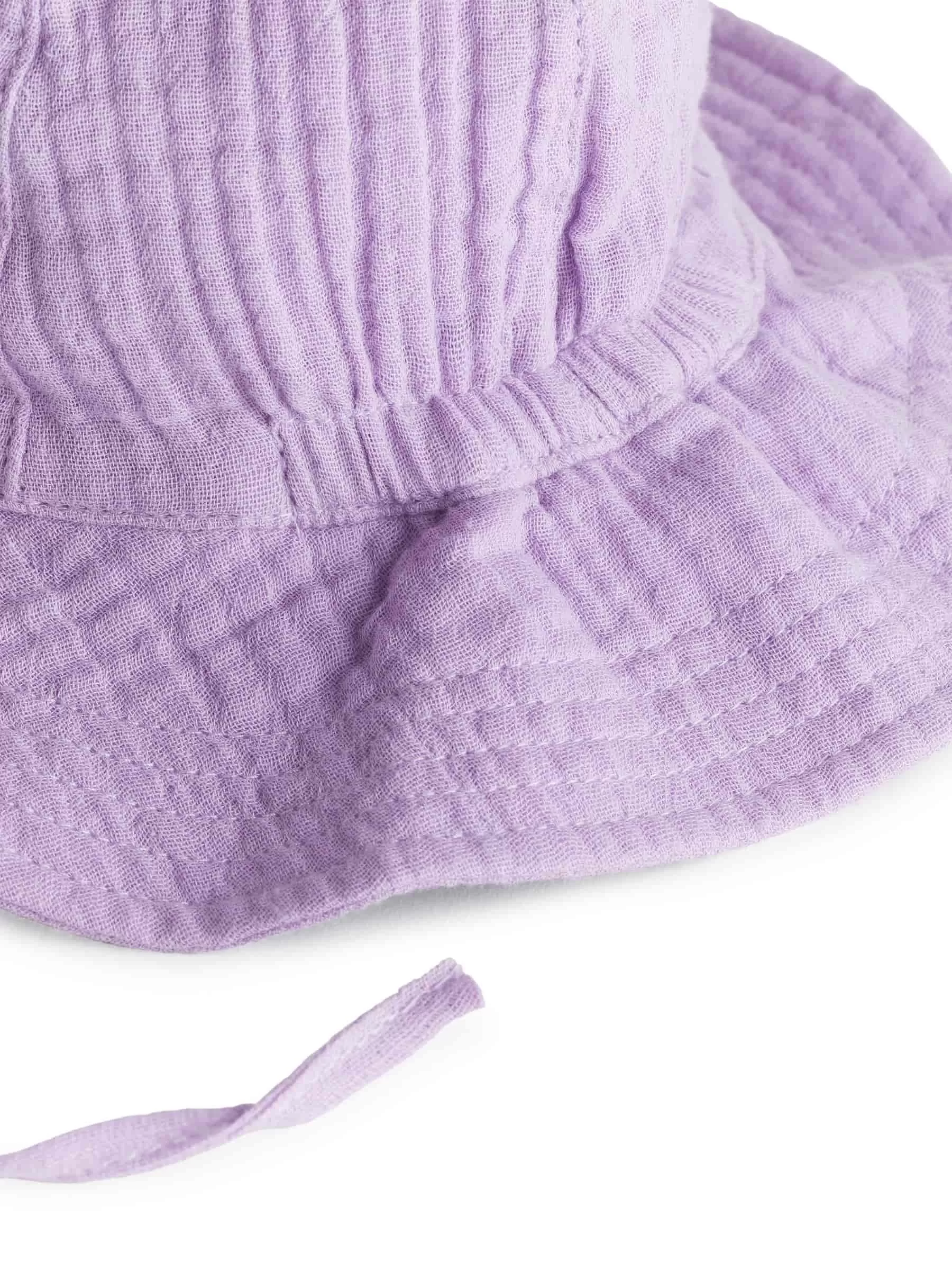Lätt solhatt gjord av bomull i muslinväv för en luftig känsla. Stylad med två snören som ska knytas under hakan för att hålla hatten på plats. Med en bred brätte och fodrad interiör skuggar den ansikte, huvud och axlar från solen.
