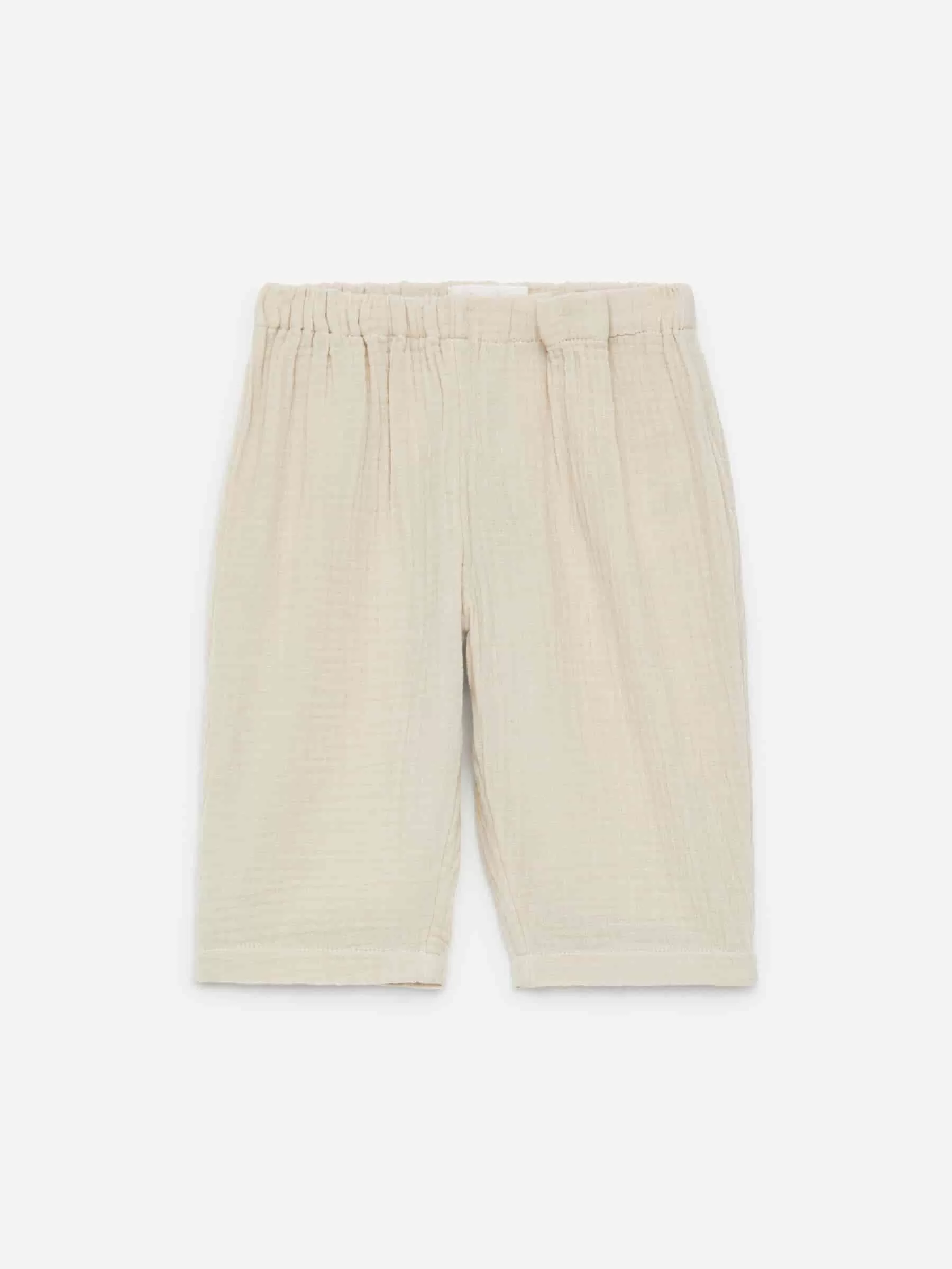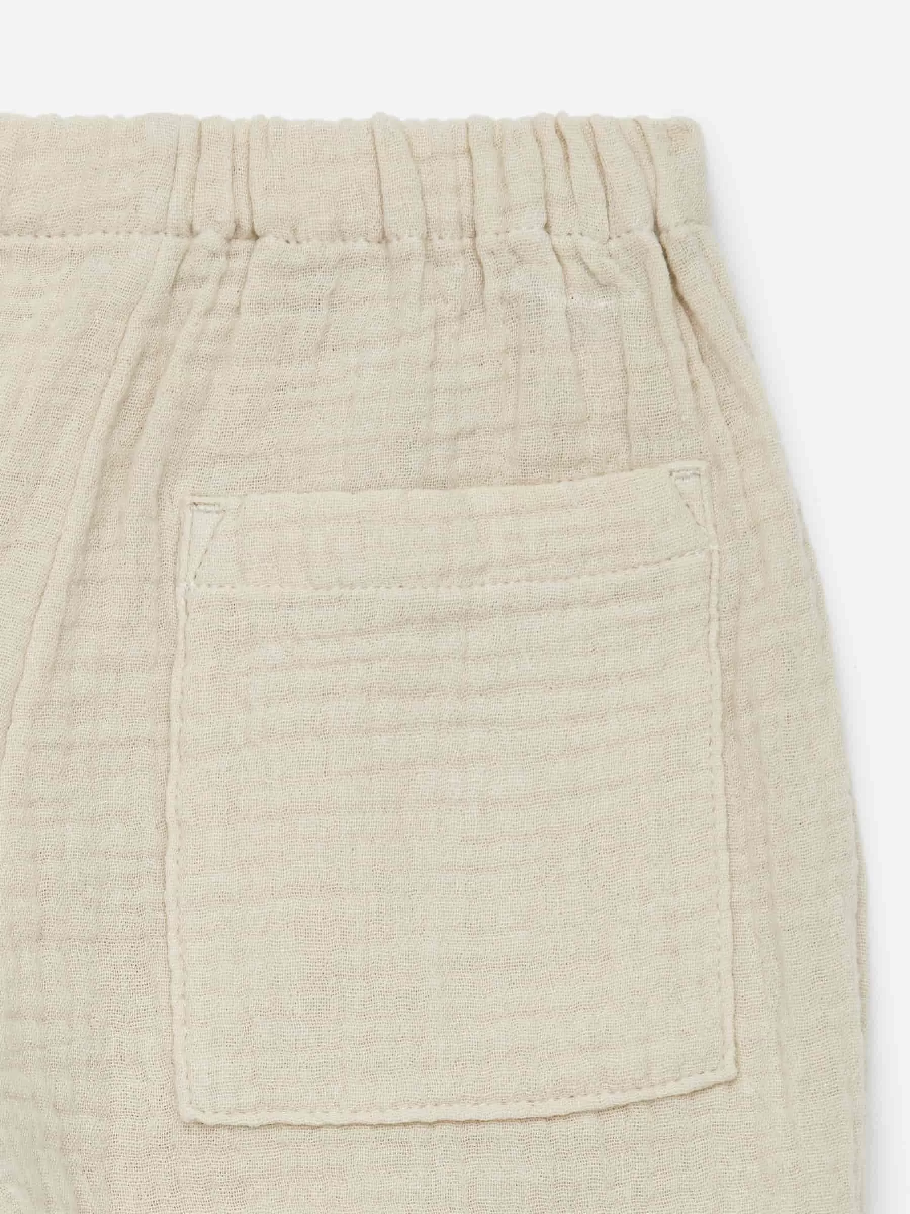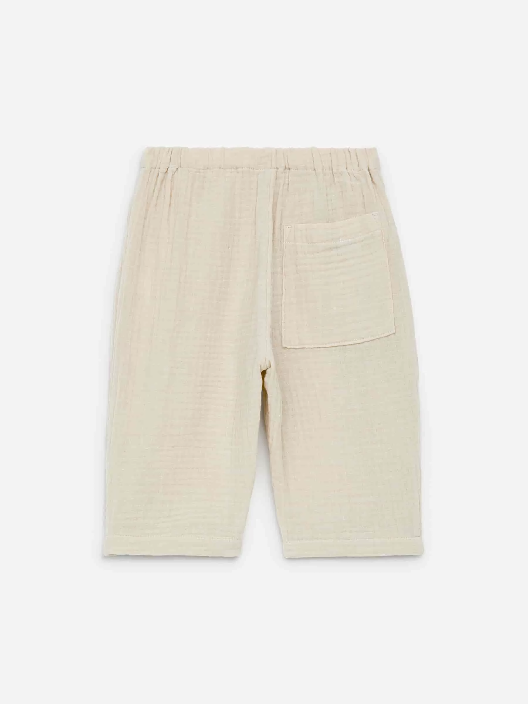 Lösa byxor i mjuk muslinväv gjord av bomull. Designad med ett justerbart midjeband och en enda bakficka.