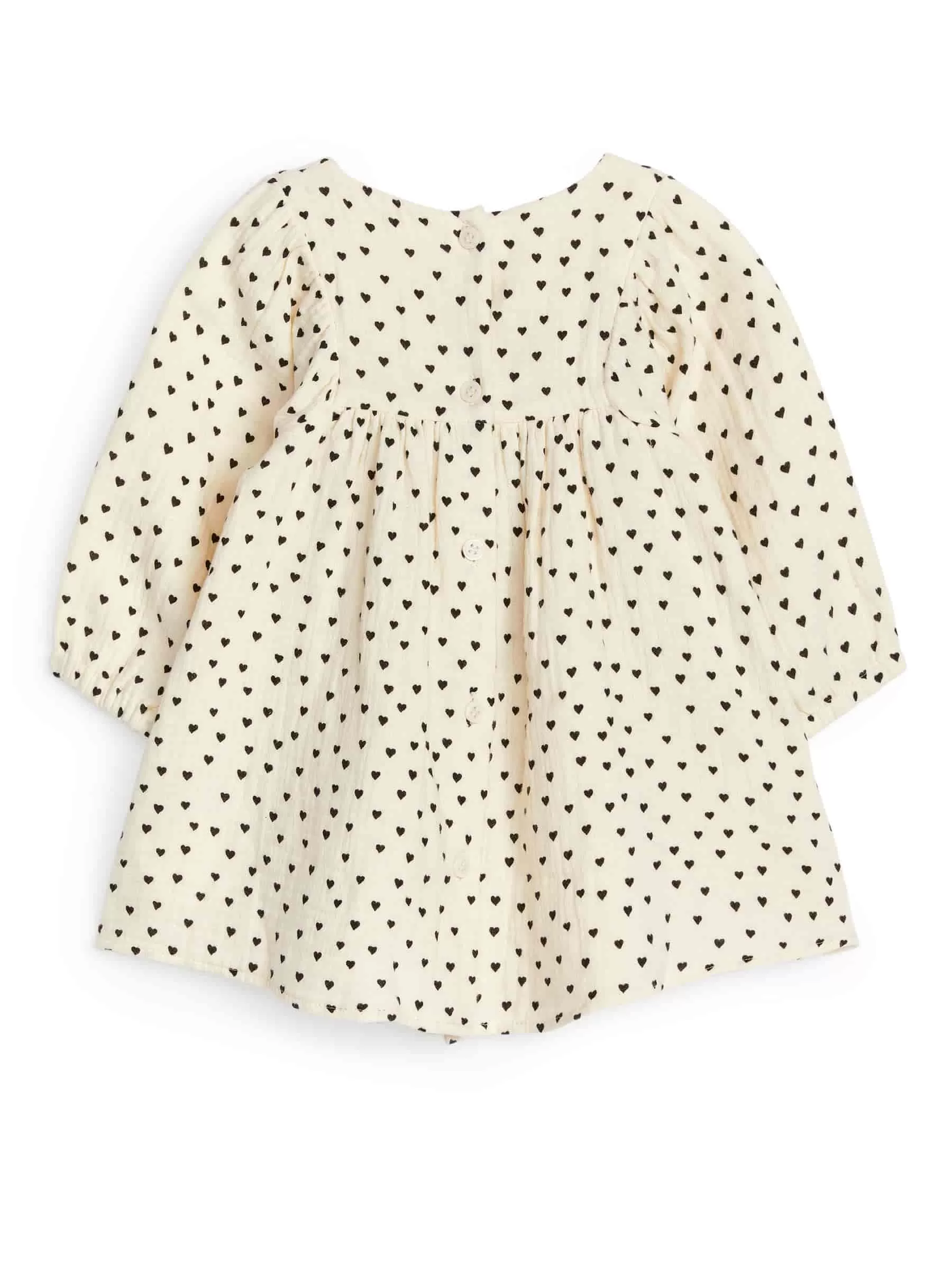 Långärmad klänning gjord av mjuk bomullsmuslin med en taktil textur. En oversized stil med knappstängning mitt bak och puffiga ärmar med resår i avsluten.
