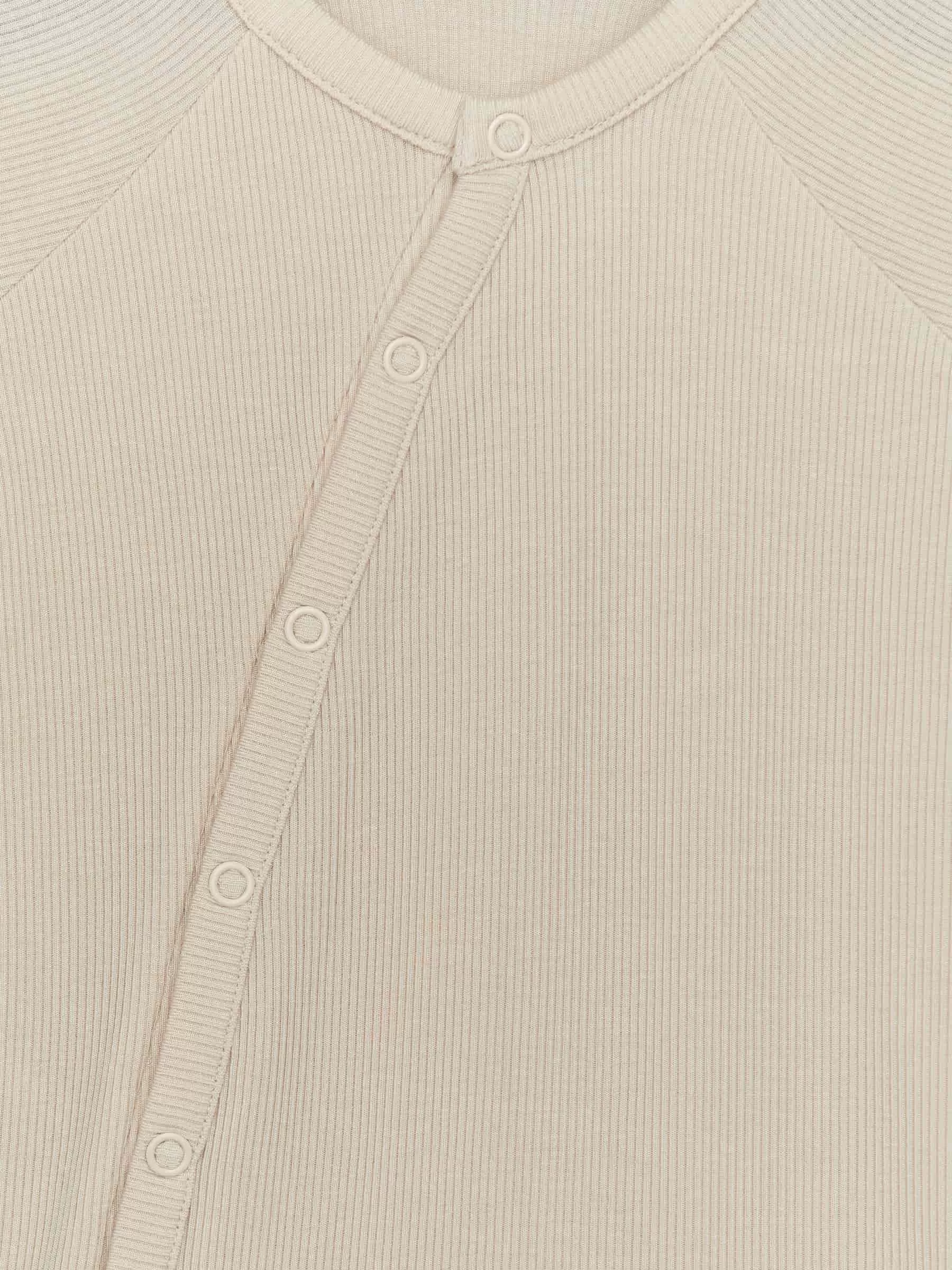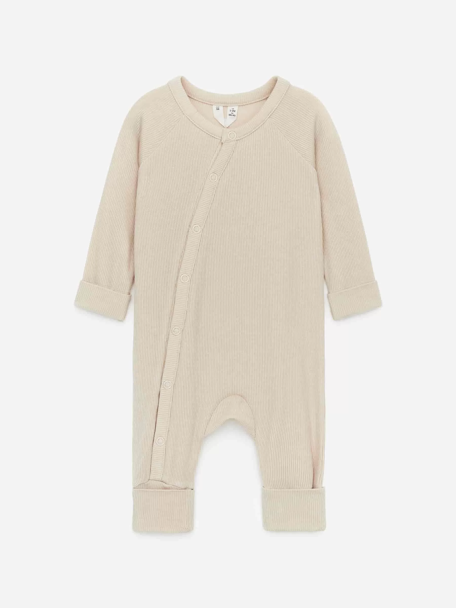 Långärmad pyjamas för det nyfödda barnet. Sydd av en ultramjuk och lätt ribbad jersey av lyocell och elastan för stretch. Manschetter är vikbara över händer och fötter. Tryckknappar framtill, placerade diagonalt för enkel påklädning och byte.