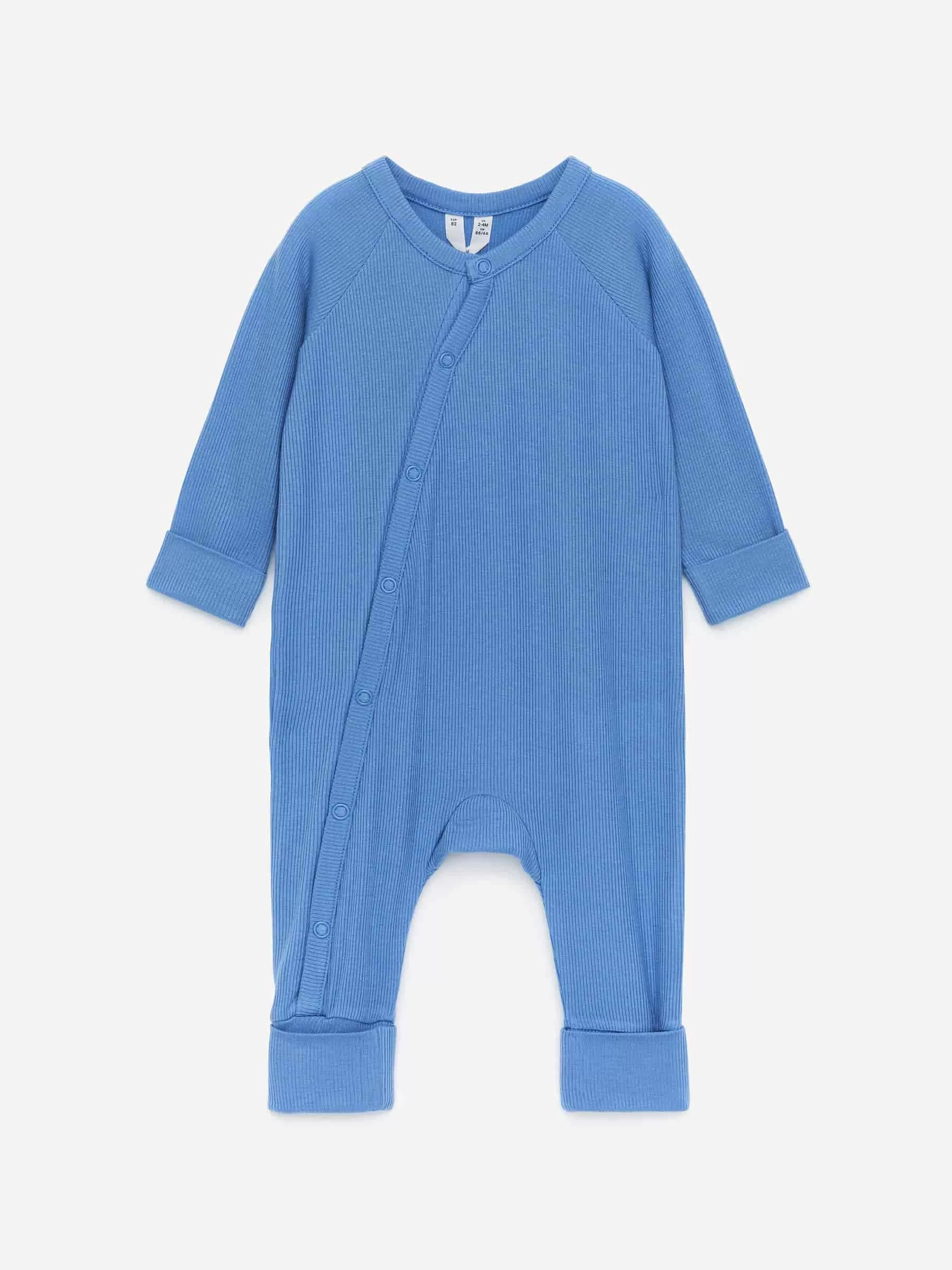 Långärmad pyjamas för det nyfödda barnet. Sydd av en ultramjuk och lätt ribbad jersey av lyocell och elastan för stretch. Manschetter är vikbara över händer och fötter. Tryckknappar framtill, placerade diagonalt för enkel påklädning och byte.