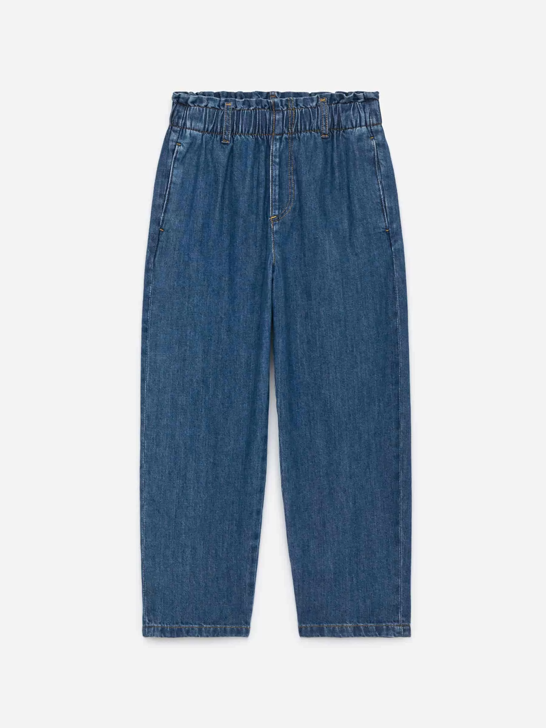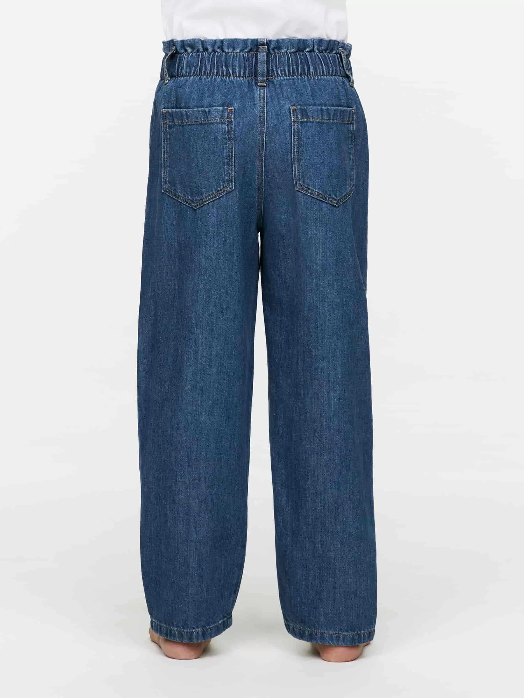Byxor med tunna ben och paperbag midja med justerbara resårer. Fickor fram och bak och falsk gylf.