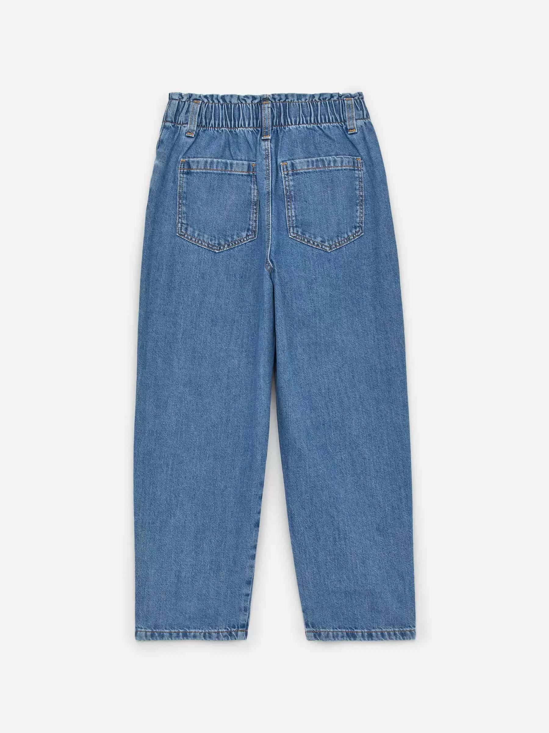 Denimbyxa med papperspåse i midjan med resår inuti linningen. En klassisk femficksmodell med medelhög midja och lätt avsmalnande ben.