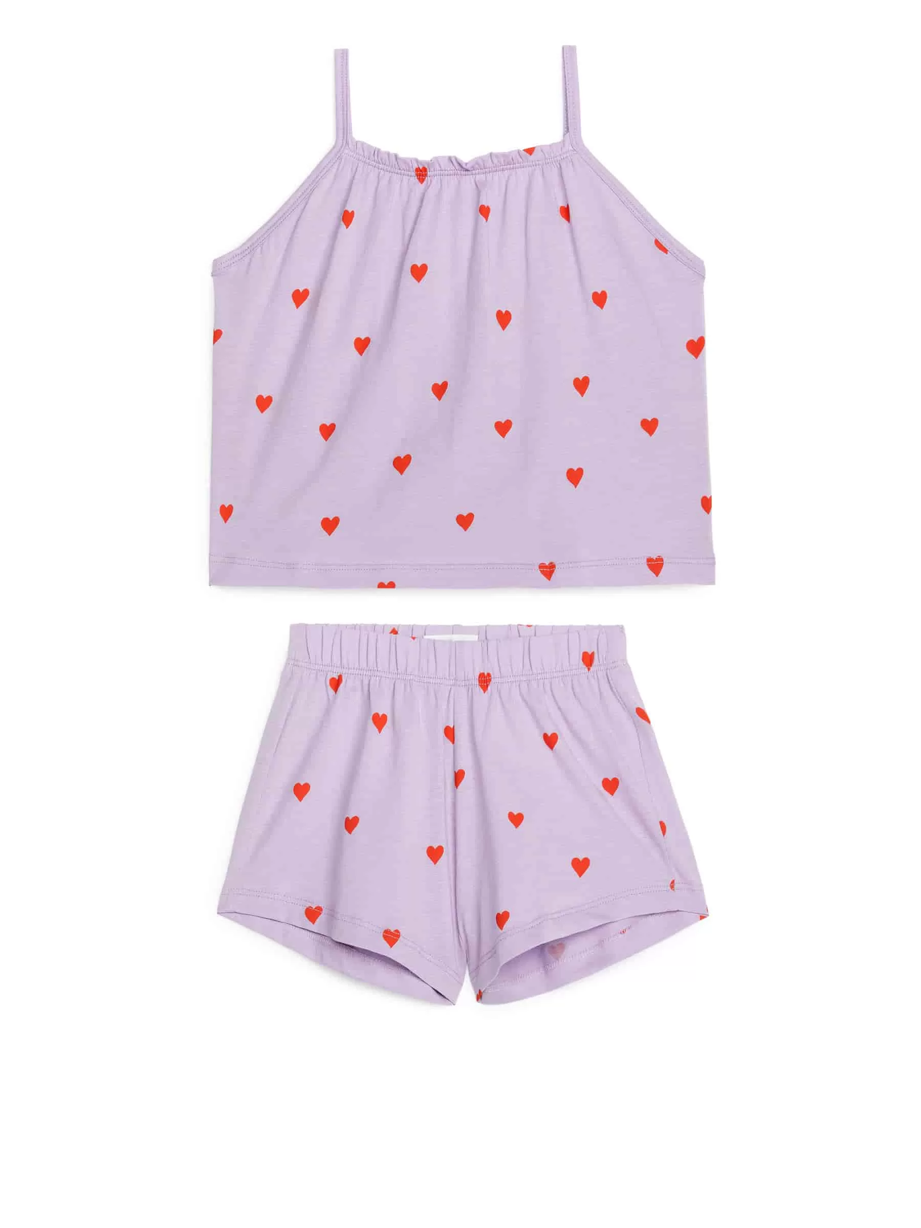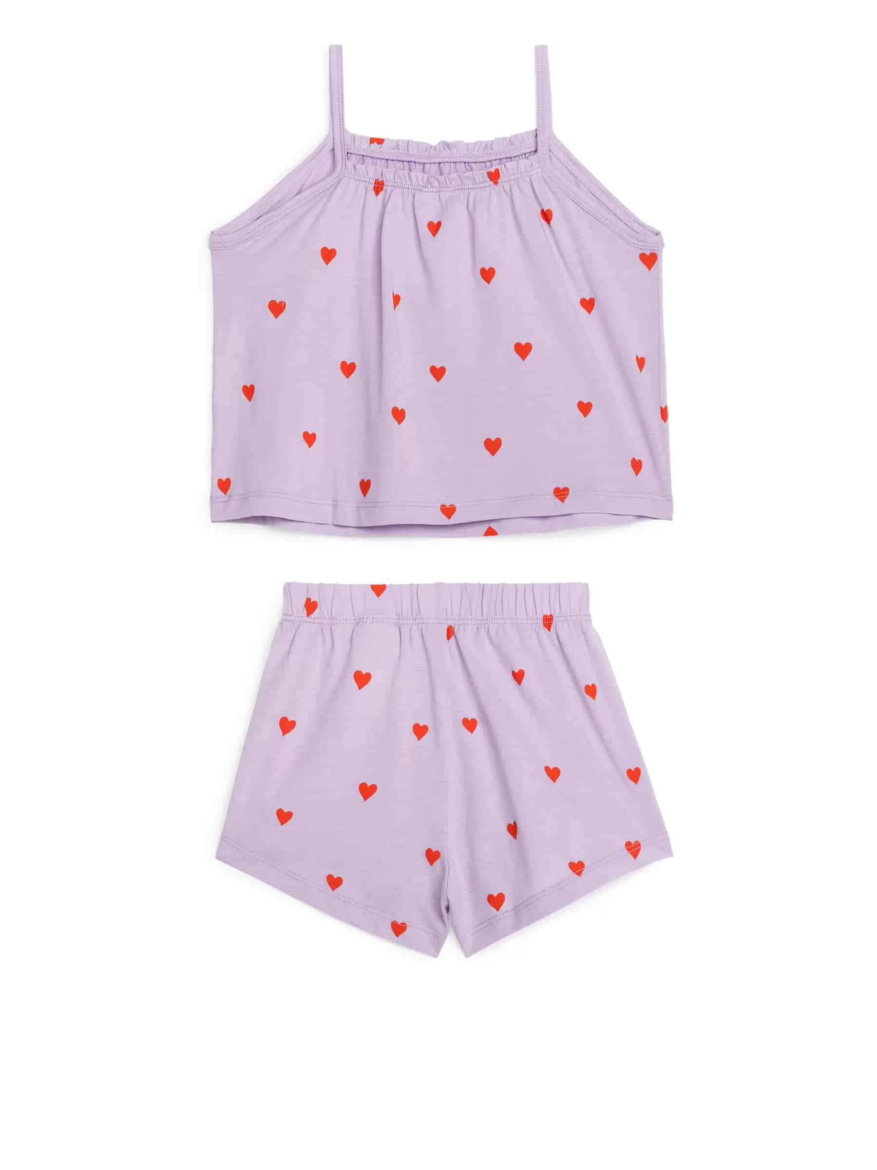 Pyjamasset i två delar av bomull. Remtopp med rynkad detalj vid halsringning fram och shorts med resår i midjan.