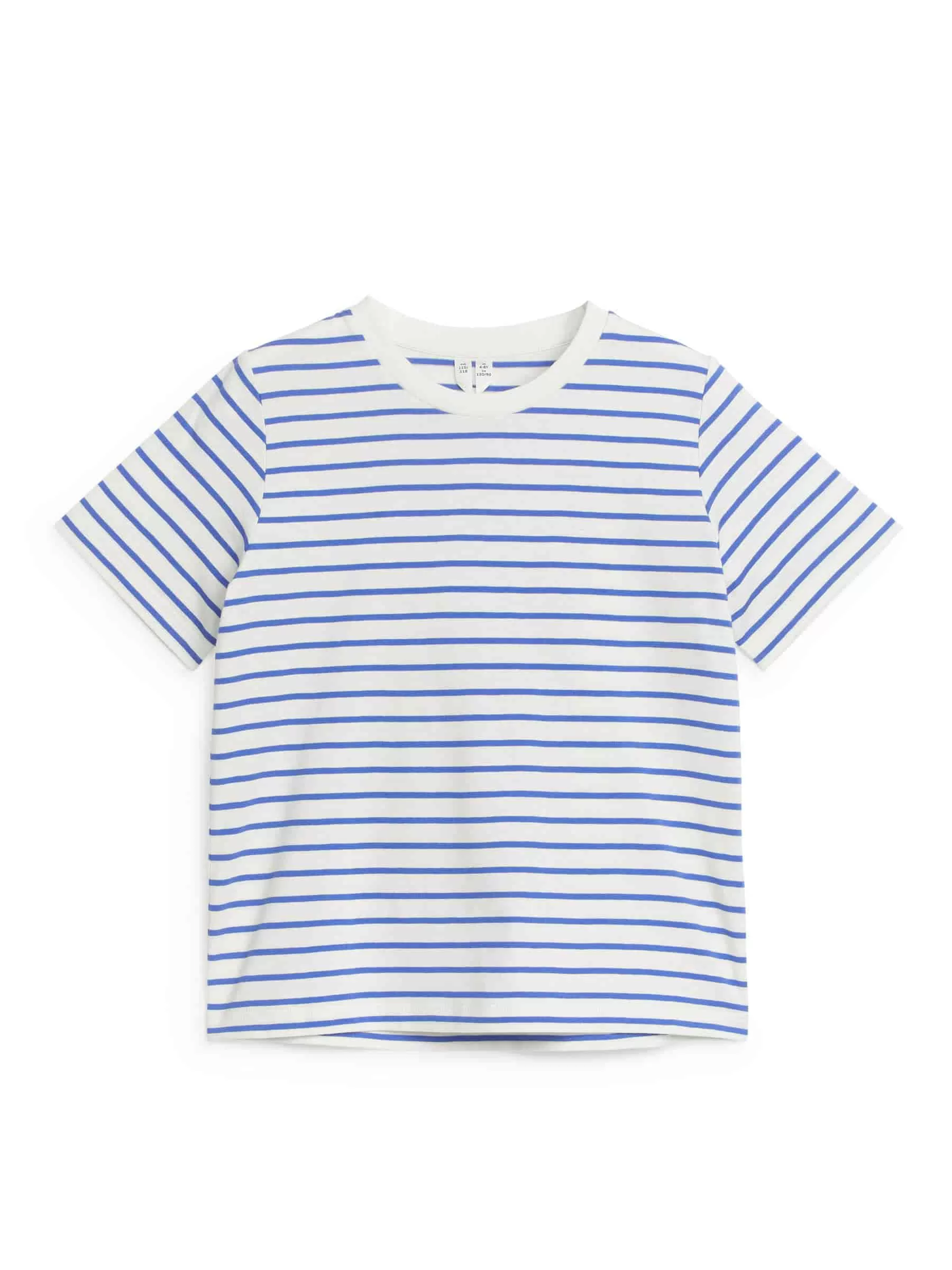 Boxig T-shirt i slät bomullsjersey. Den har ett garnfärgat randmönster och är detaljerad med en ribbad kant runt den runda halsen.