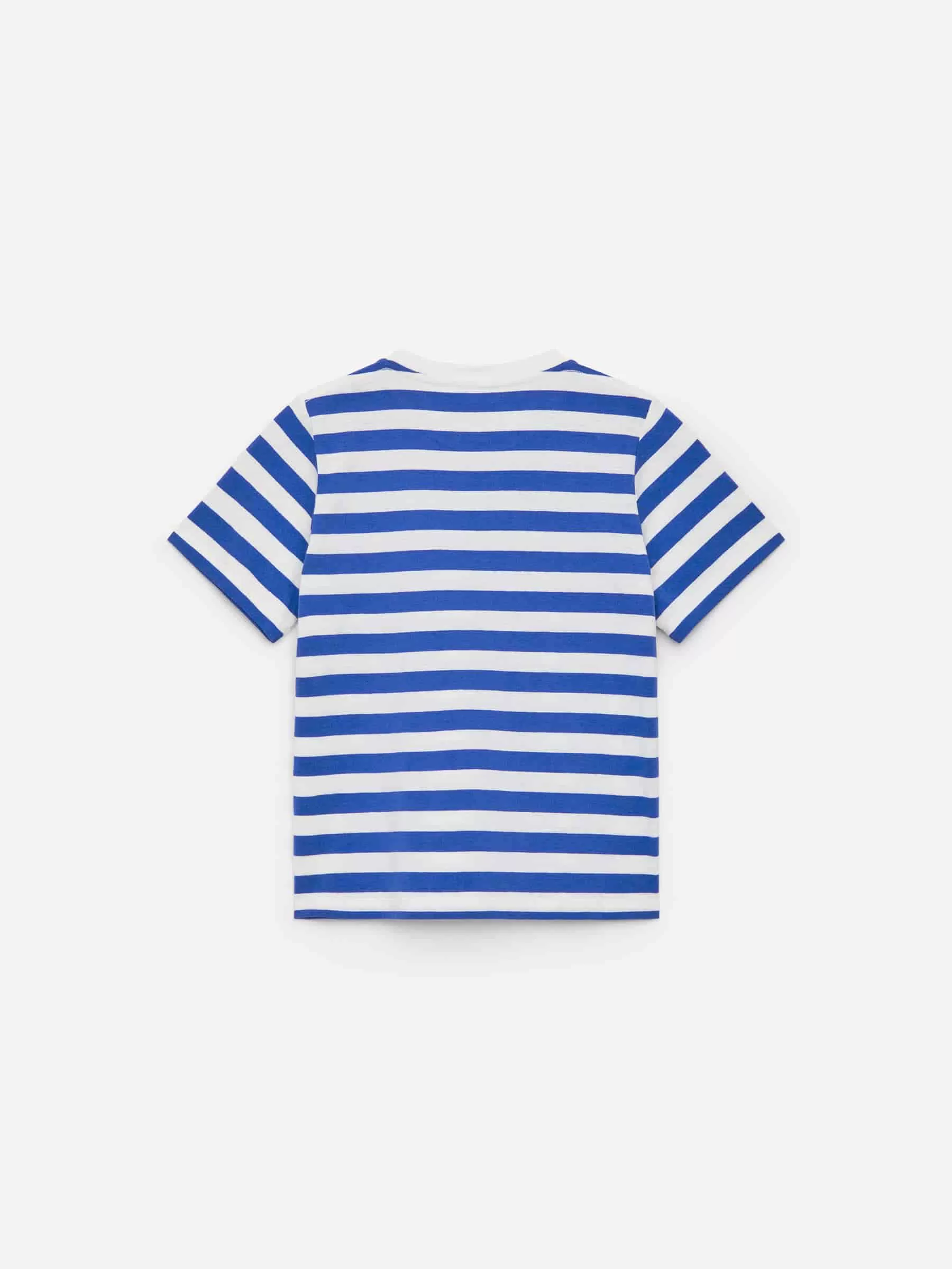Boxig T-shirt i slät bomullsjersey. Den har ett garnfärgat randmönster och är detaljerad med en ribbad kant runt den runda halsen.