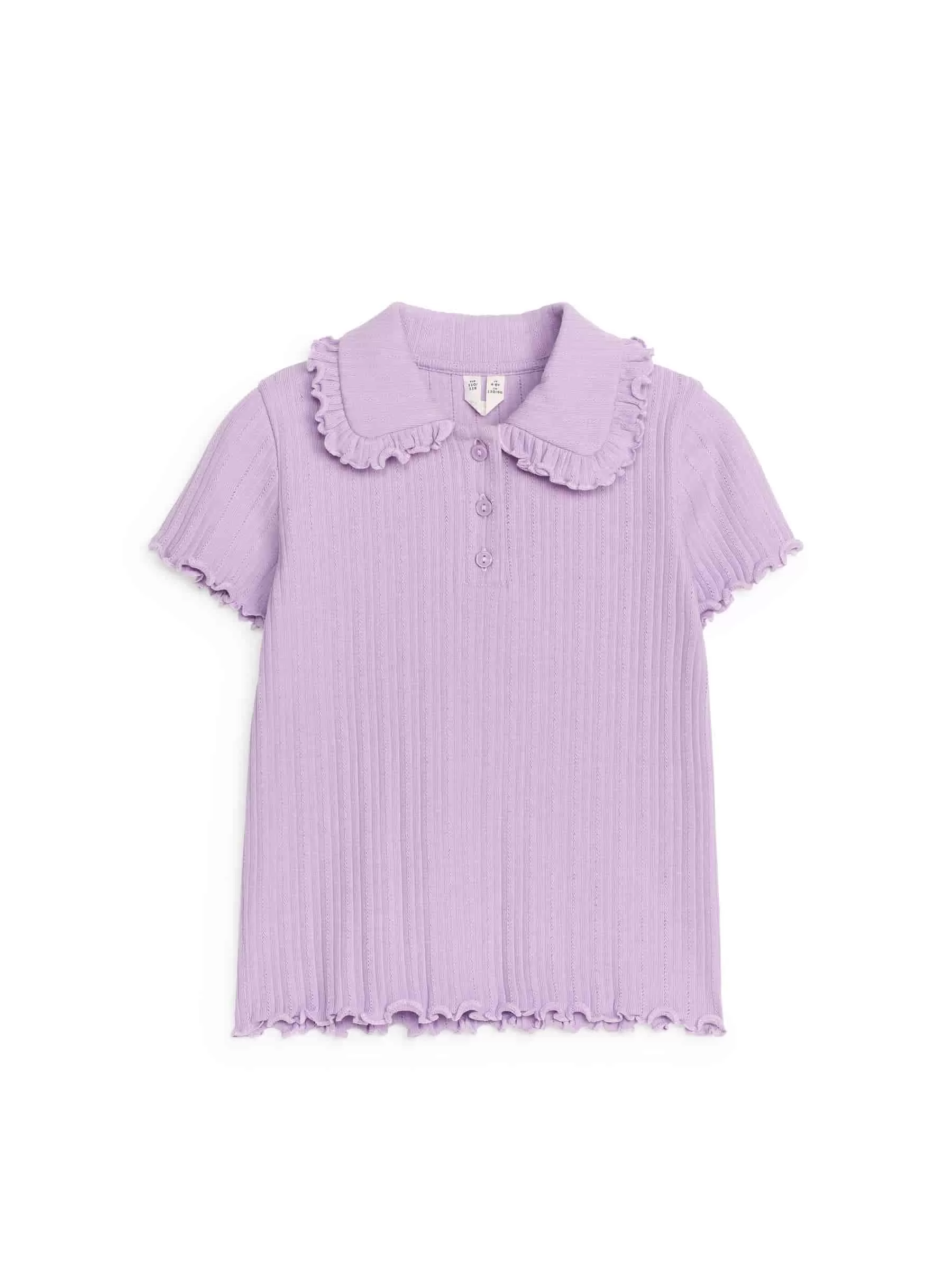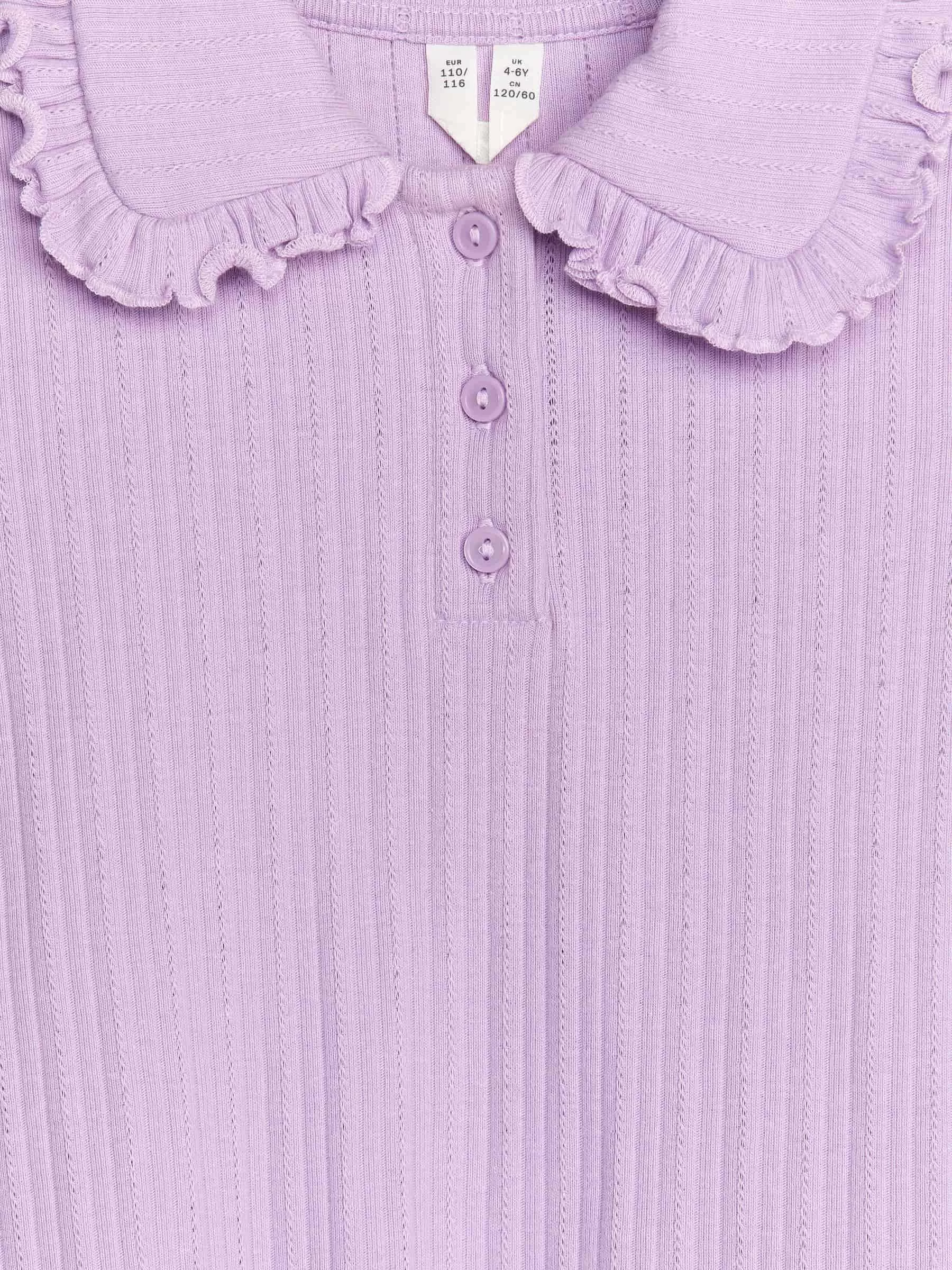 Kortärmad T-shirt gjord av ribbad jersey. Med en rund volangkrage med en halvknapp framtill och volangkanter.