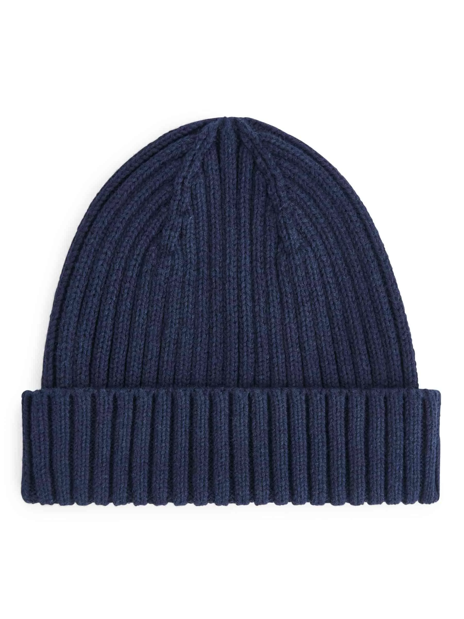 Mjuk och tjock bomullsmössa stickad i 2×2 resår, vikt brätte. En storlek.
