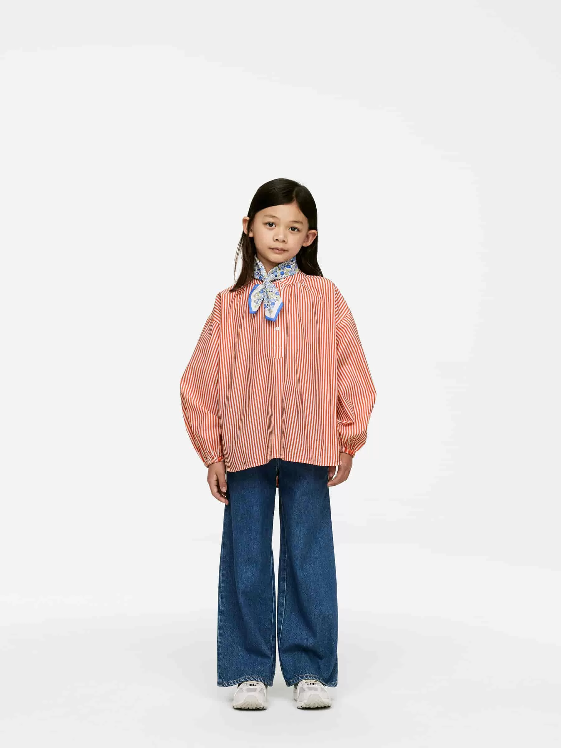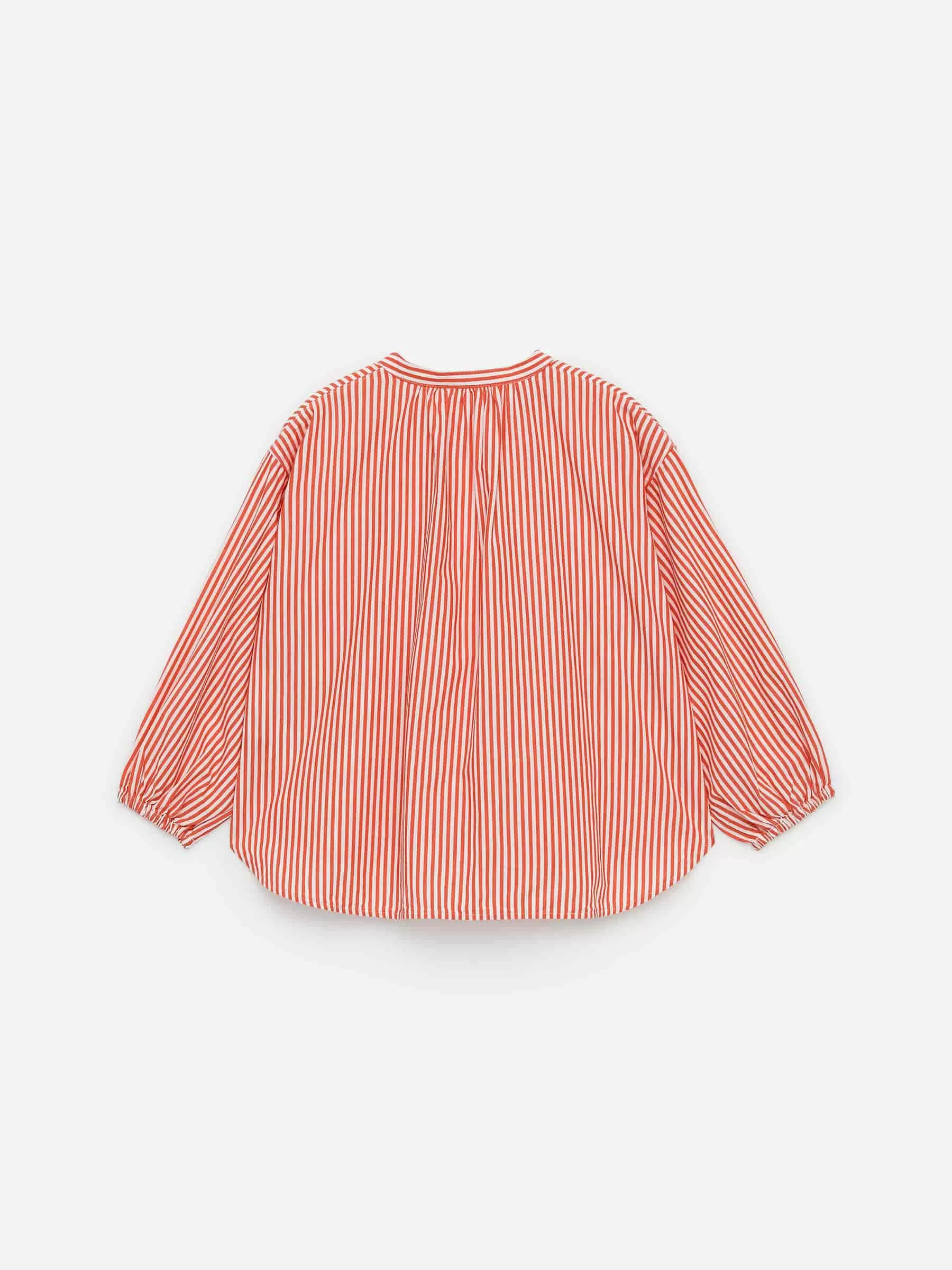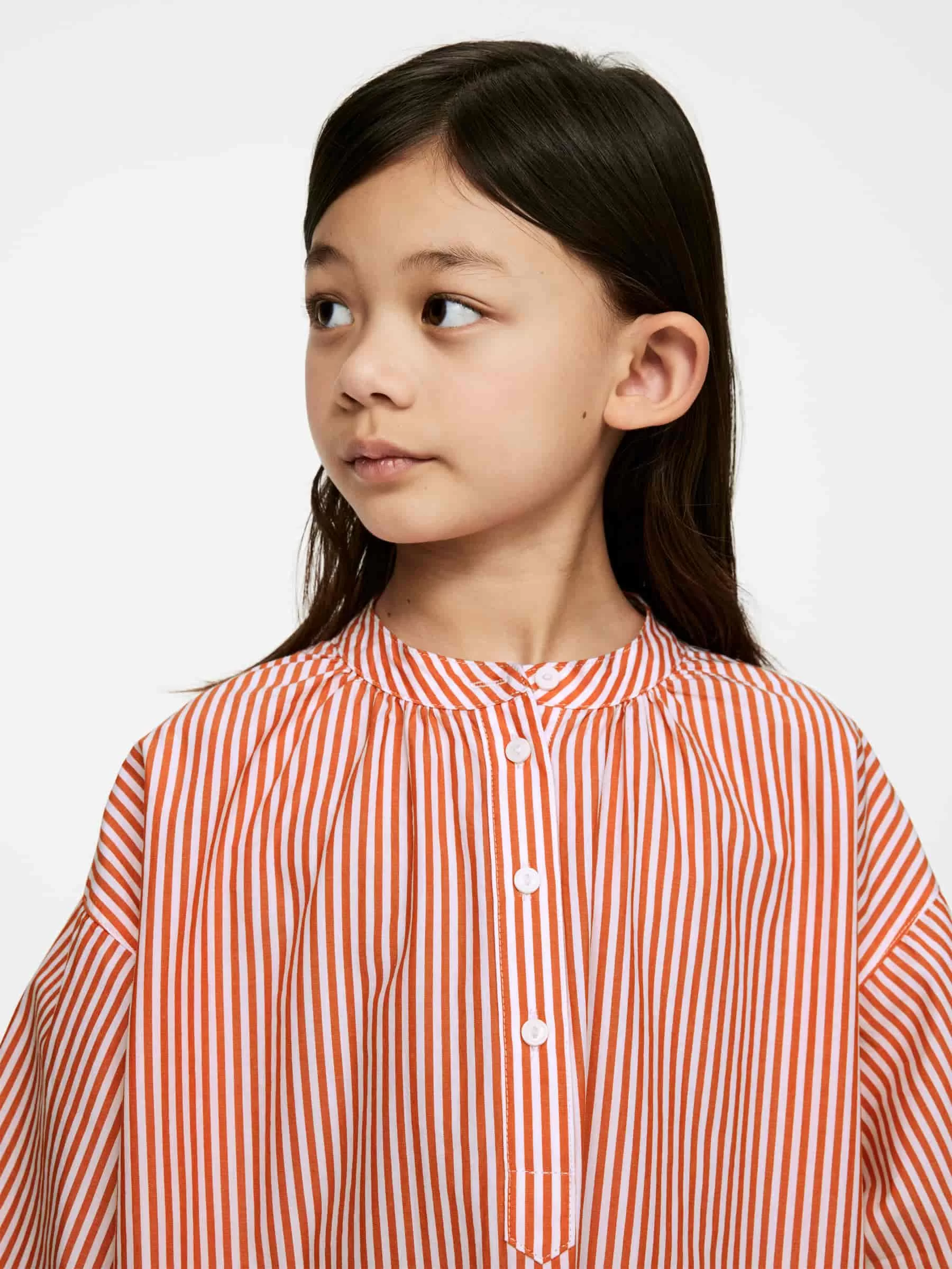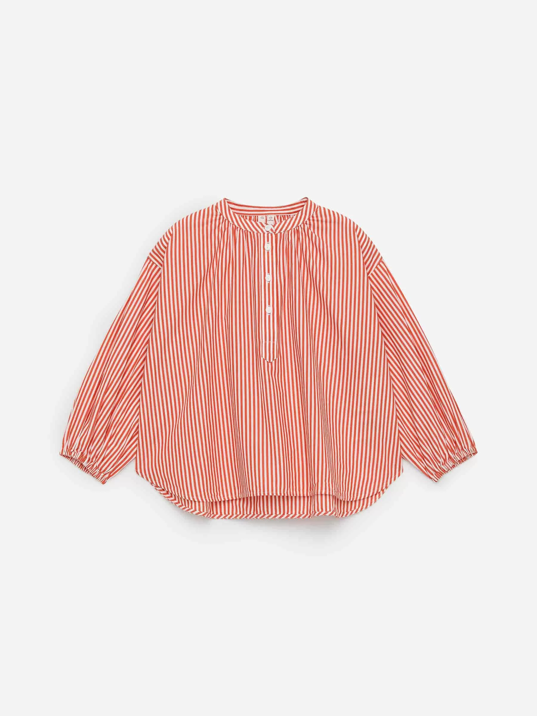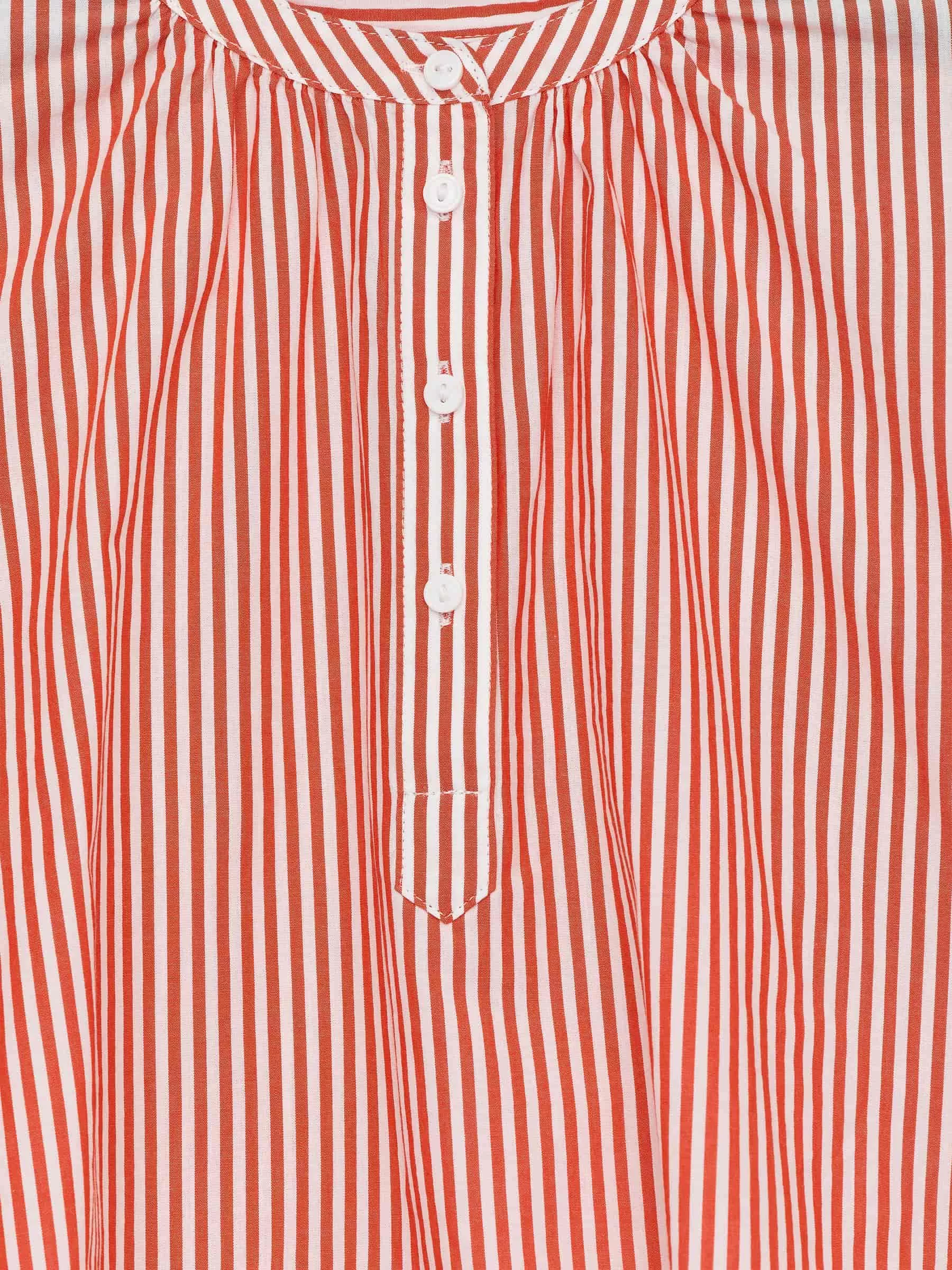 Blus med stående krage, halvknäppt knappslå och nedfällda axlar. Rynkor vid halsringning och ärmslut. Avslappnad passform.