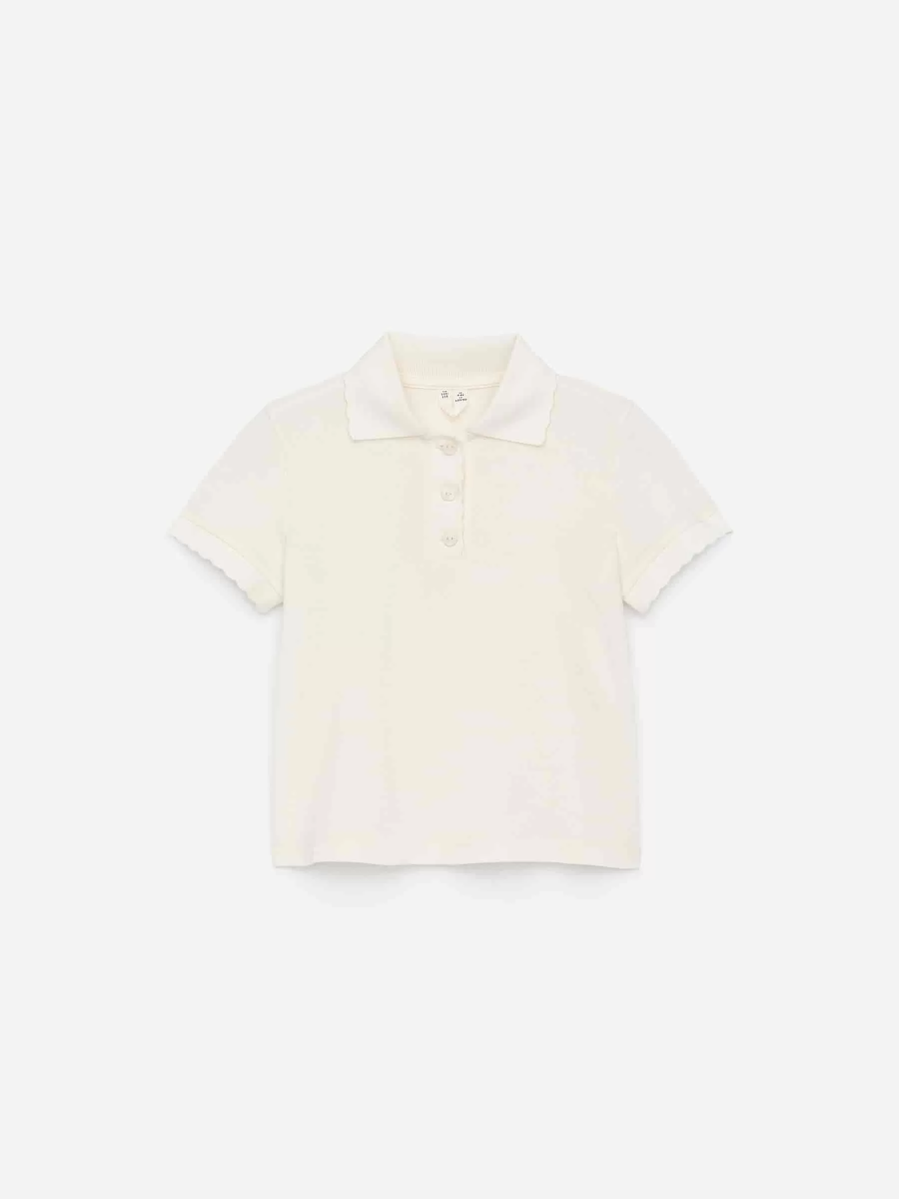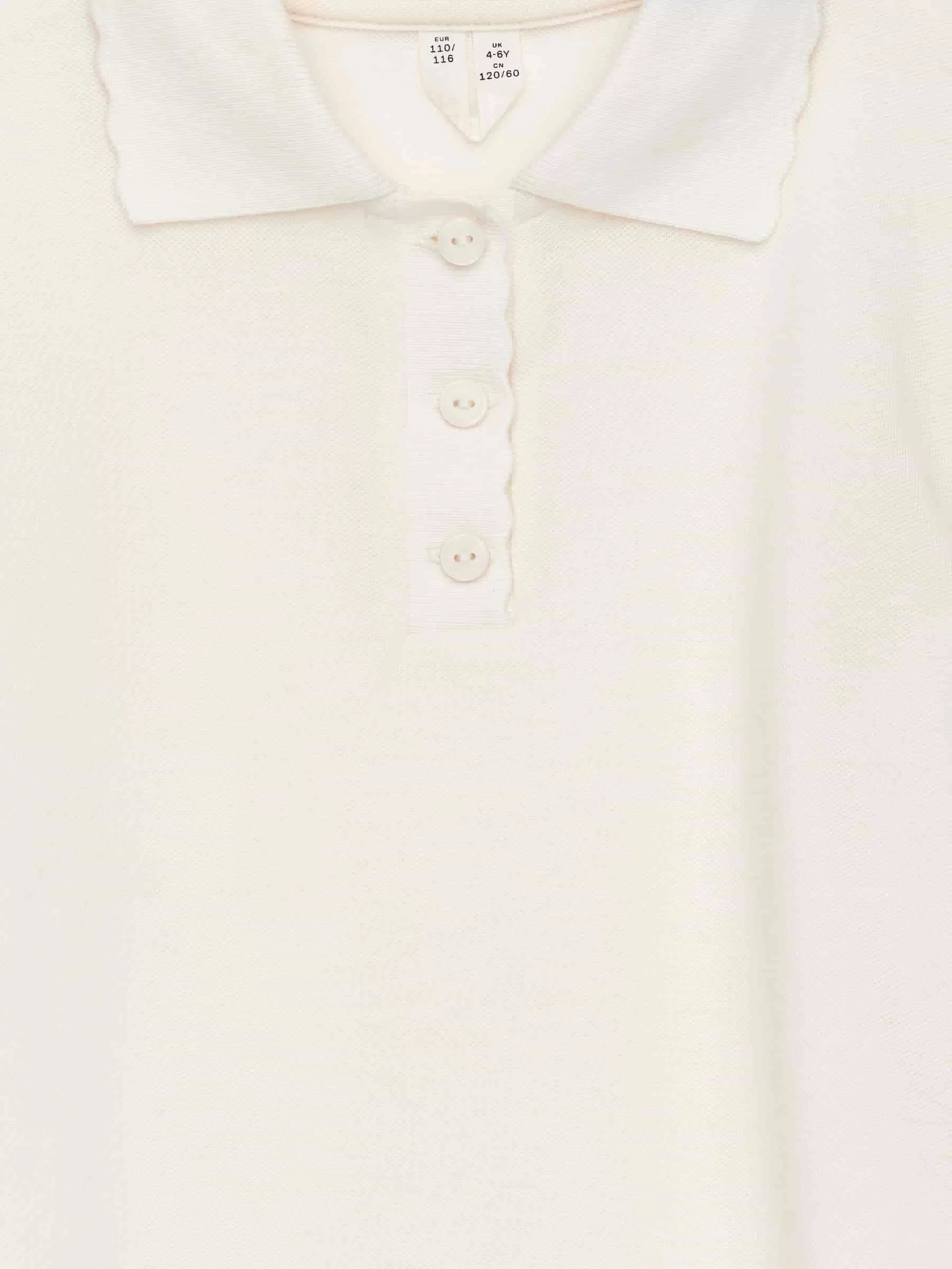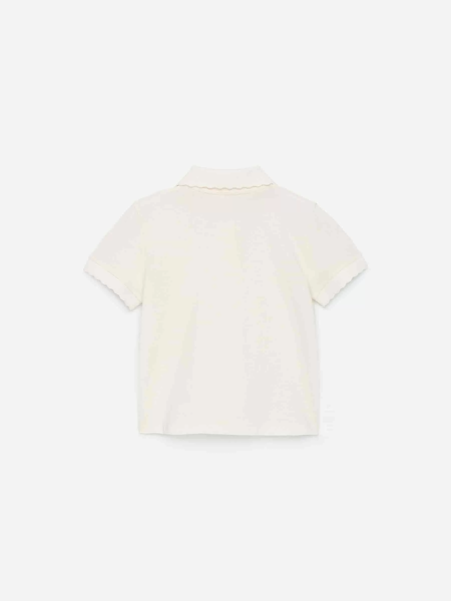Kortärmad pikétröja i bomullspiké. Stylad med pilkantsdetaljer vid den ribbstickade kragen och vid halvslået. Tre knappar.