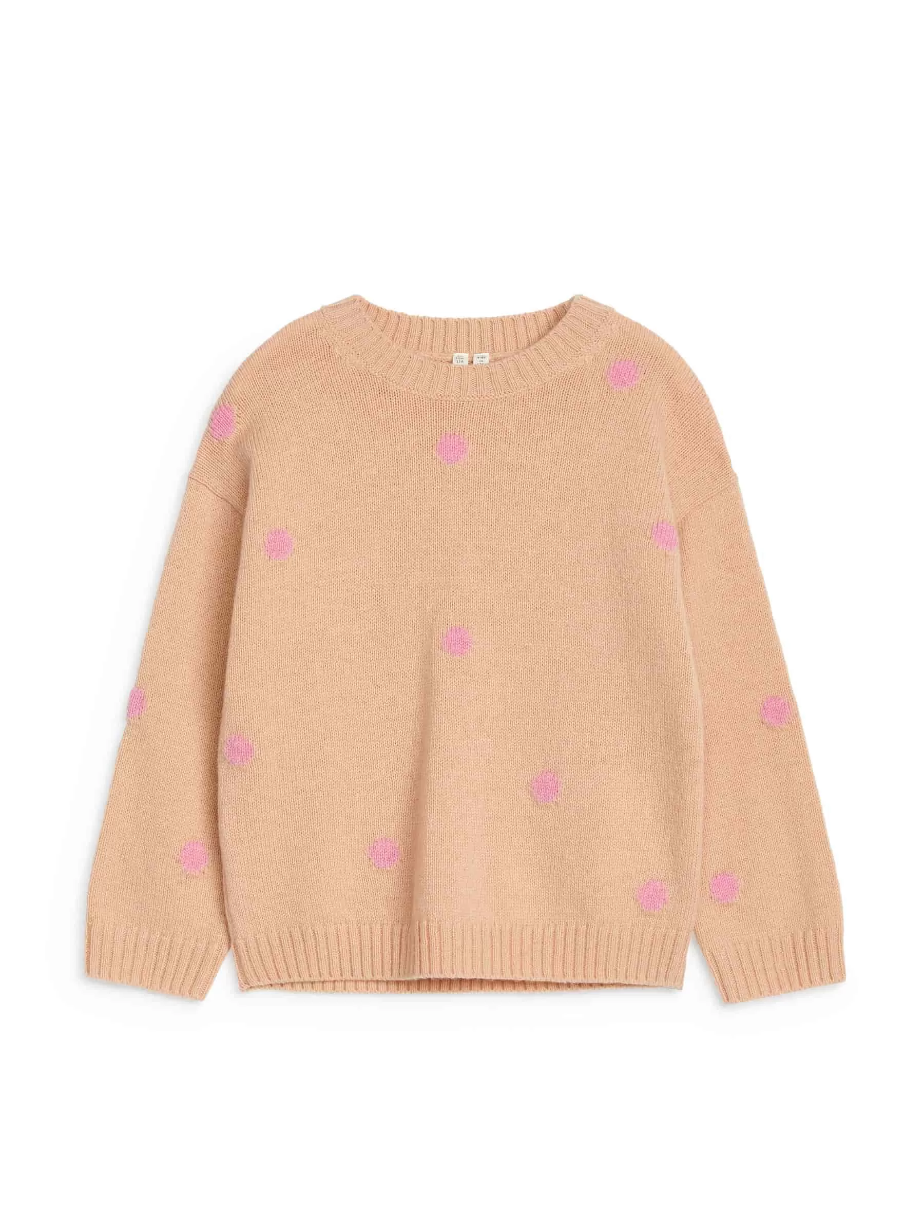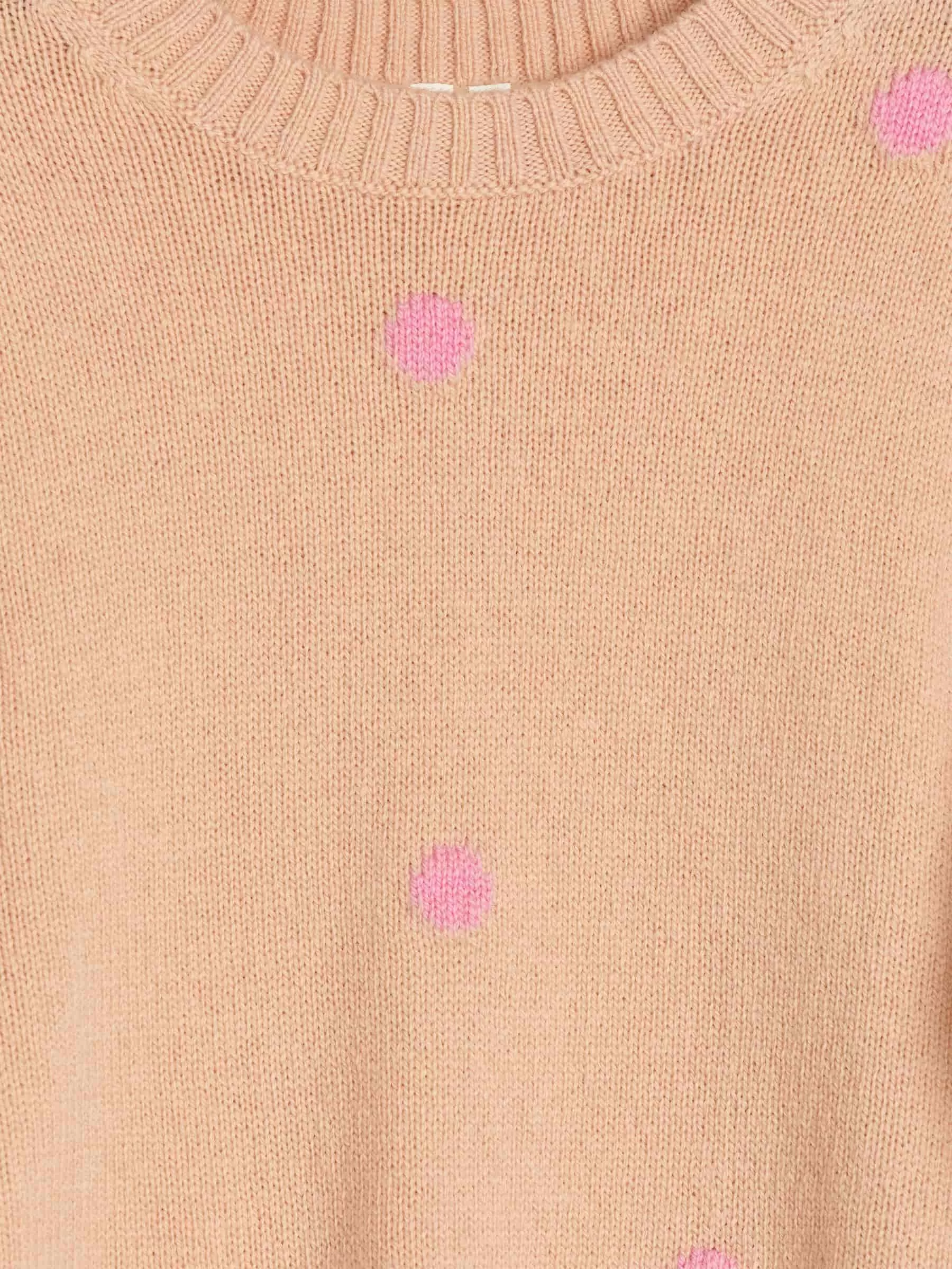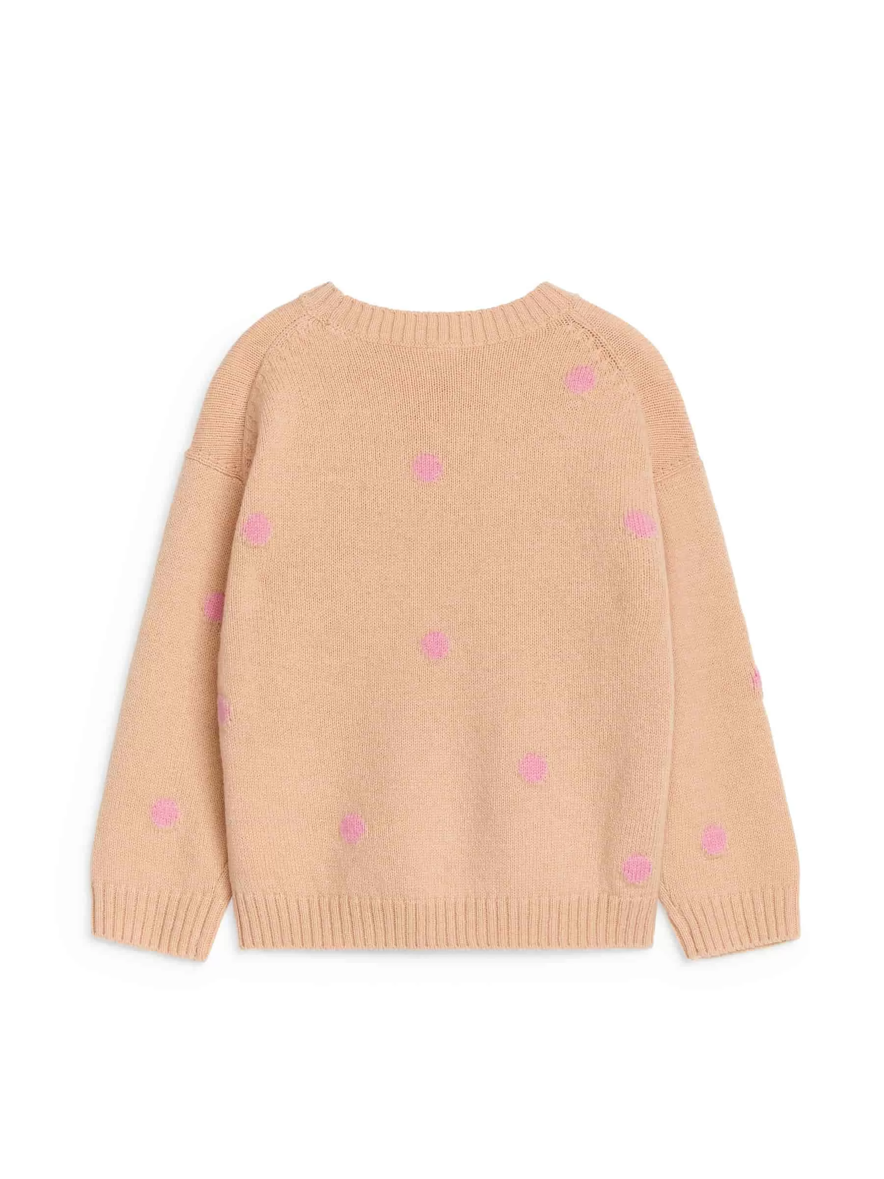 Ulltröja stickad i en halvkoftasöm med prickmönster. Ribbstickade kantband runt halsen, vid ärmslut och nedtill. Bygeln innehåller 100 % RWS-ull, certifierad av kontrollförbundet 815571. Produkter certifierade enligt Responsible Wool Standard (RWS) innehåller ullfiber från gårdar som är oberoende certifierade enligt kraven på djurskydd och markförvaltning.