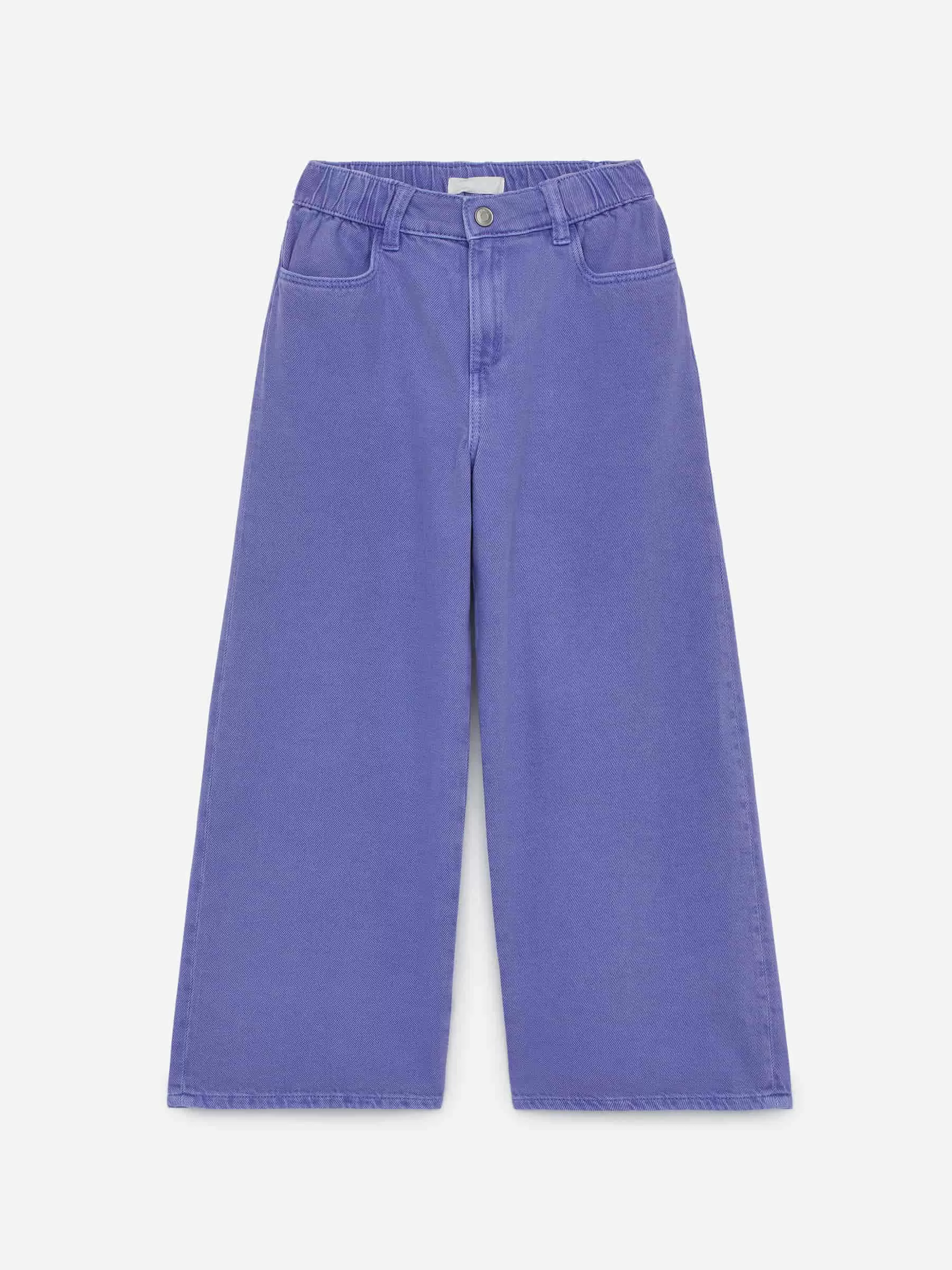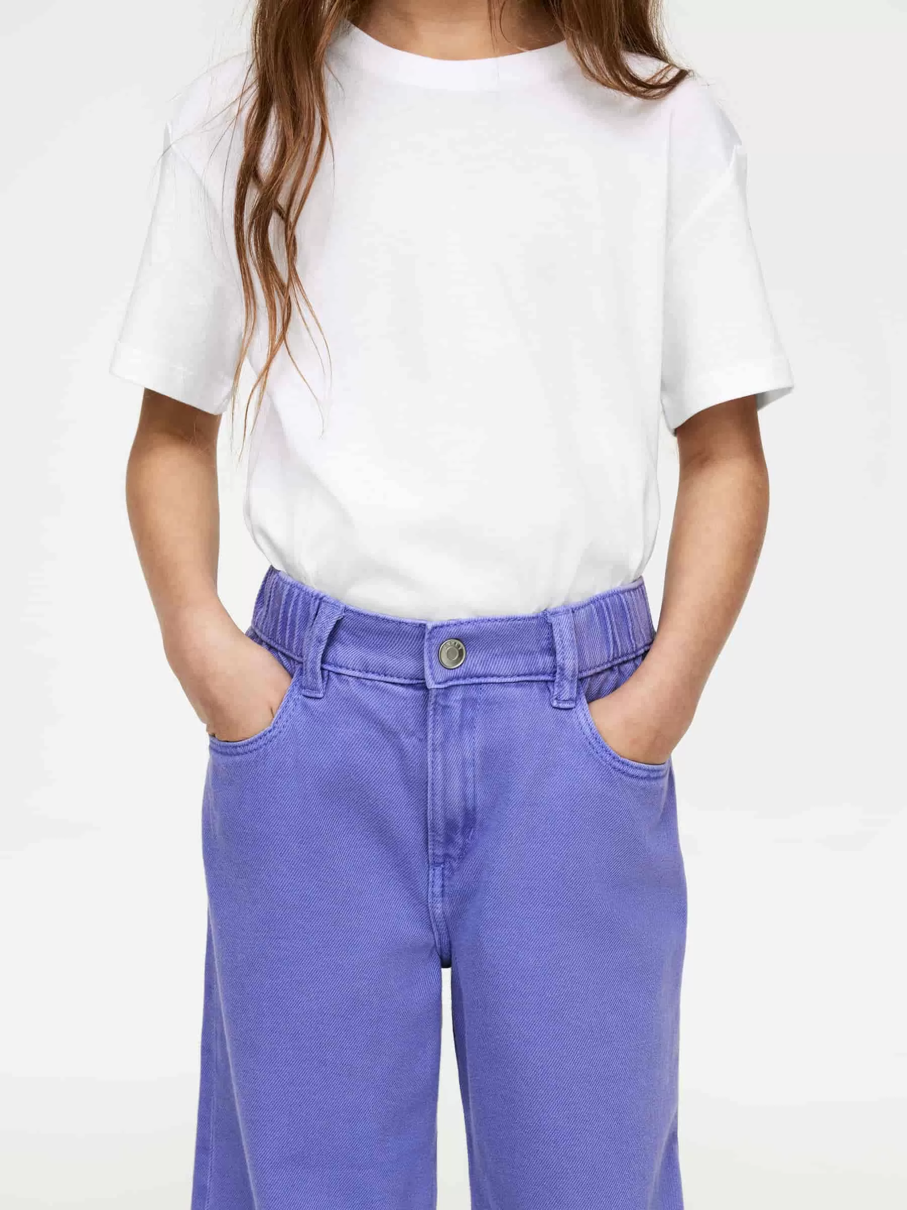 Vida jeans i tvättat bomullstyg. Justerbara resårer i midjan. Fickor fram och bak samt bälteshällor.