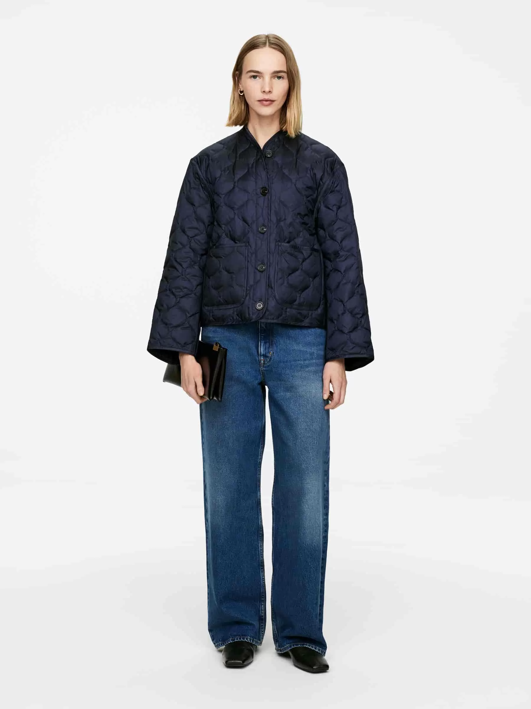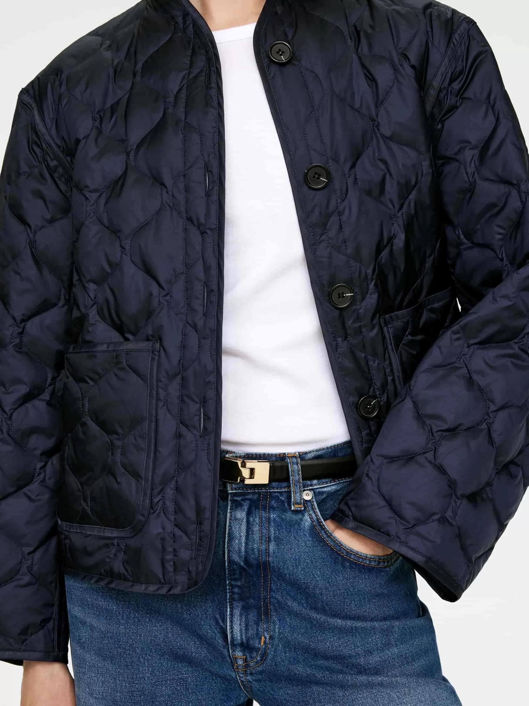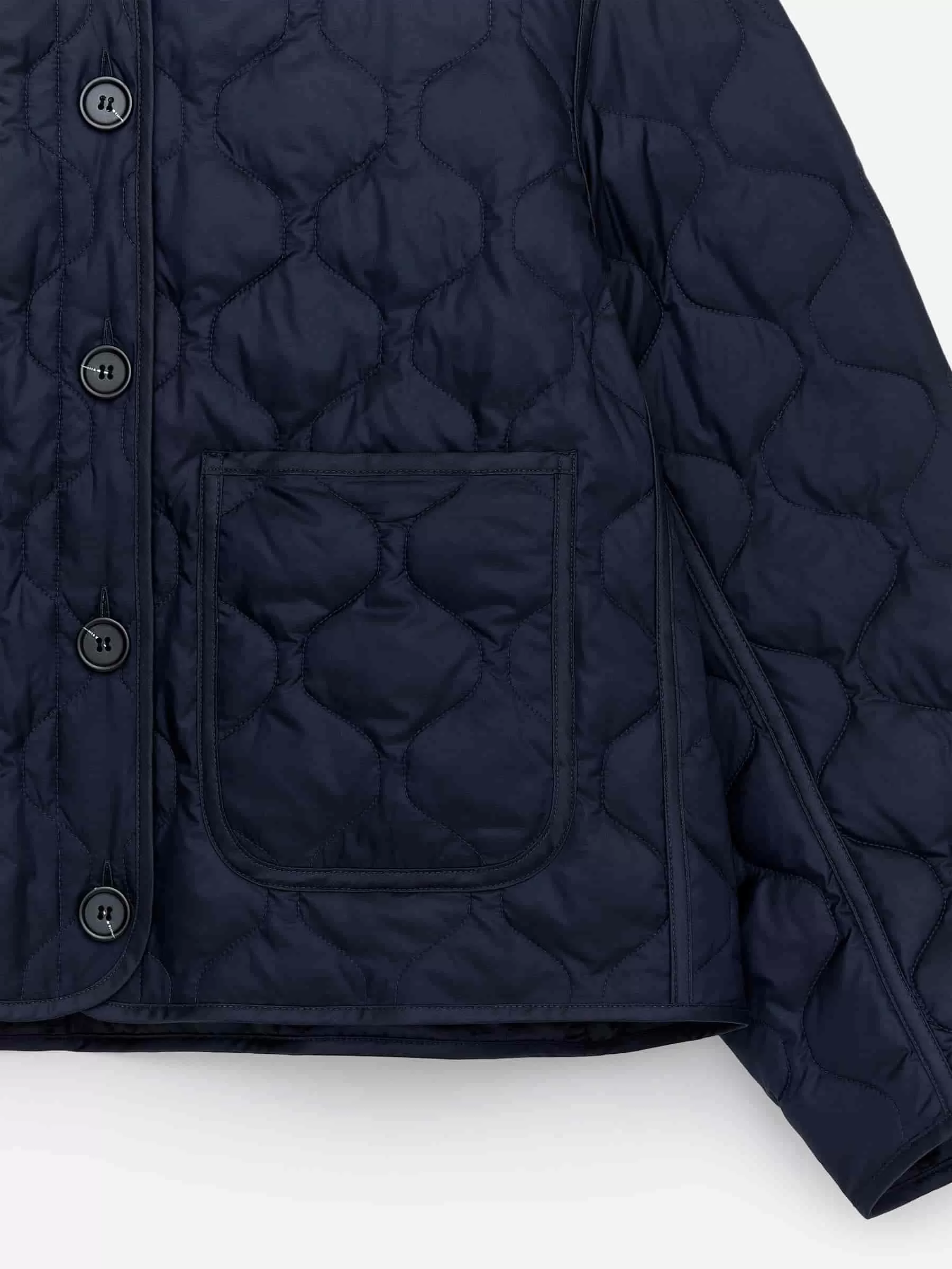 Quiltad linerjacka fylld med en blandning av dun och fjädrar. Patchfickor framtill och knäppning. En del av 2-i-1-serien, ett modulärt ytterplaggssystem som inkluderar skal och isolerande foder speciellt utformade för att knäppas ihop och bilda en helt vadderad kappa. Upcycled Down-produkterna är fyllda med återvunnet dun och fjädrar från Re:Down®. Dessa material, insamlade från använda textilier, tvättas och steriliseras vid höga temperaturer utan användning av kemikalier.
