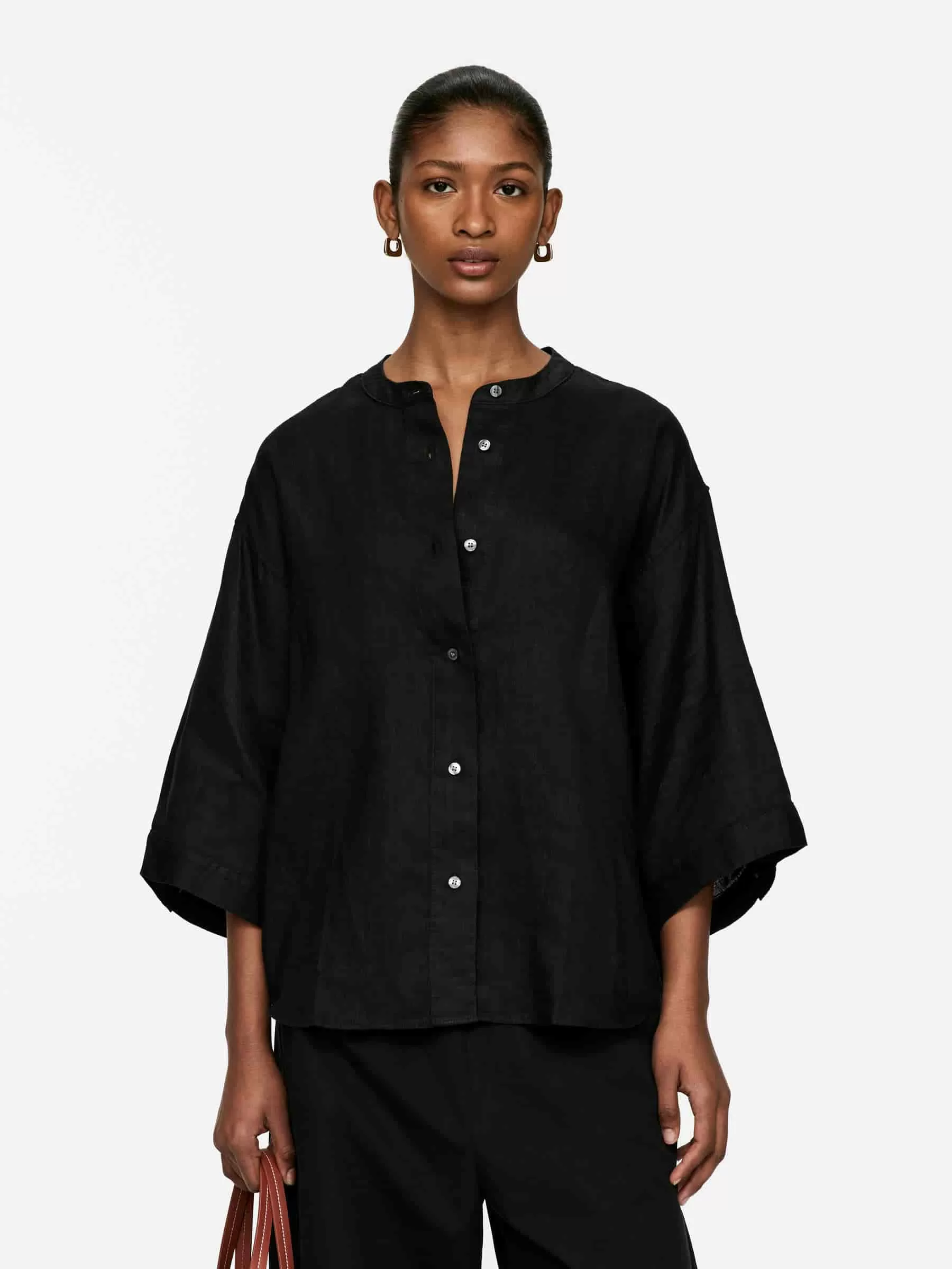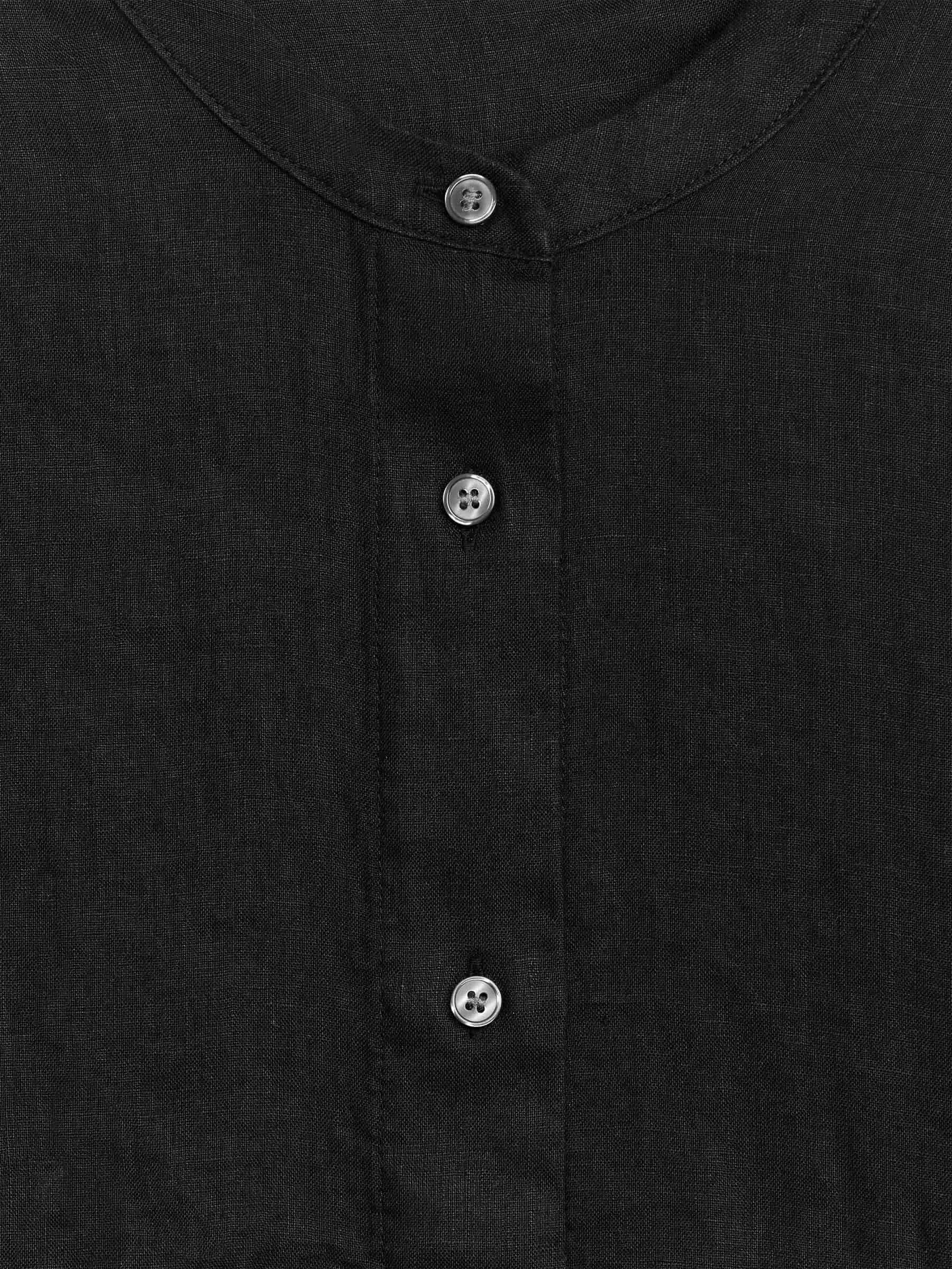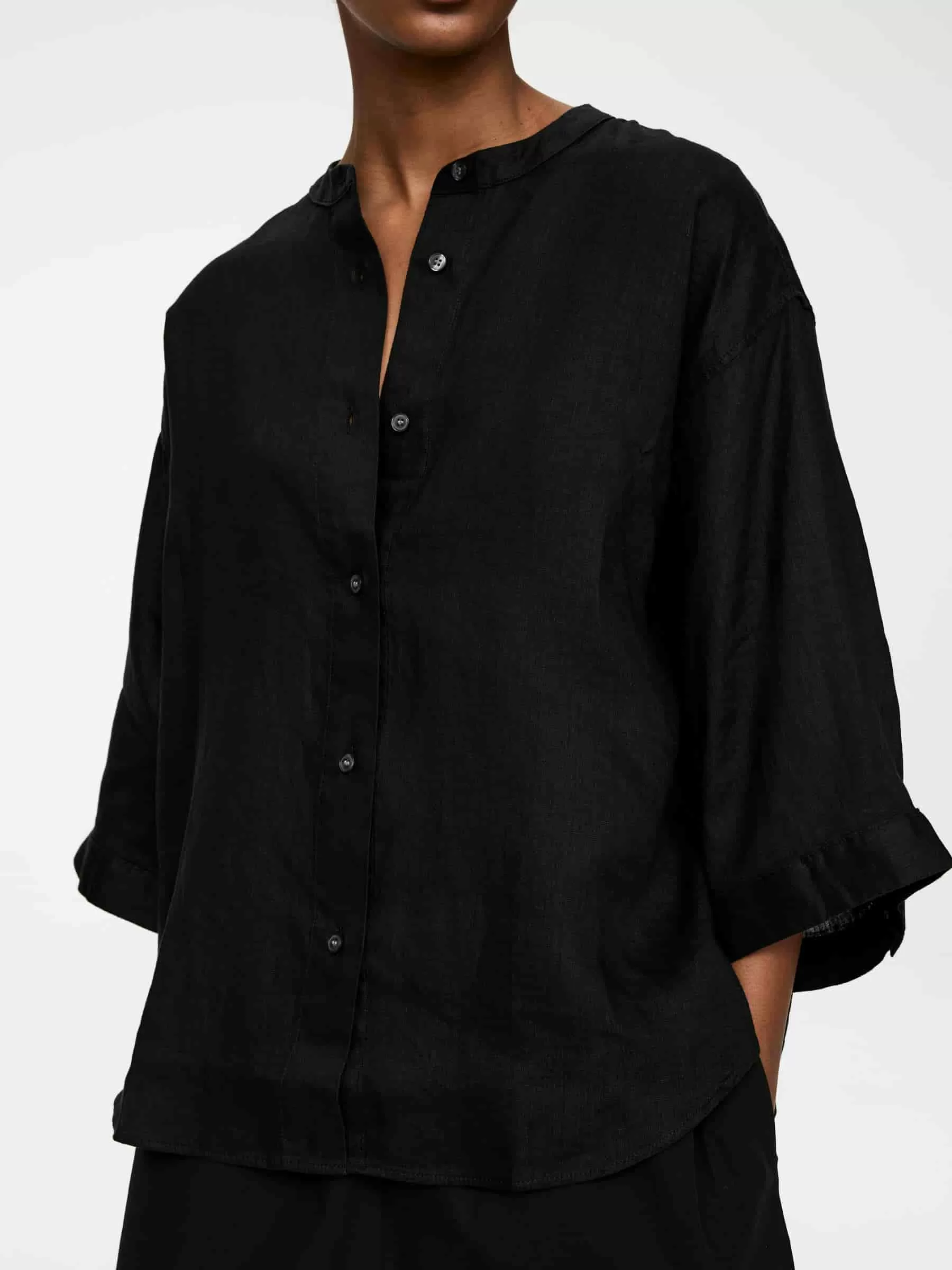 Linneskjorta utan krage med avslappnad passform. Stylad med trekvartslånga ärmar med knapp vid mudd.