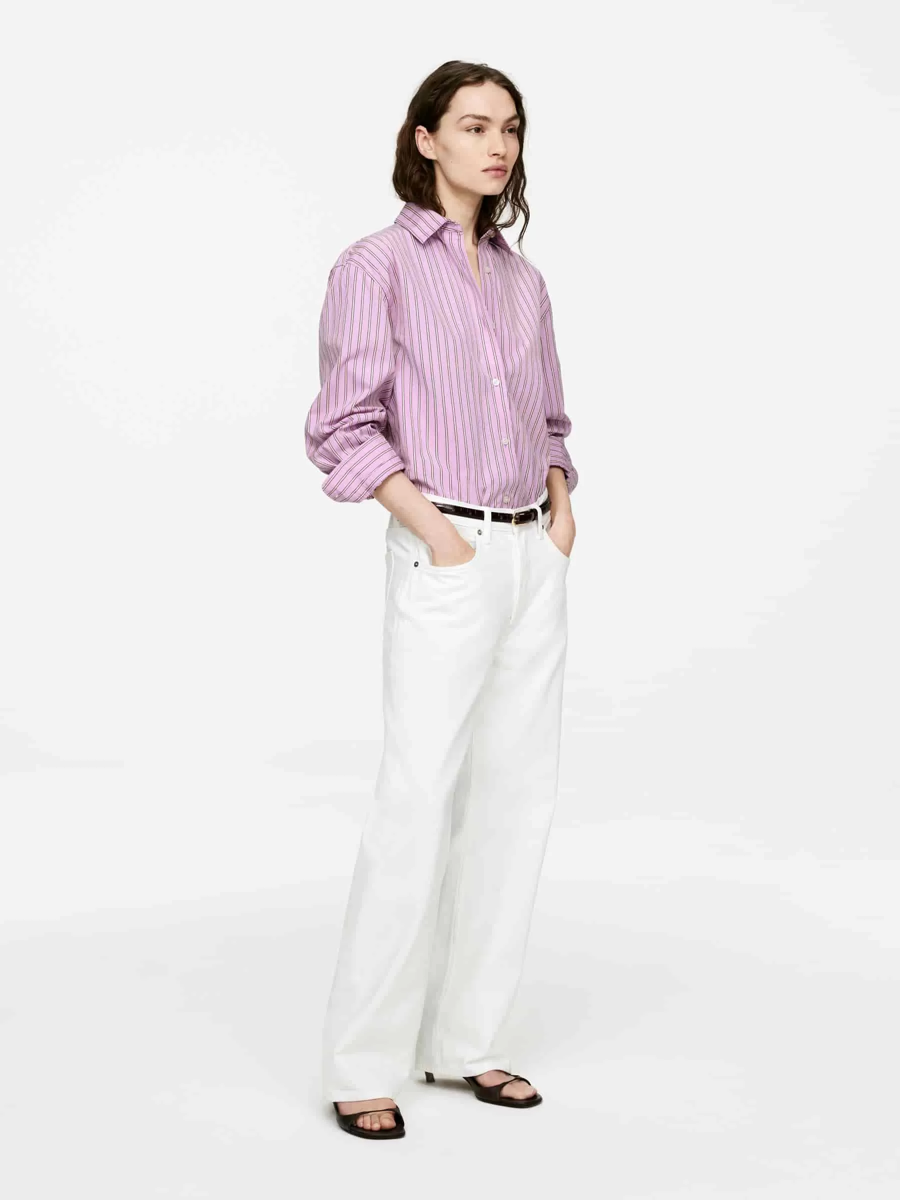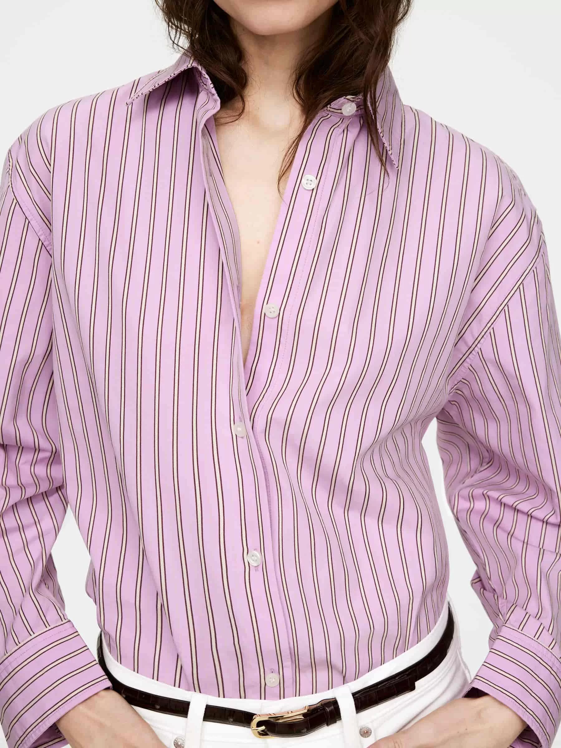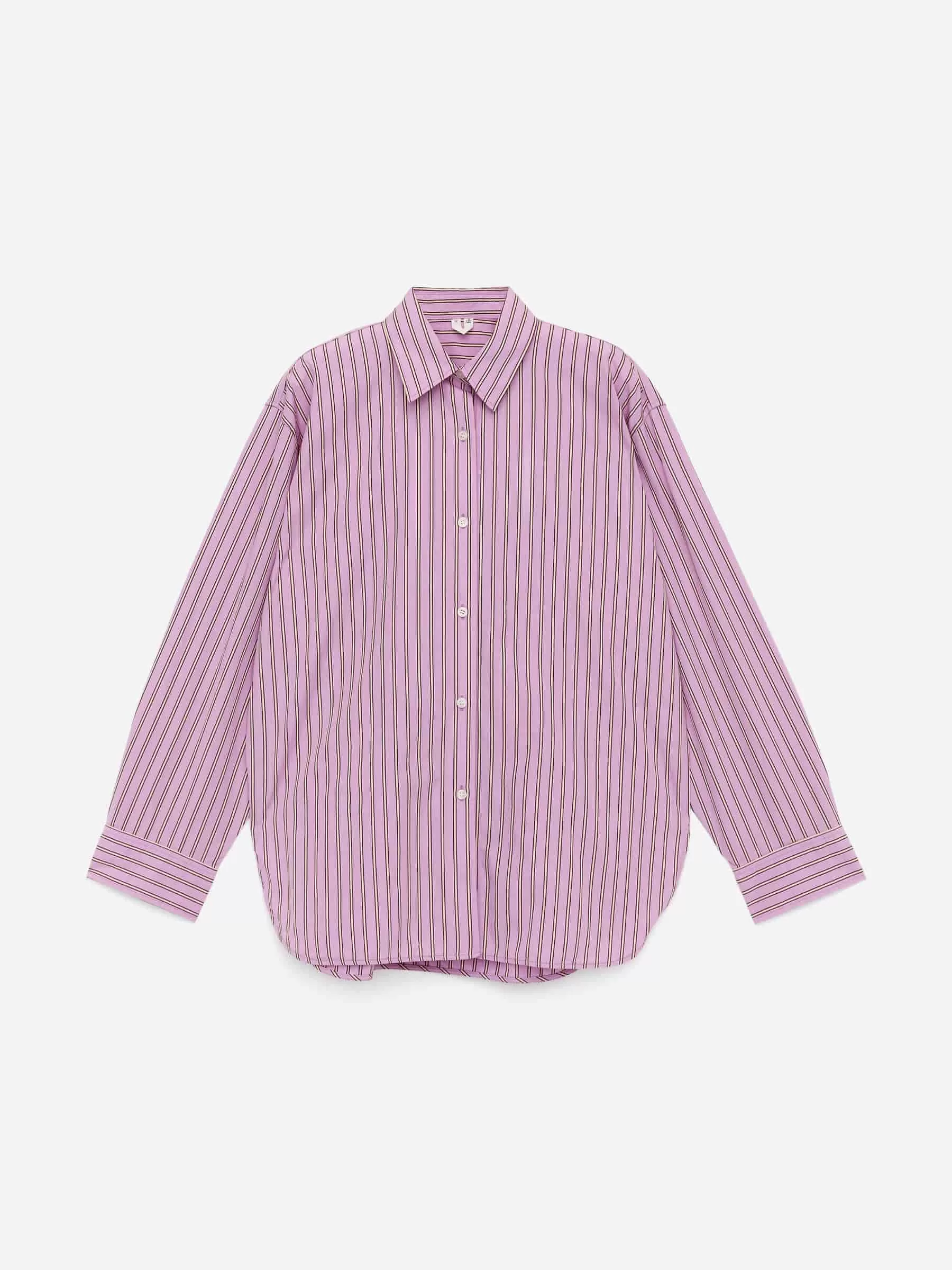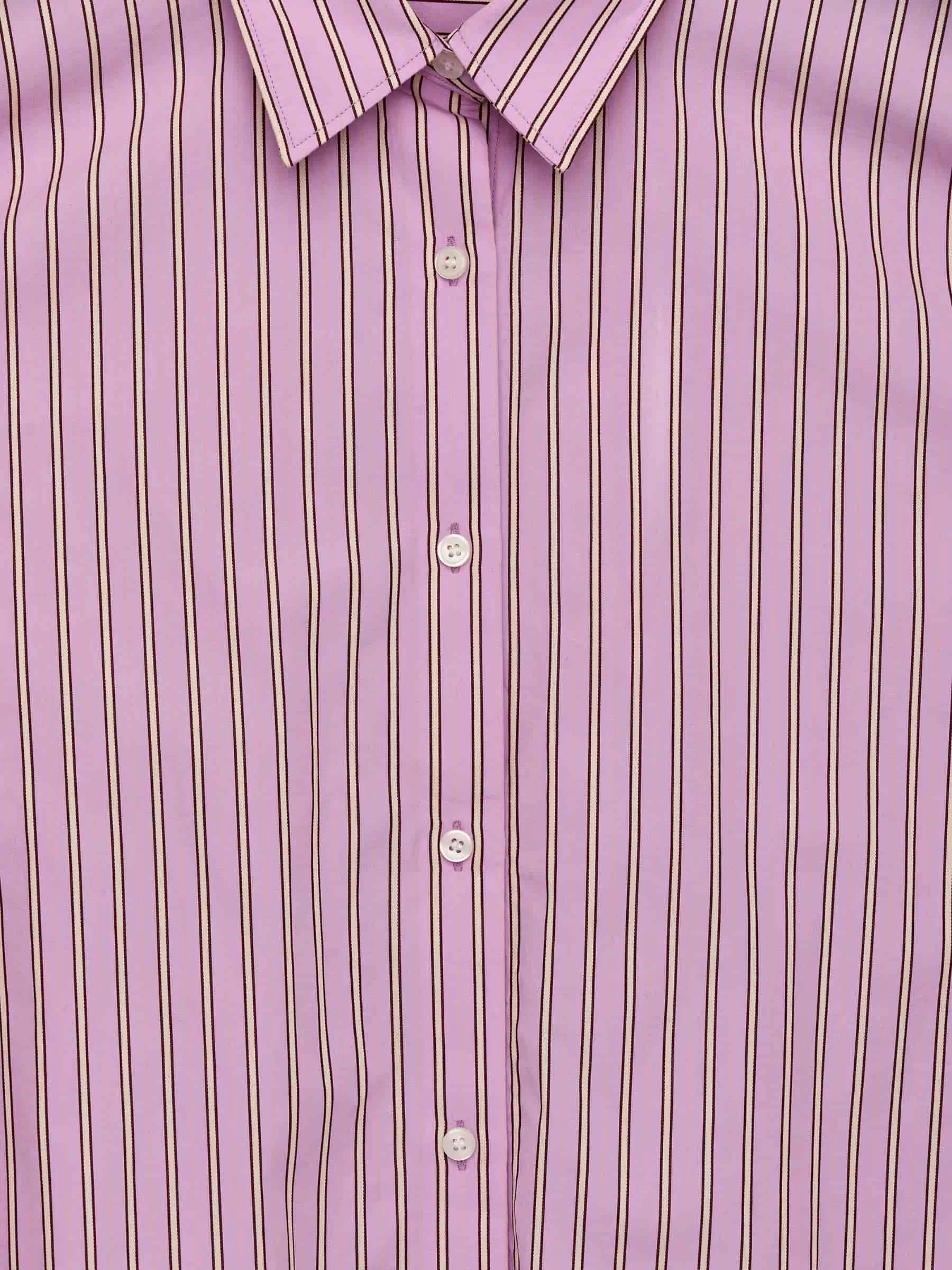 Skjorta sydd av en skarp poplinväv gjord av bomull. Den här skjortan har ett mönster av garnfärgade ränder. En långärmad stil för en avslappnad siluett med lätt tappade axlar.