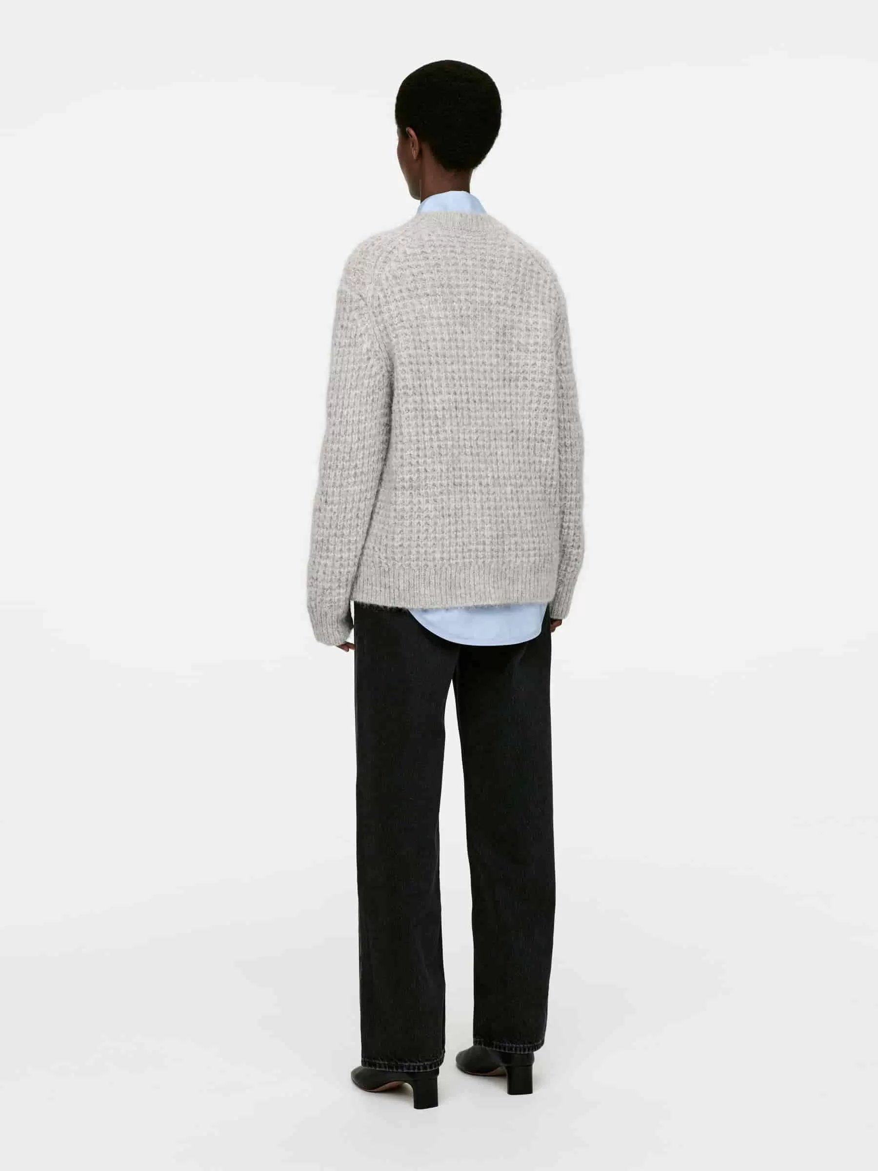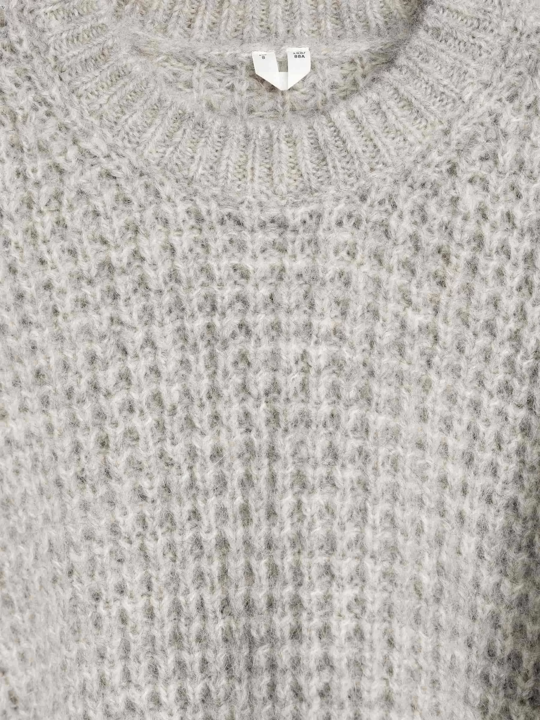 Tröja med rund hals gjord av en ull-alpackablandning i en halv cardigansöm. Ribbade kanter. Avslappnad passform. Denna stil innehåller 44 % RAS Alpaca och 56 % RWS-ull (TE-00047206). Produkter certifierade enligt Responsible Wool Standard (RWS) och Responsible Alpaca Standard (RAS) innehåller ull och alpackafiber från gårdar som är oberoende certifierade enligt kraven på djurskydd och markförvaltning.