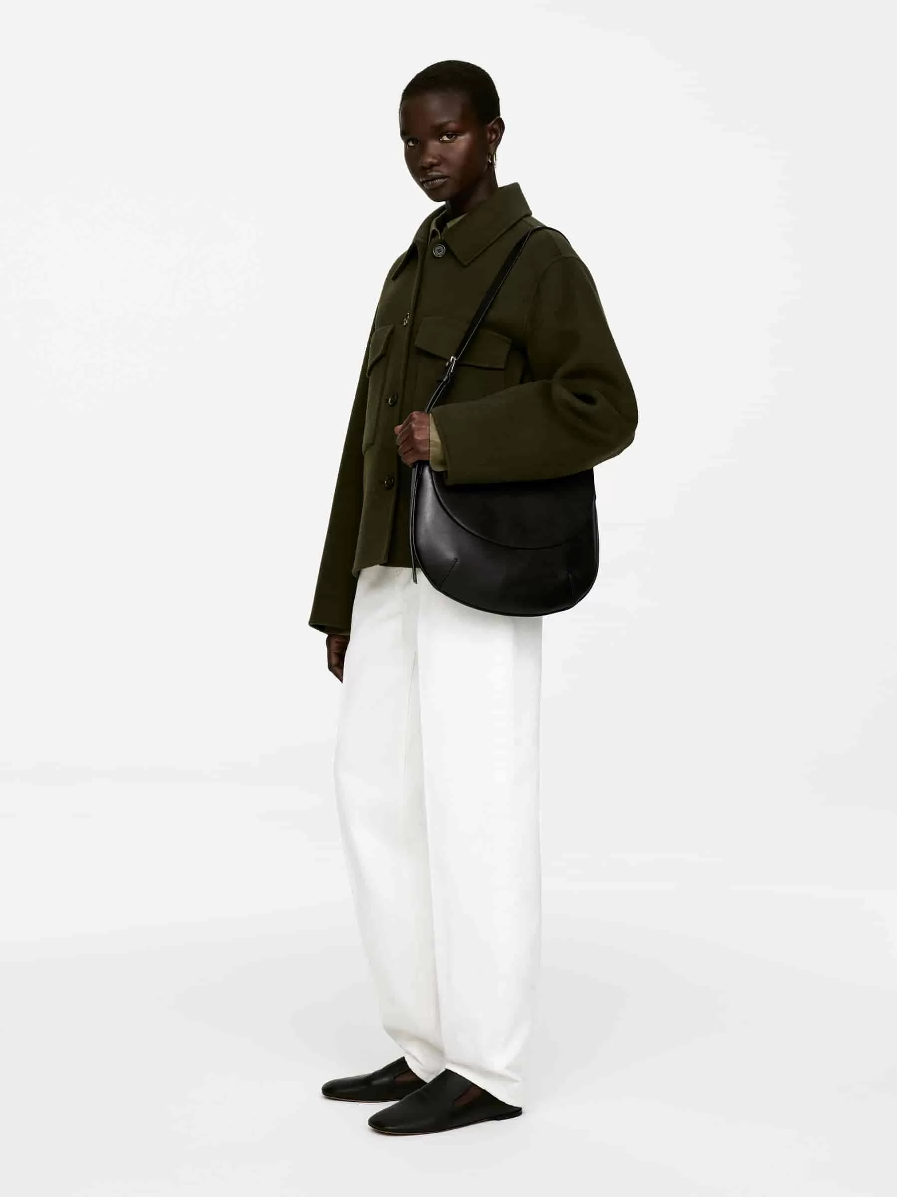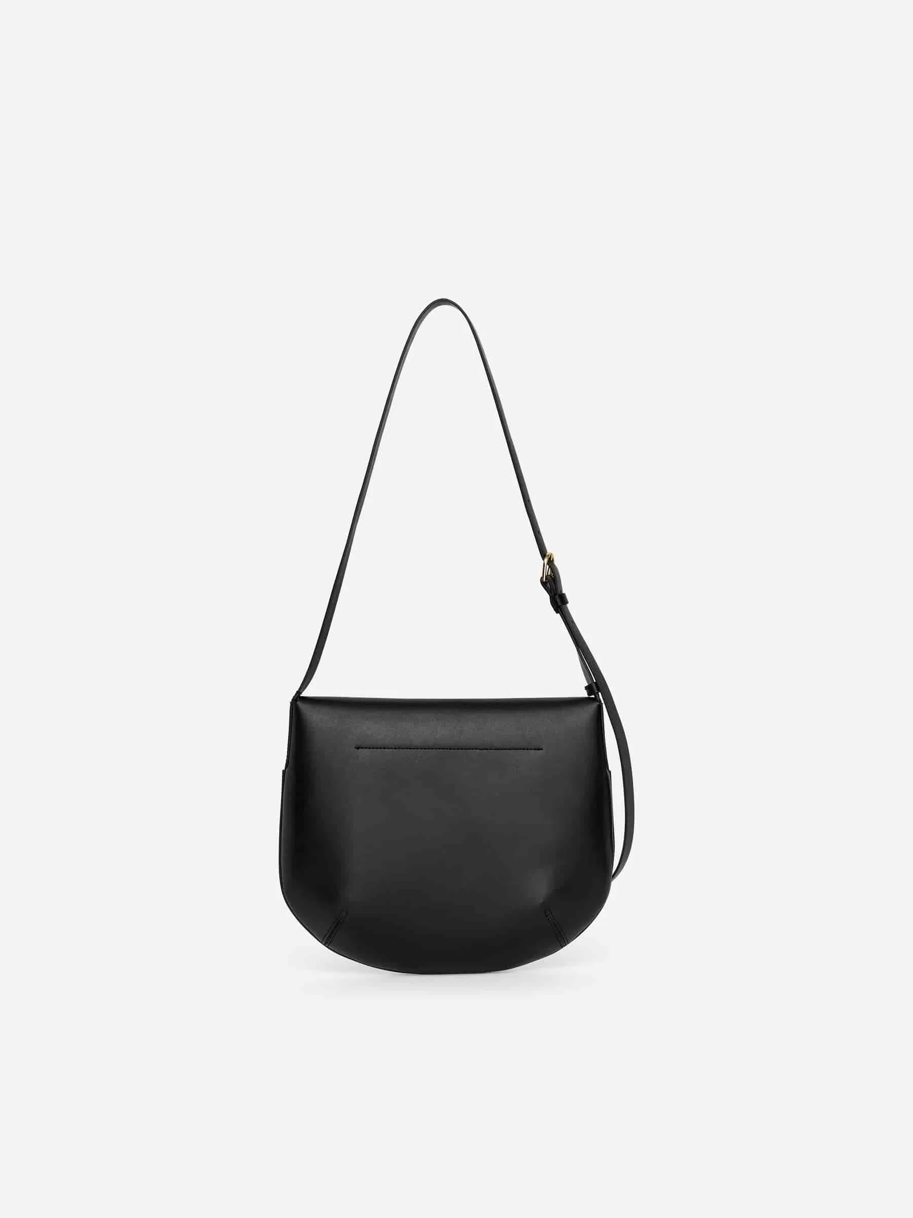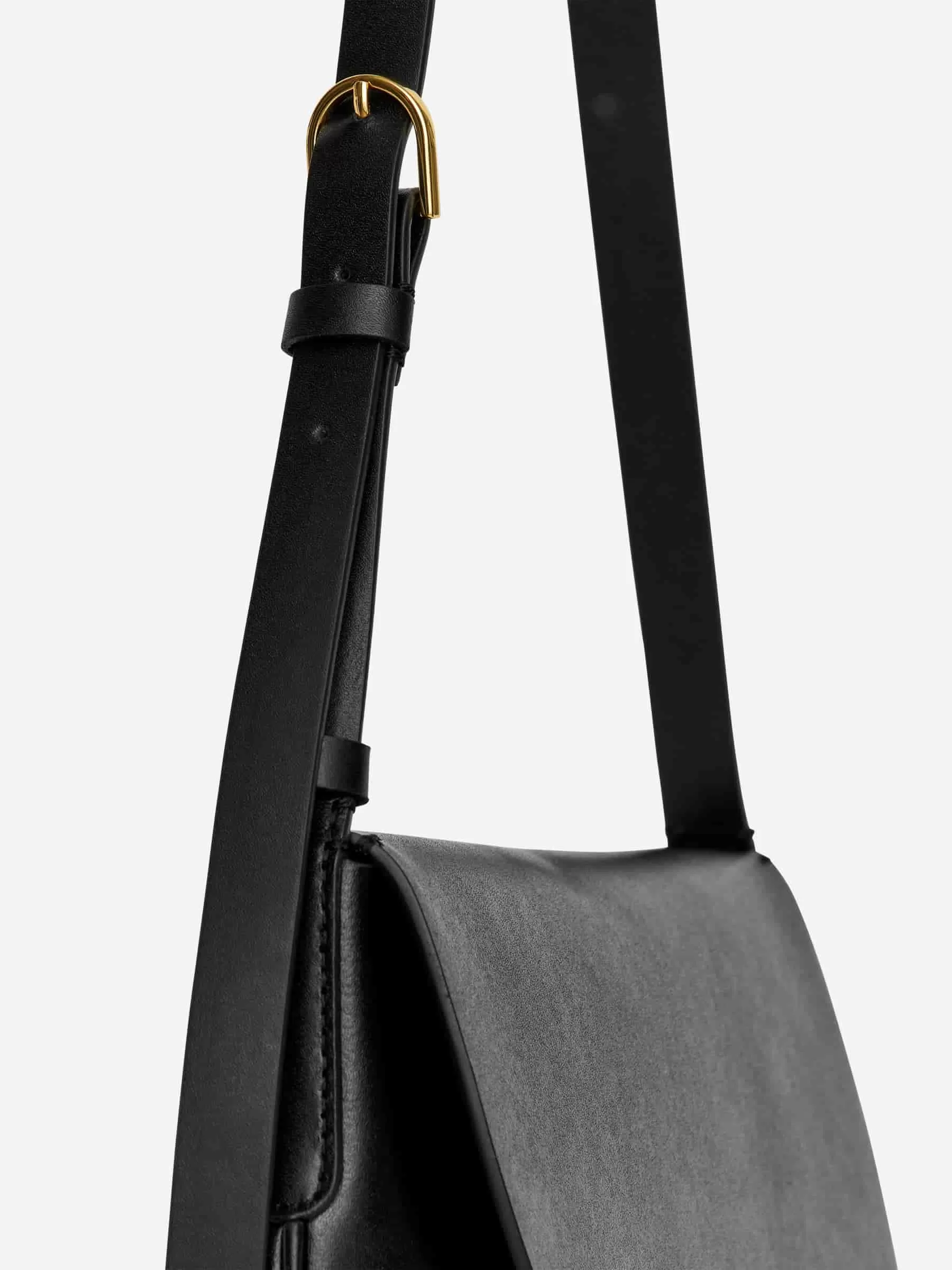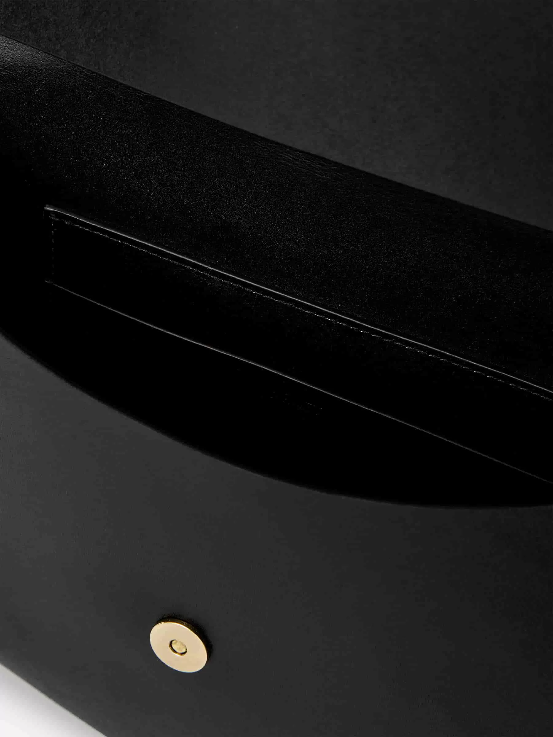 Skinnväska med lock och magnetstängning. Guldpläterade kanter och innerficka. Bredd 30,8 cm, höjd 25,3 cm. Band drop 40 cm (när den spänns i mittenhålet).