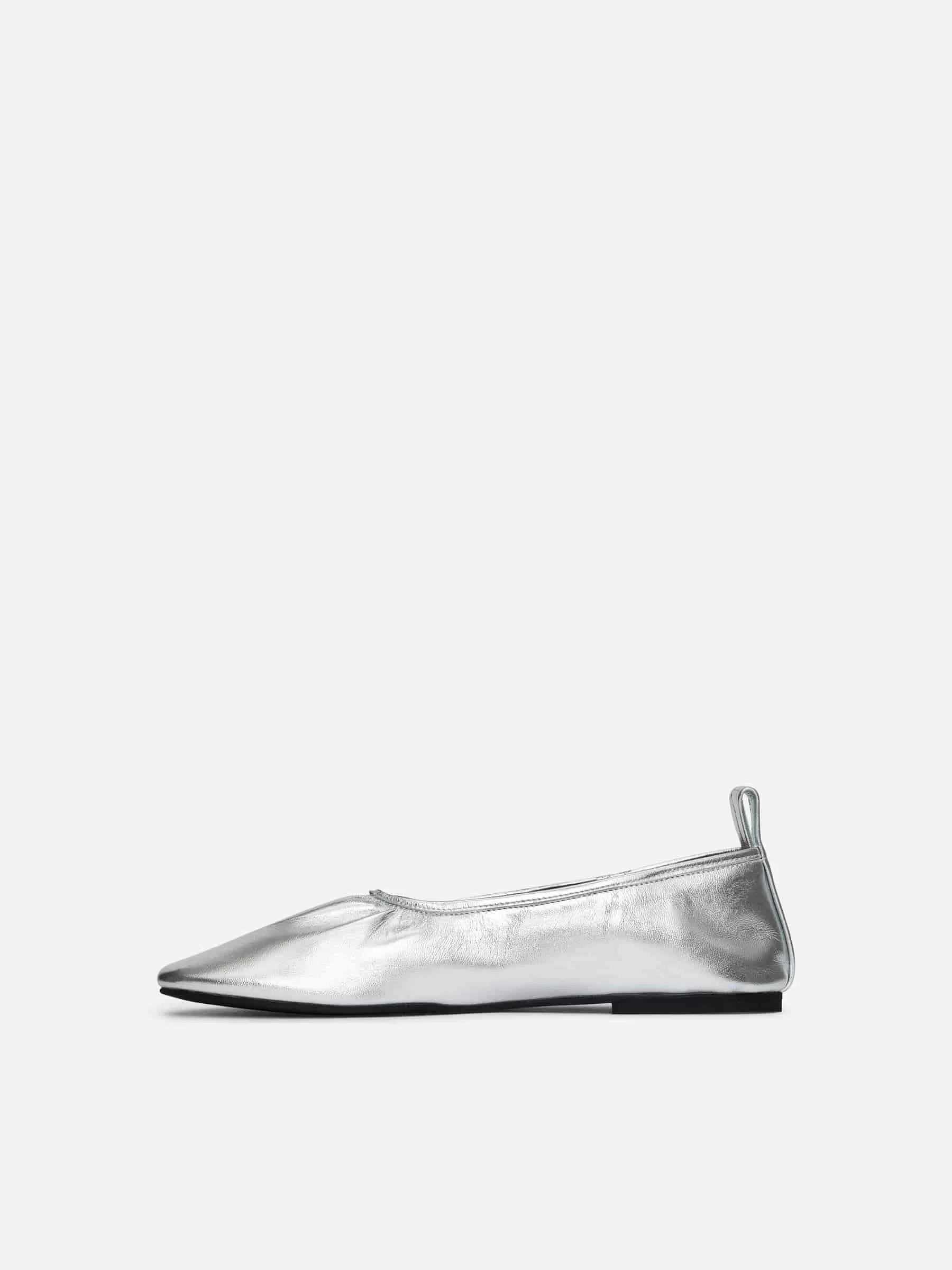 Balettlägenheter tillverkade av kromfritt läder. Detaljerad med en rem baktill för enkel glidning. Gummisula.