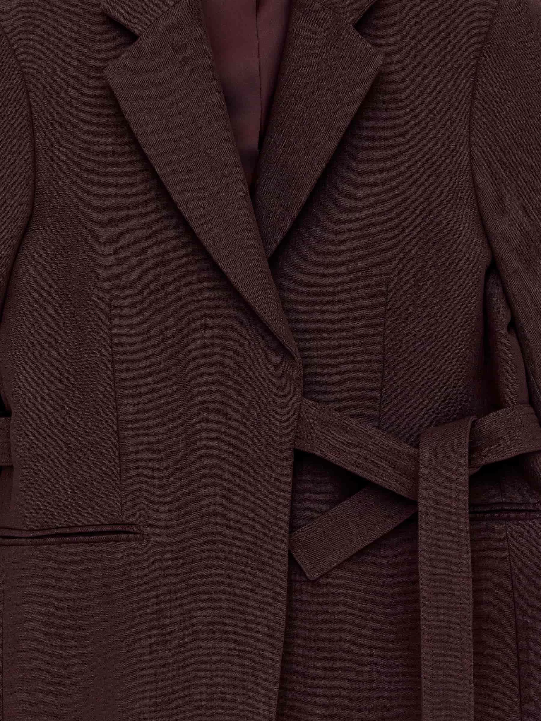 Blazer tillverkad av en blandning av bomull och linne. En överdimensionerad, helfodrad stil med ett hackslag, dubbla passpoalfickor och en knytrem för stängning. Ventil mitt bak och ärmfållar.
