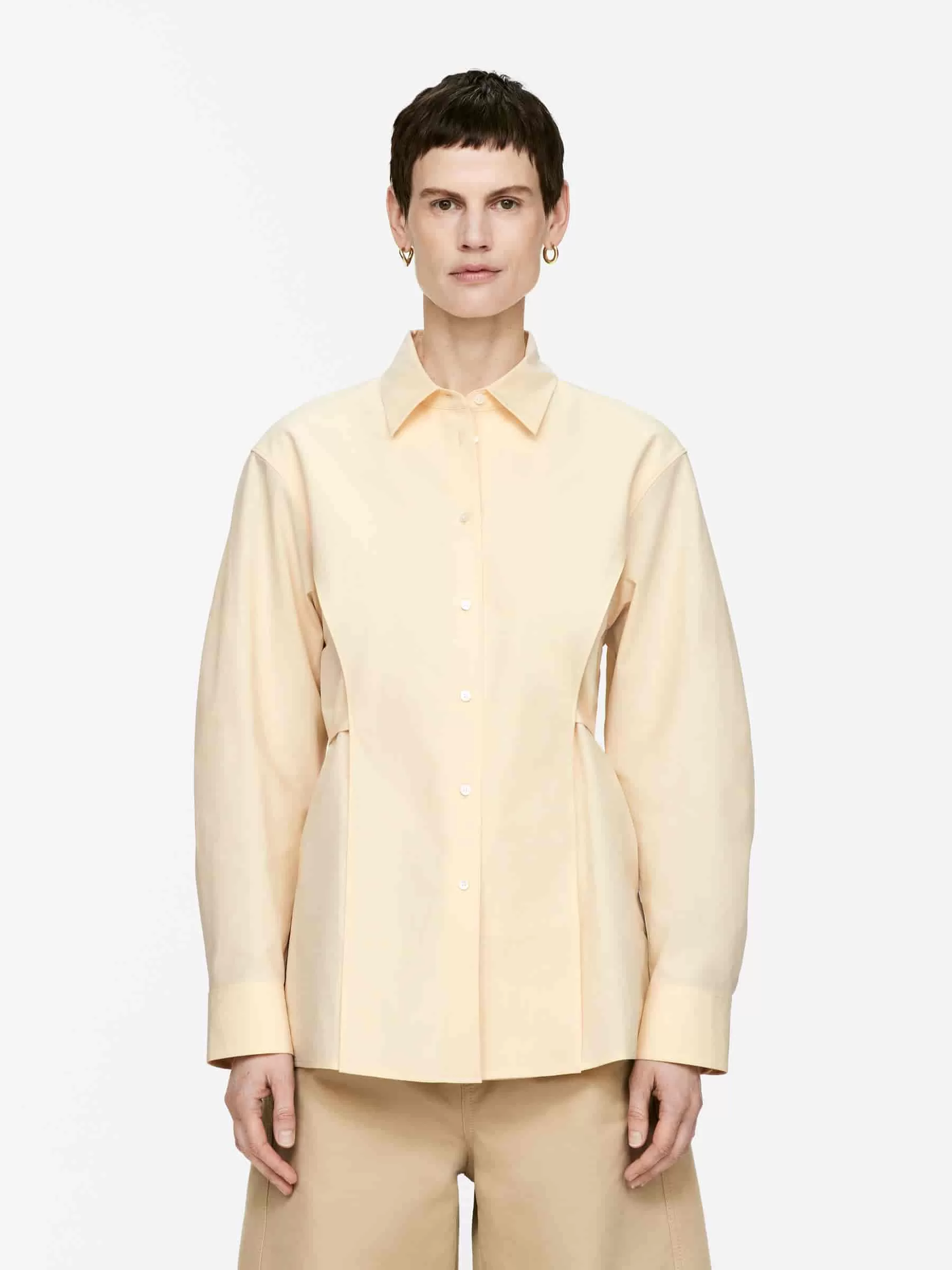 Bomullsblus designad med tappade axlar och voluminösa långa ärmar. Smalt bälte att knytas i midjan. Klippt för en normal passform och detaljerad med spetsig krage, knäppning fram och manschetter med knäppning.