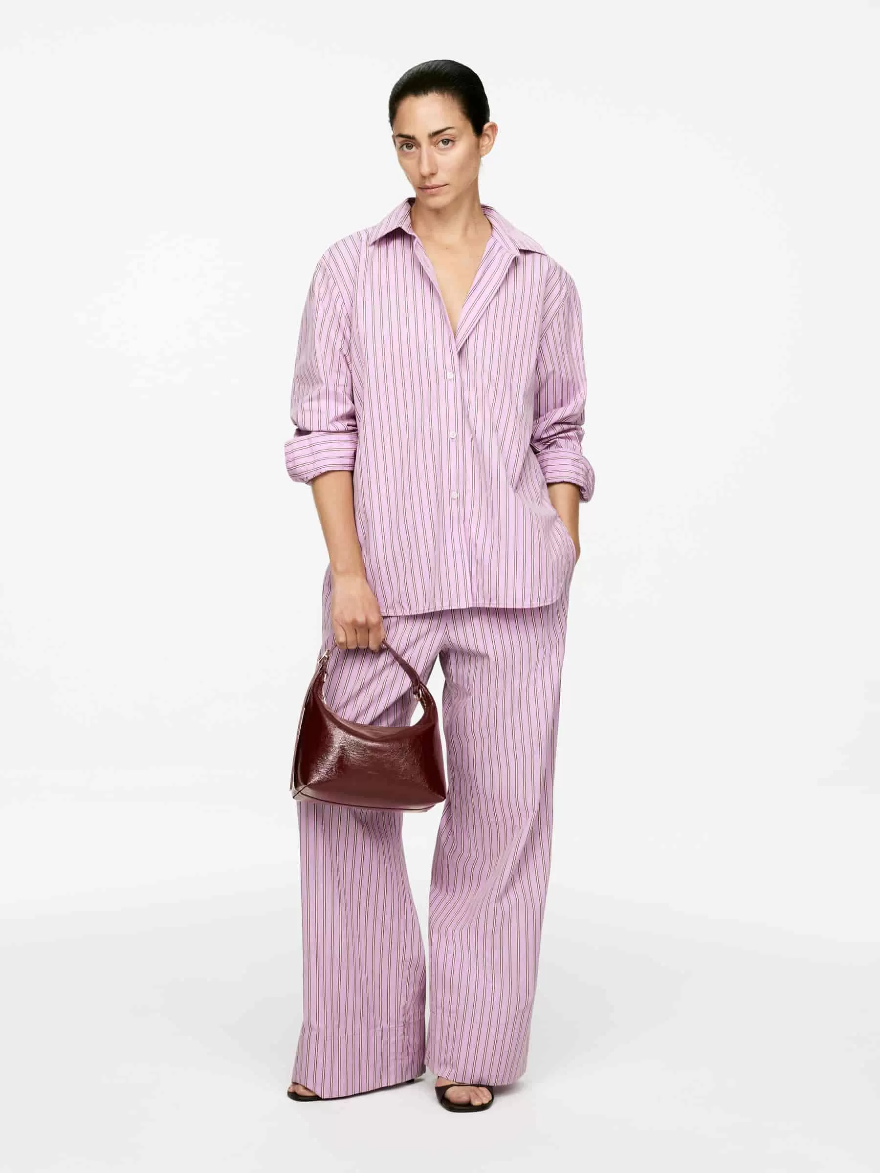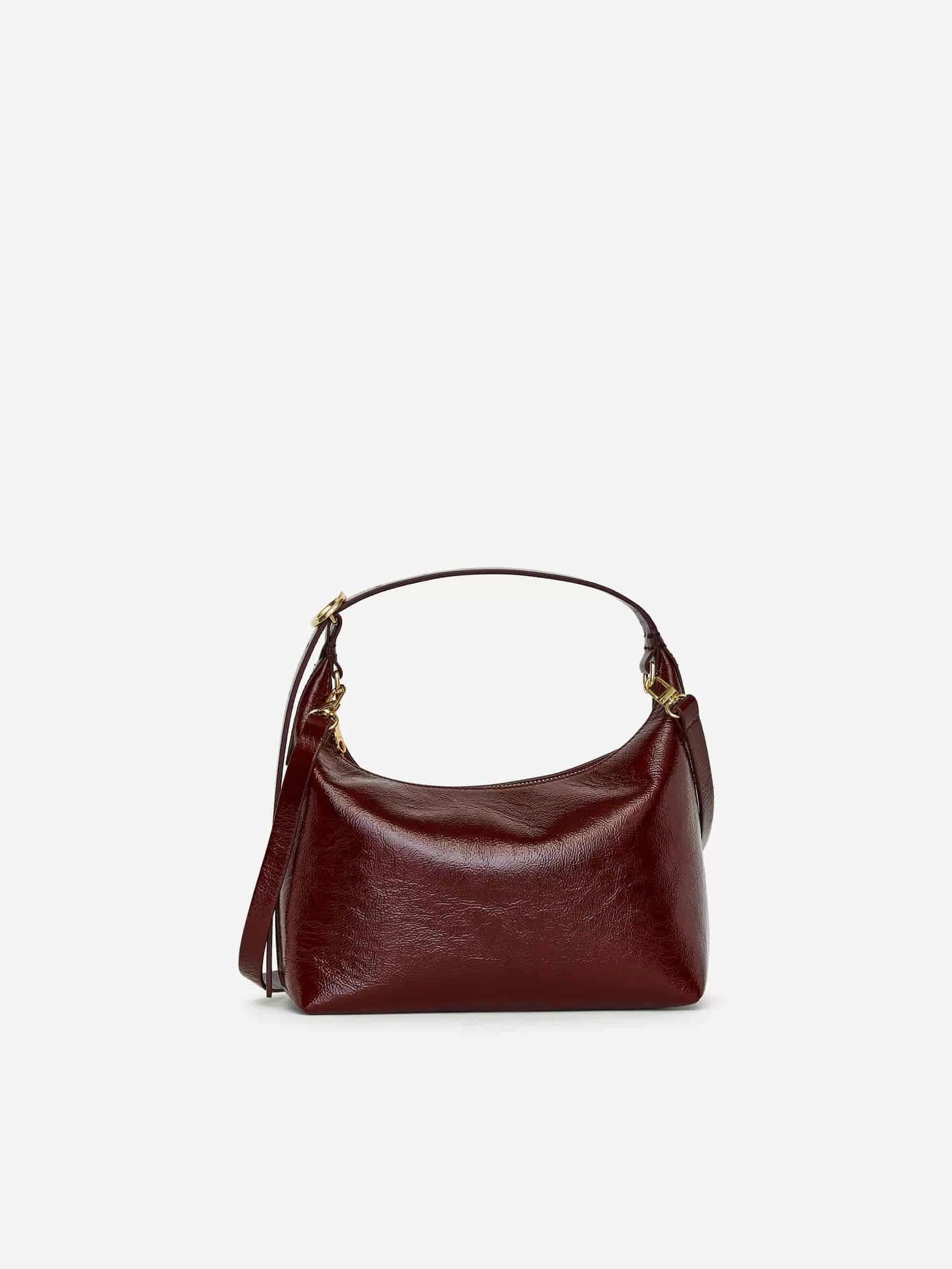 Boxig läderväska med ett justerbart övre handtag med ett guldtonat spänne. Inkluderar en smal, fästbar axelrem. Invändig blixtlåsficka och dragkedja. Bredd 23 cm, höjd botten-mitten 16 cm, höjd botten-start av remmen 19 cm, djup 10,5 cm.