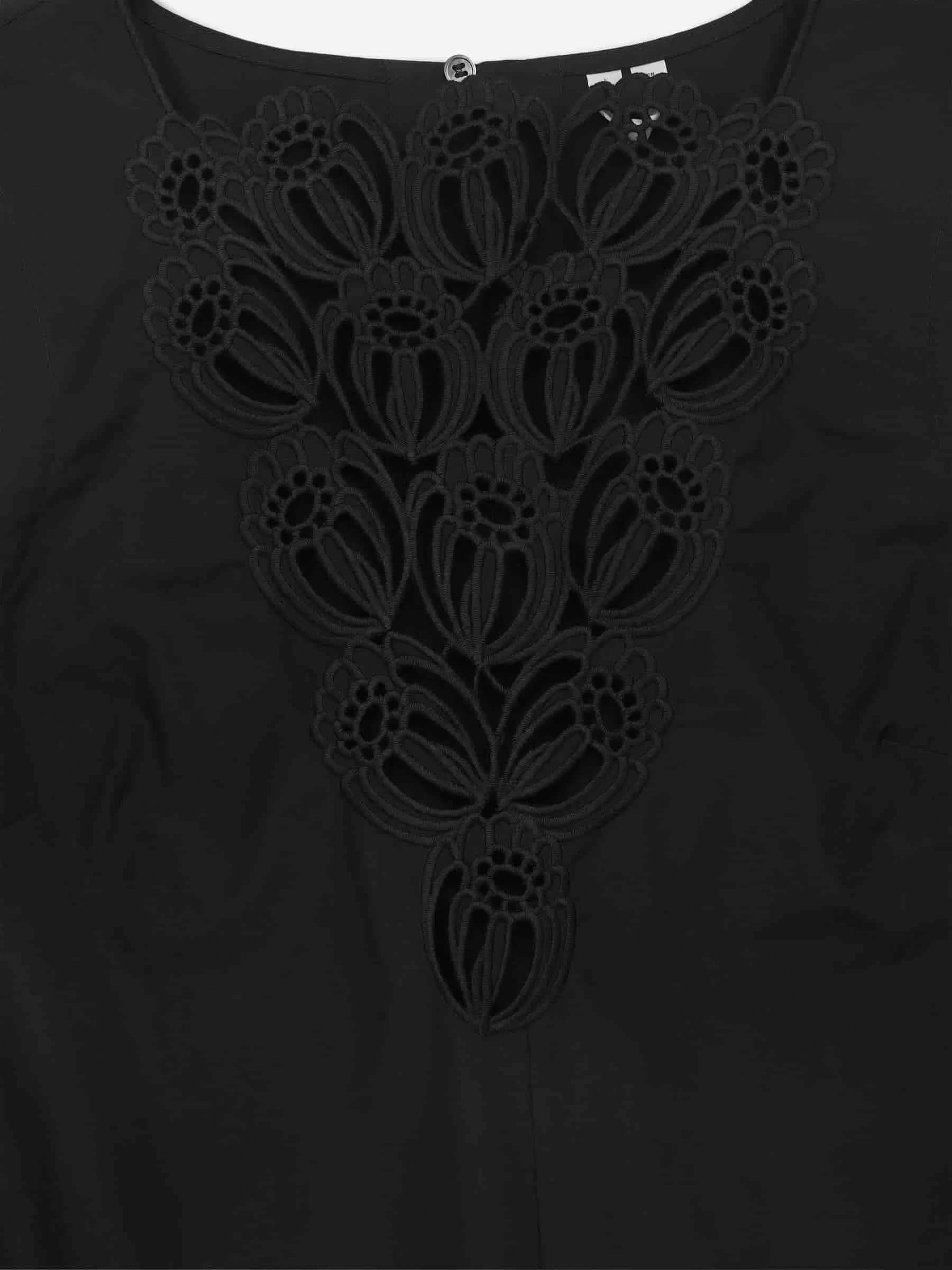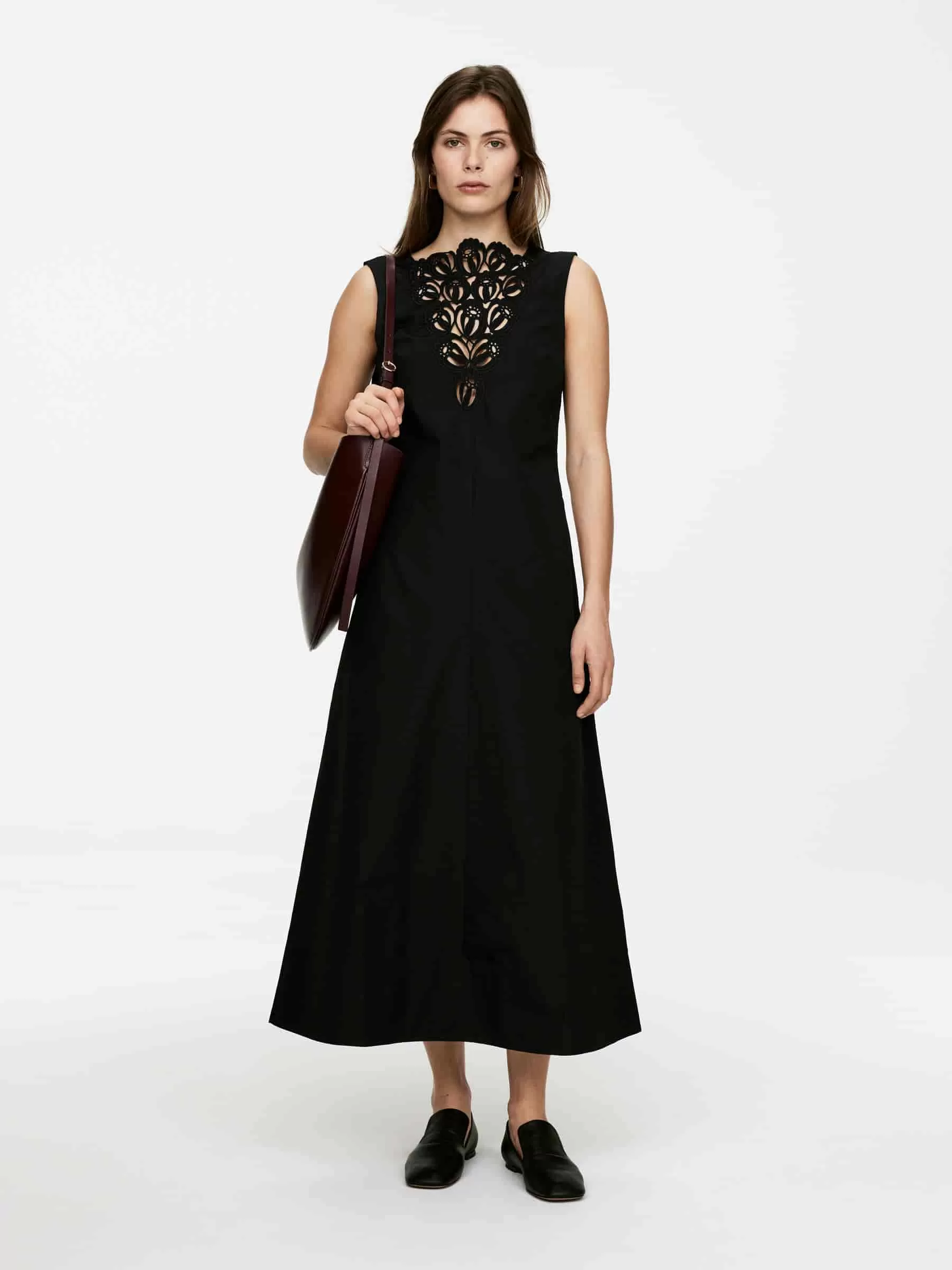 Ärmlös bomullsklänning med broderidetaljer på bröst- och sidfickor. Dragkedja baktill. Normal passform.
