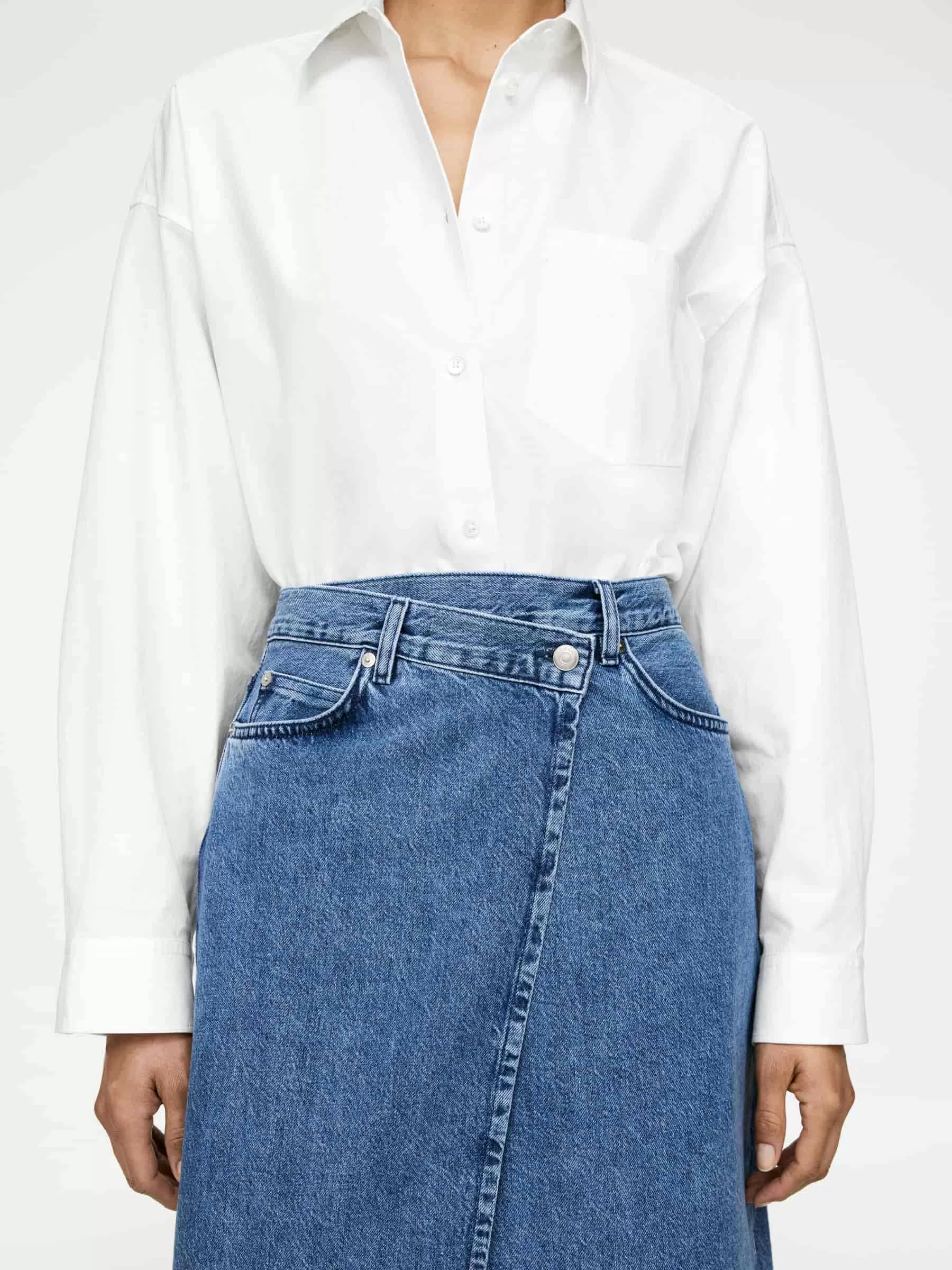 Hög midja omlottkjol med asymmetrisk fåll och knäppning. Tillverkad av en mellanvikts denim av bomull.