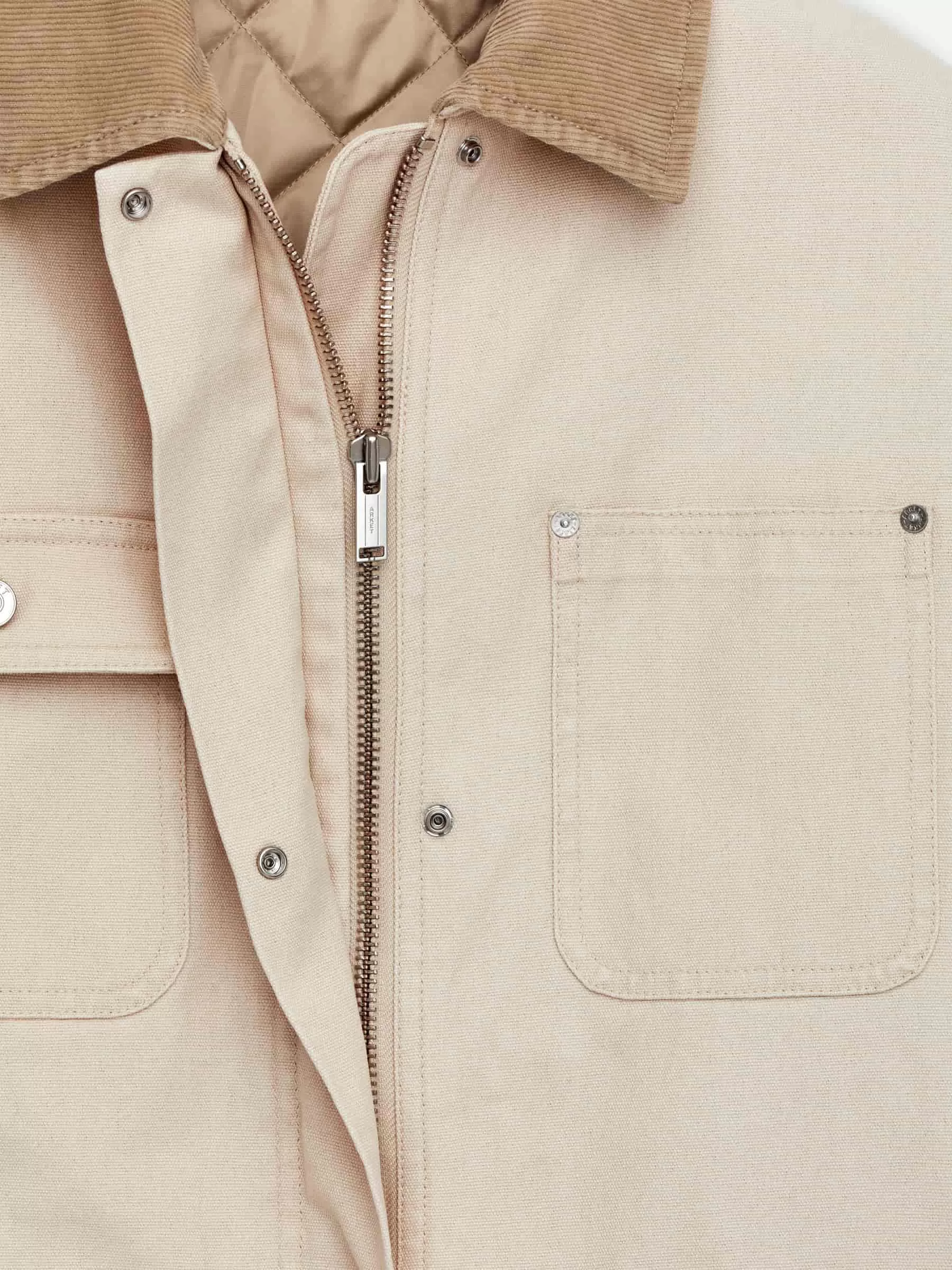 Arbetskläder-inspirerad jacka i ett stentvättat canvastyg. Detta är en vadderad stil med en manchesterkrage, en tvåvägsdragkedja i metall framtill och lappade fickor med skaftknappar.
