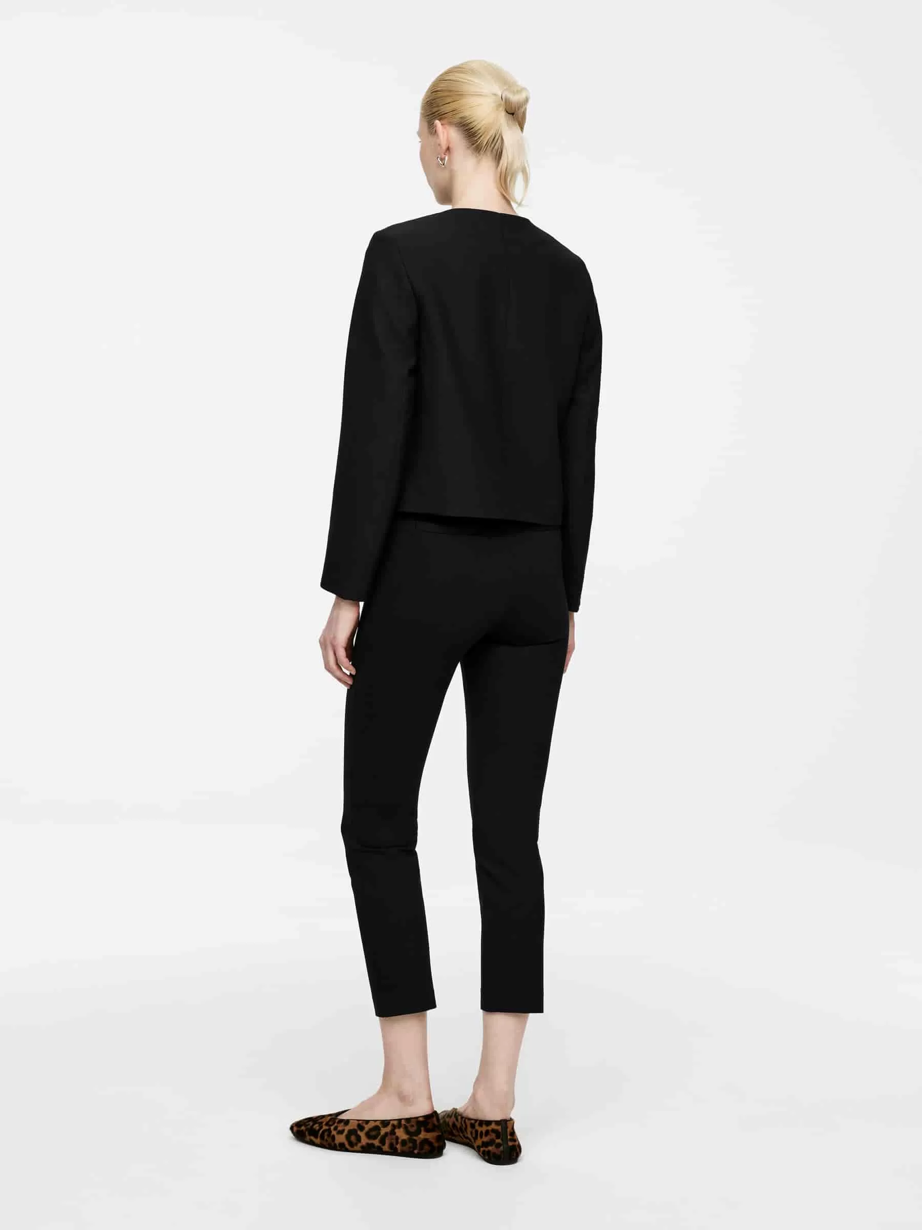 jacka utan krage med fickor med lock. En helfodrad stil med knappstängning mitt fram. Skaltyget innehåller 45 % RWS-ull (TE-00047206). Produkter certifierade enligt Responsible Wool Standard (RWS) innehåller ullfibrer från gårdar som är oberoende certifierade enligt kraven på djurskydd och markförvaltning.
