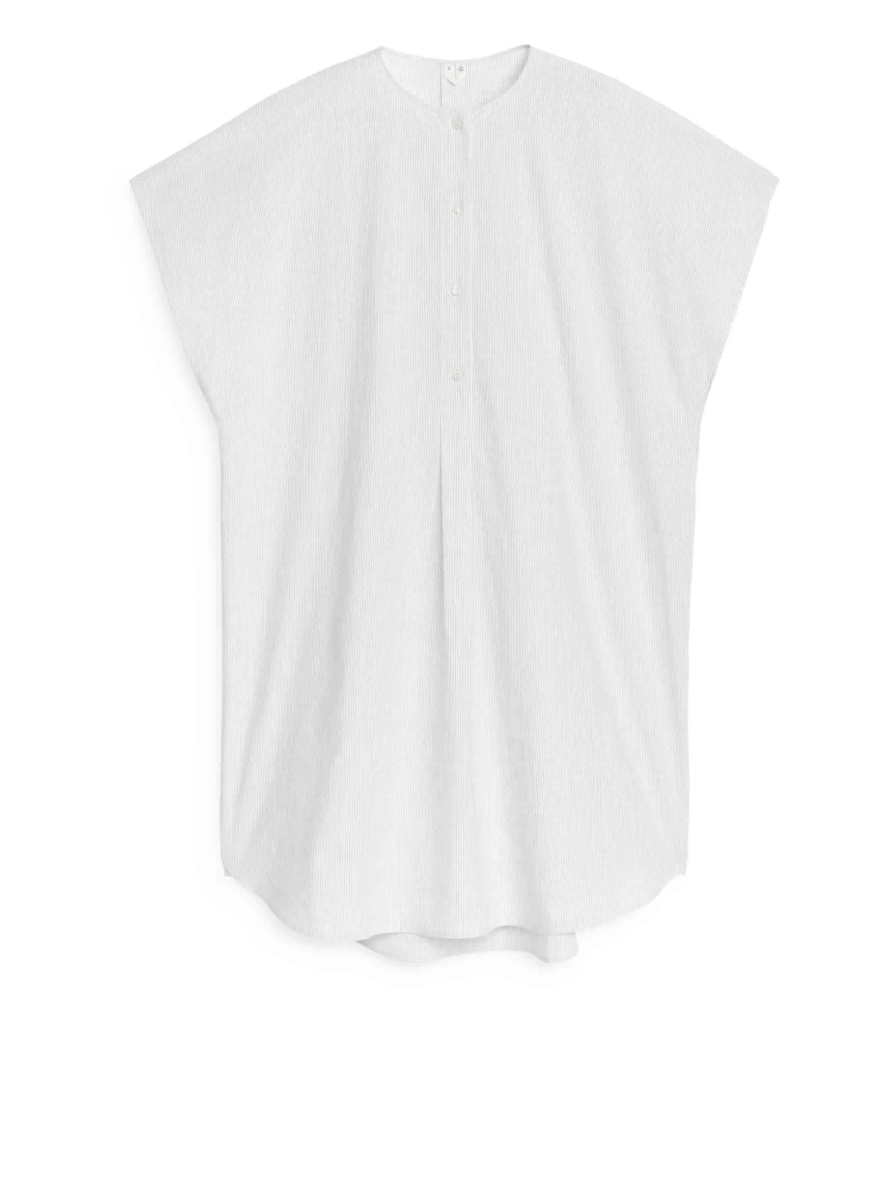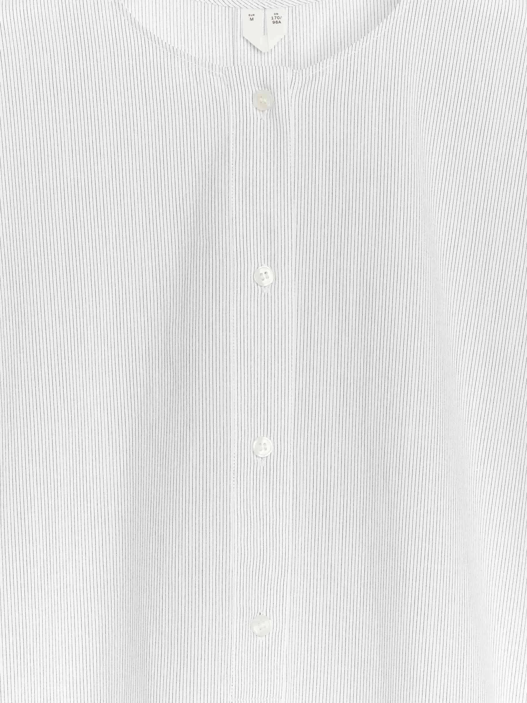 Tunika utan krage med kepsärmar tillverkad av tvättad bomullsväv. En avslappnad modell med en knappad halv knappslå.