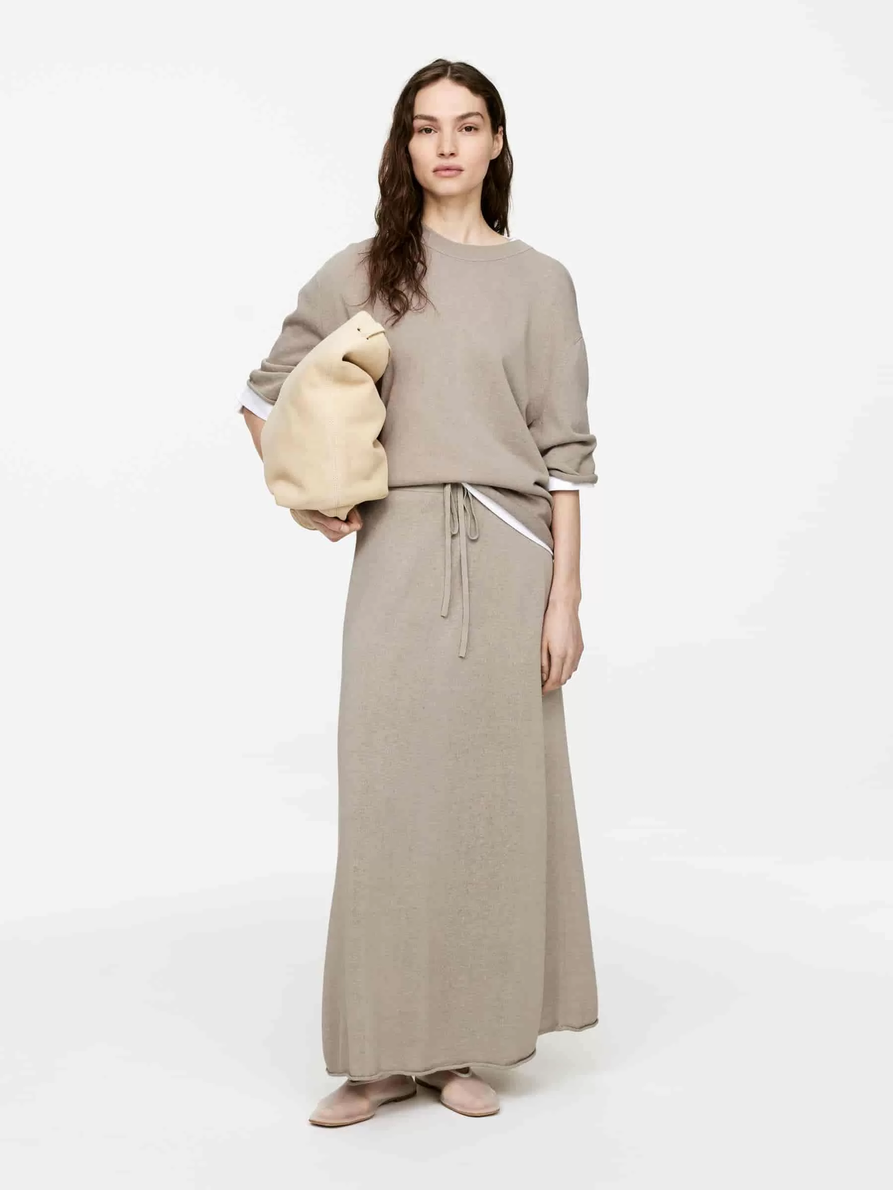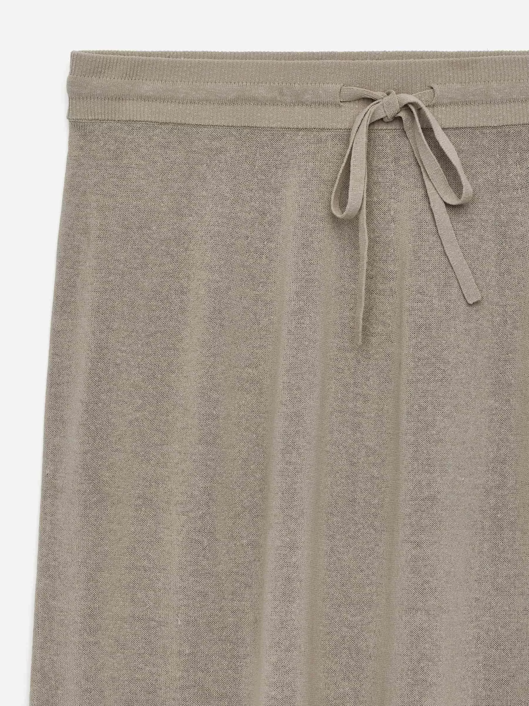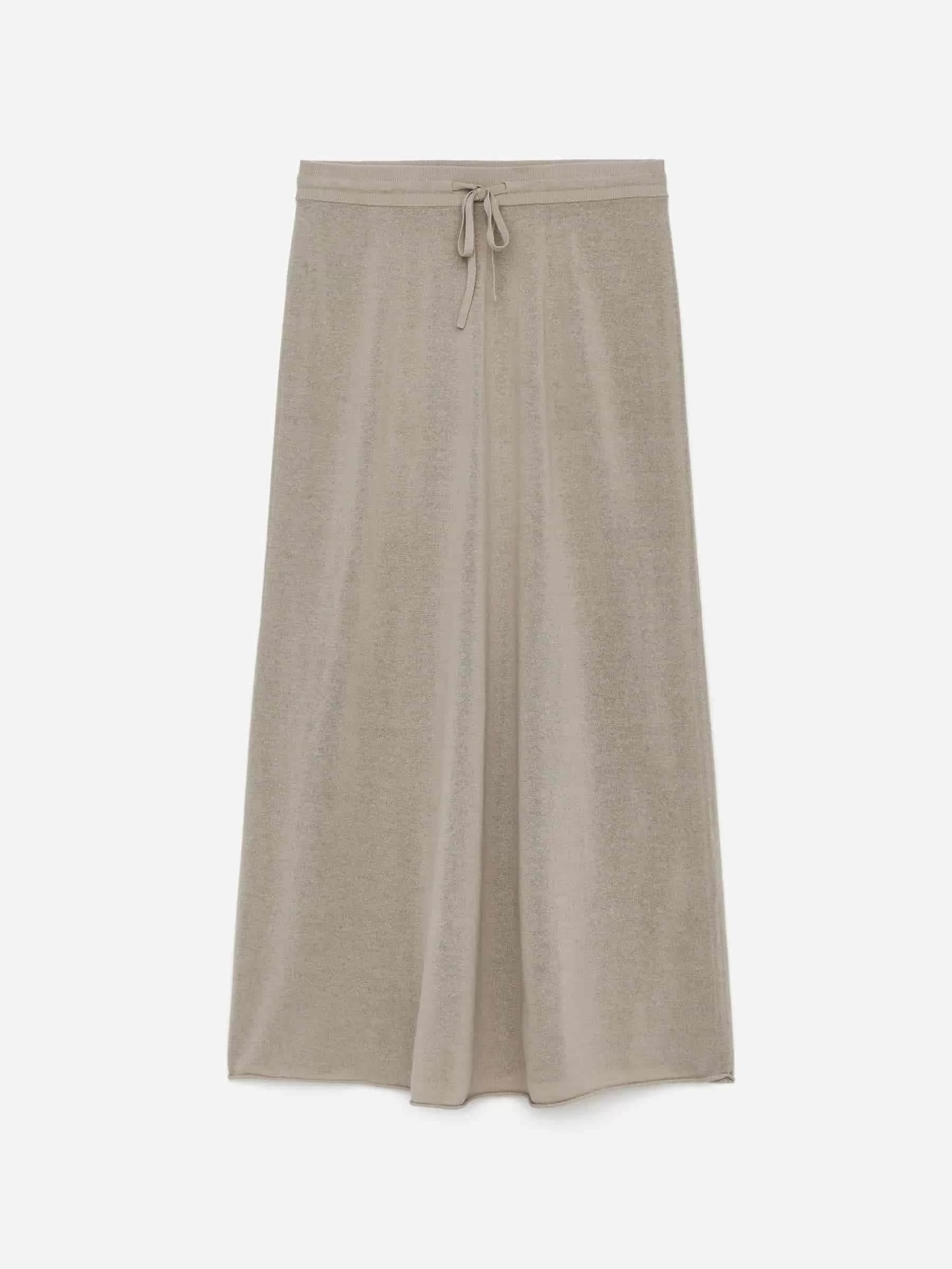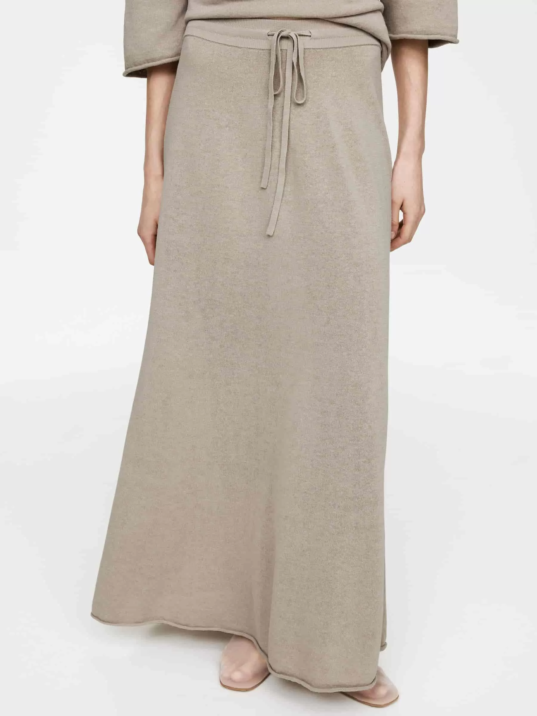 Kjol i en linne-bomull-viskosblandning. Ribbstickad midja med resår och dragsko. Rullad kant i nederkant.