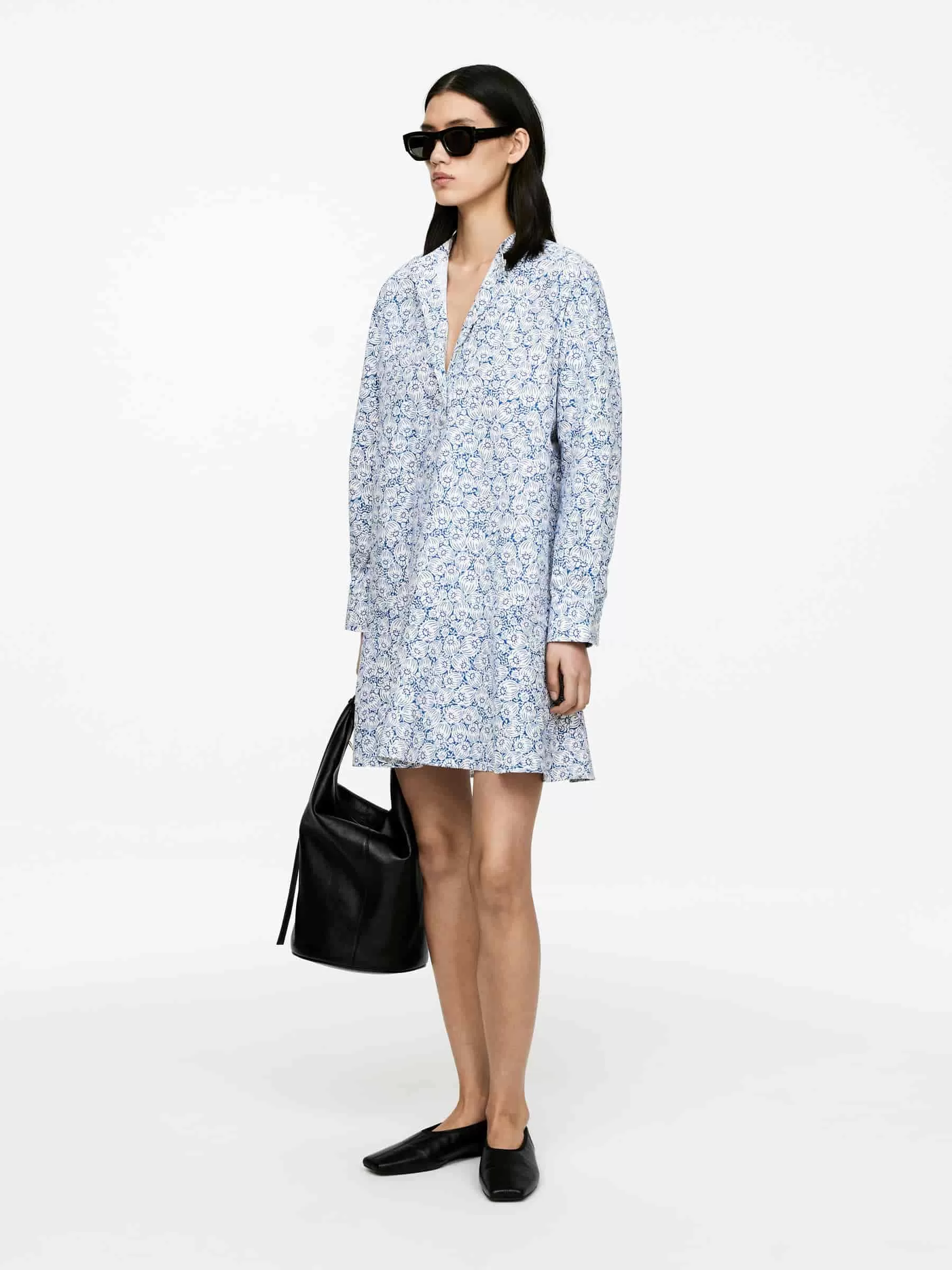Långärmad miniklänning tillverkad av bomull. Denna stil har en halv knappslå och en normal passform.