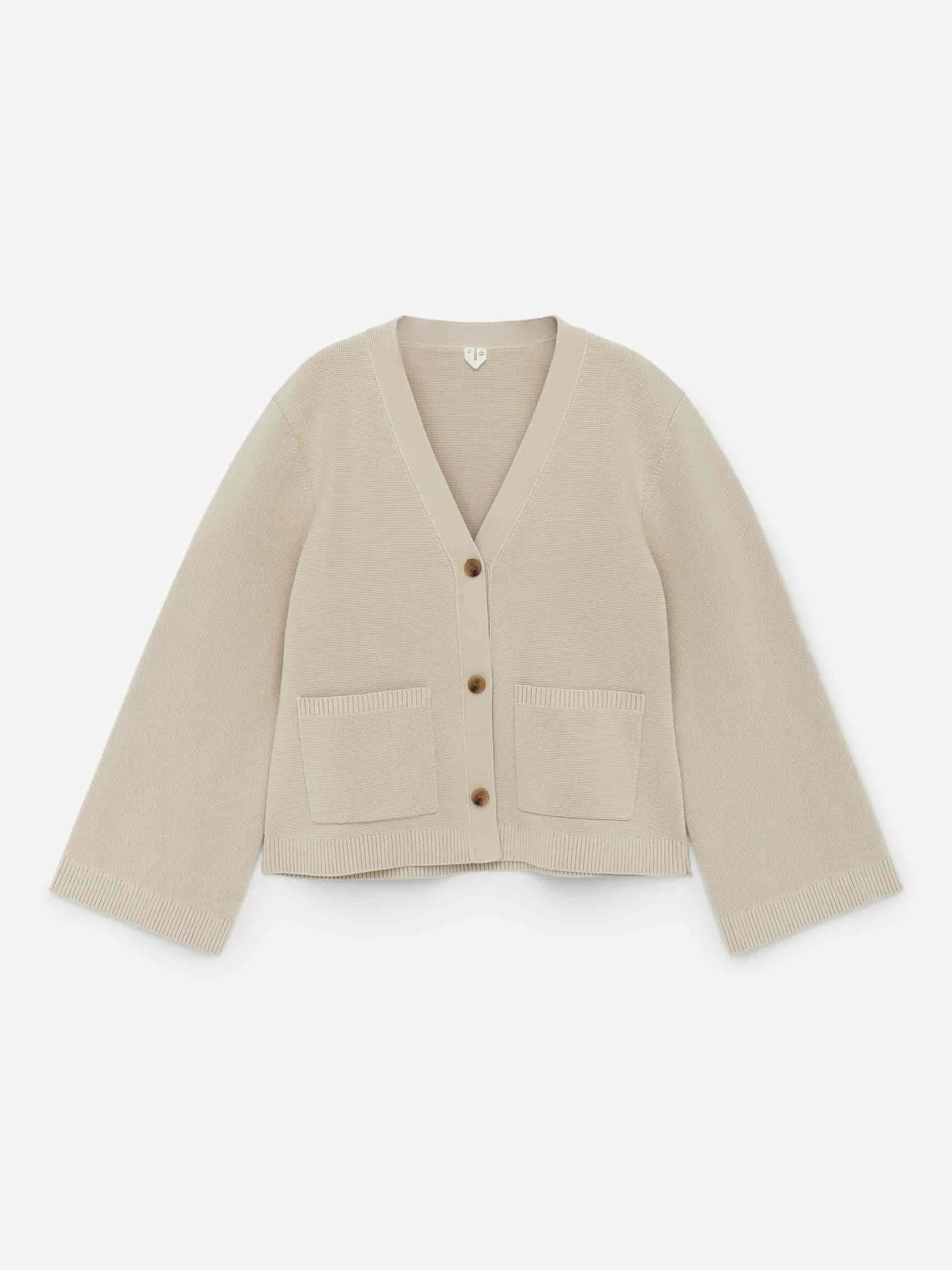 Bomullskofta stickad i hel Milanosöm. Detta är en V-ringad modell med tre knappar med framfickor och ribbstickade ärmslut och nederkant. Normal passform.