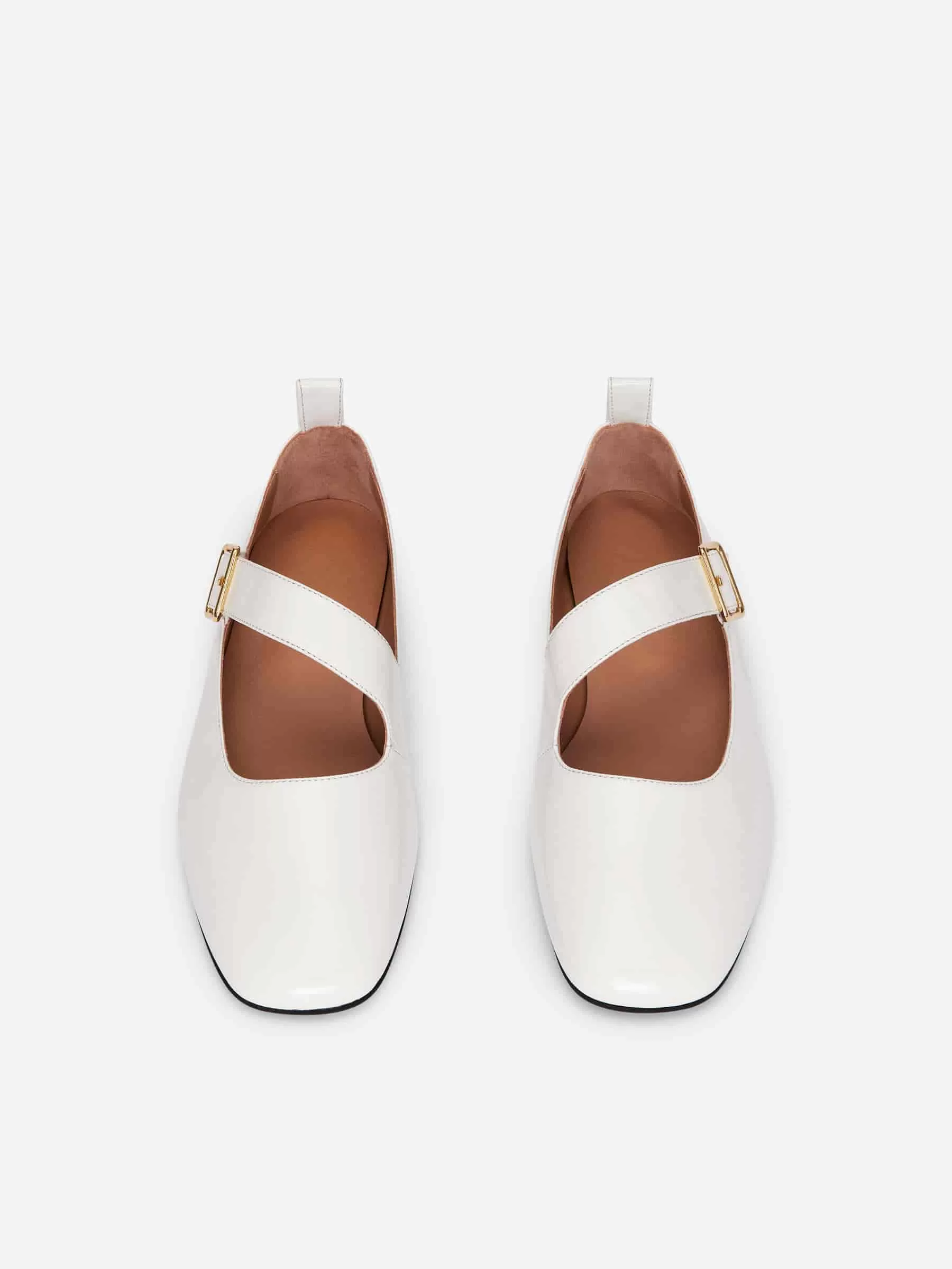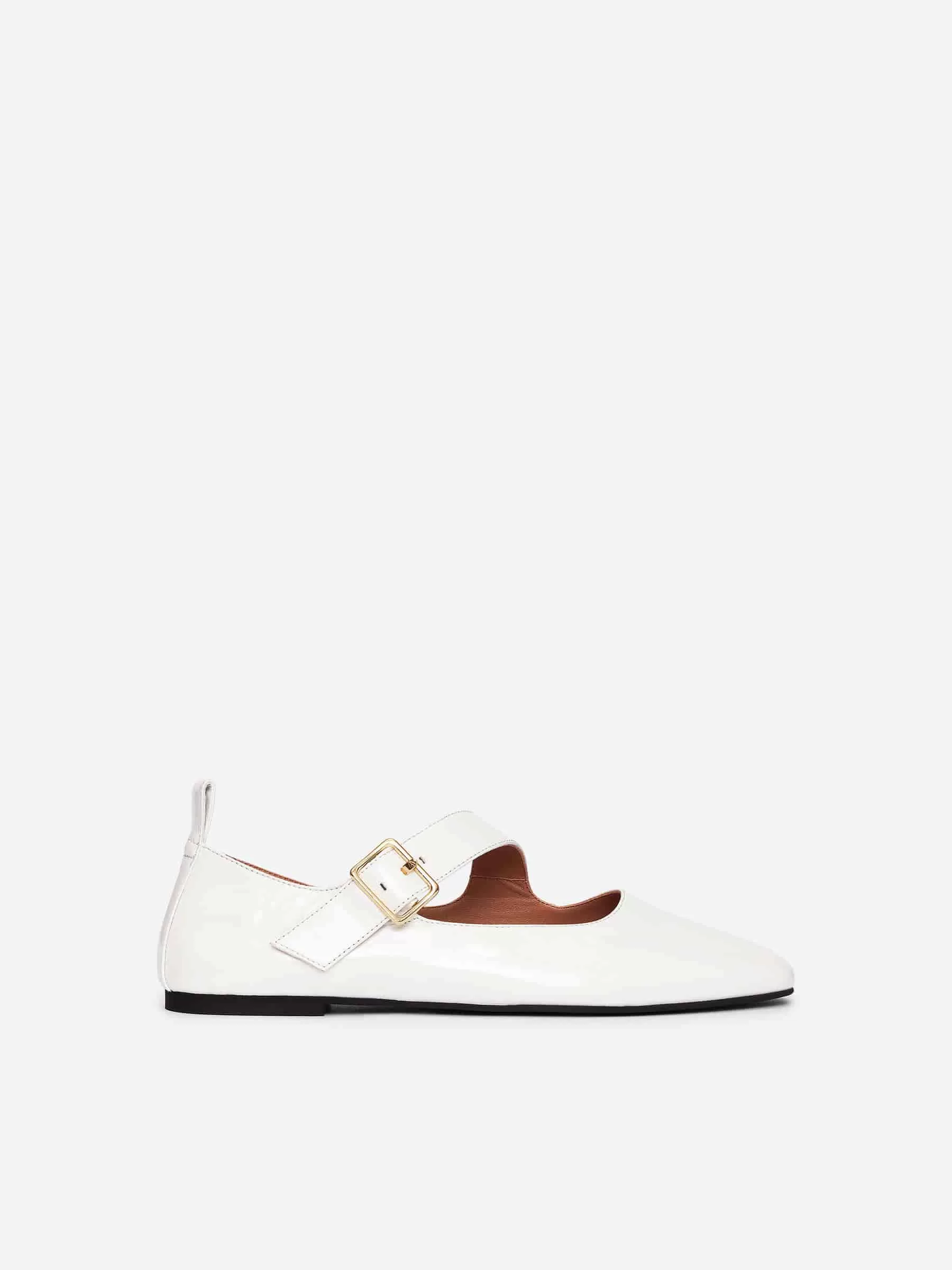 Balettlägenheter i Mary Jane-stil i glänsande läder. Breda justerbara remmar med ett guldtonat spänne.