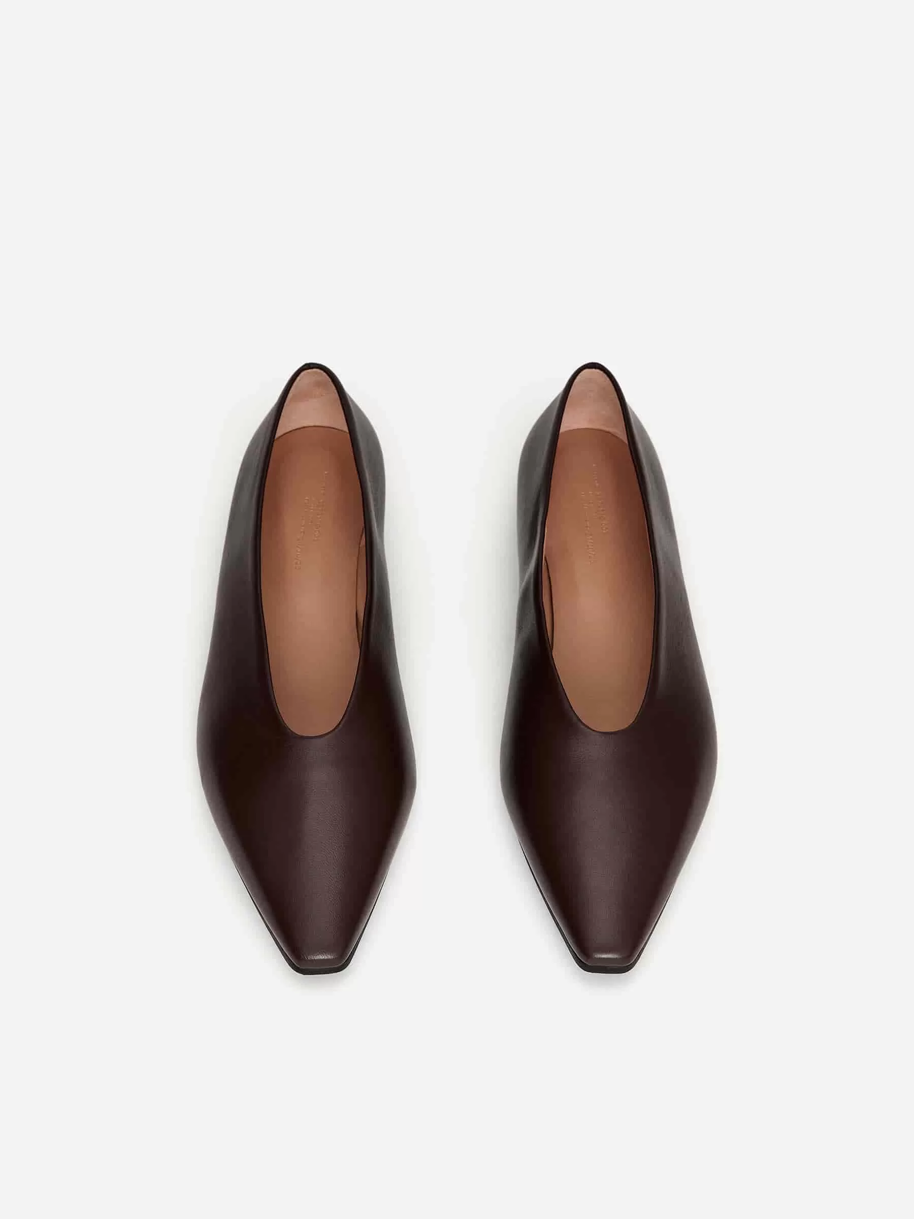 Släderplattor med spetsig tå och en äggformad överlinje.