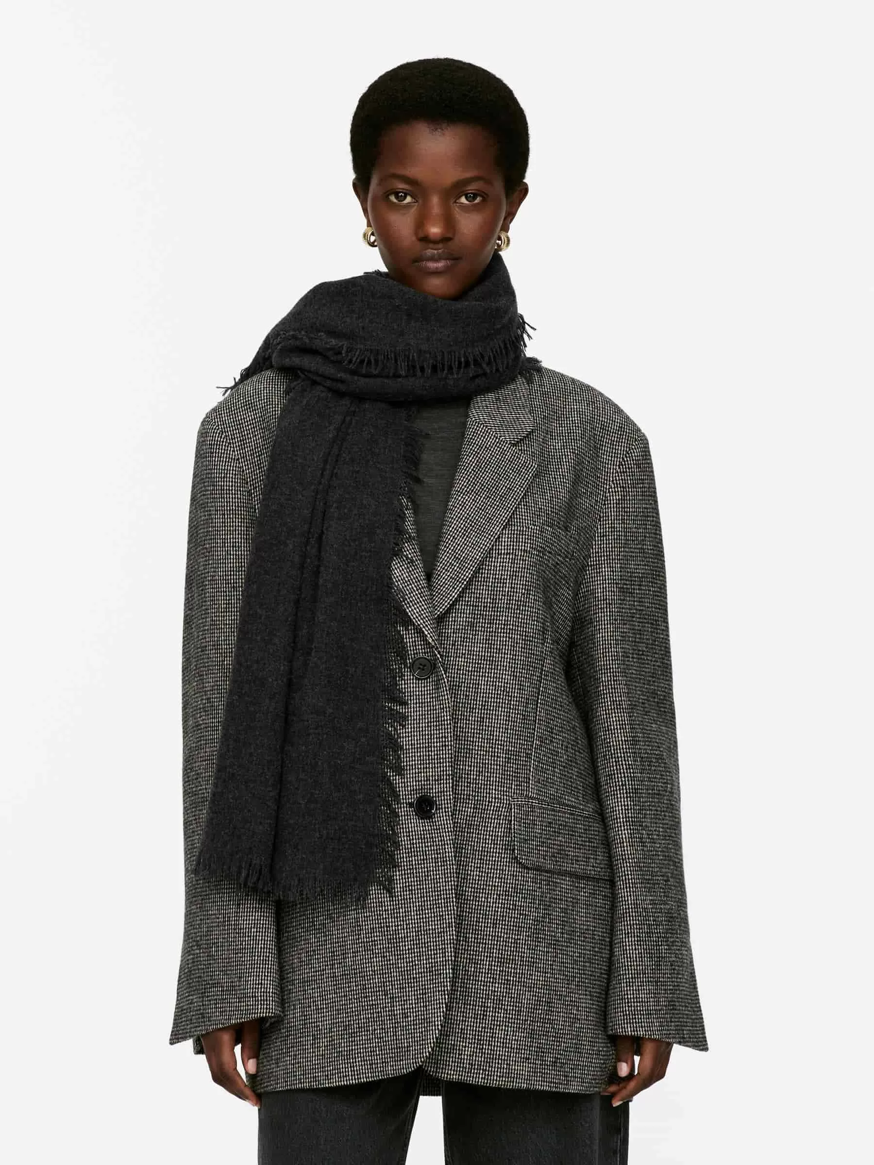 Scarf i lös väv gjord av ull. Detaljerad med slitna kanter. Mått 170 cm x 70 cm. Denna halsduk innehåller 100 % RWS-ull, certifierad av kontrollförbundet 877004. Produkter certifierade enligt Responsible Wool Standard (RWS) innehåller ullfibrer från gårdar som är oberoende certifierade enligt kraven på djurskydd och markförvaltning.