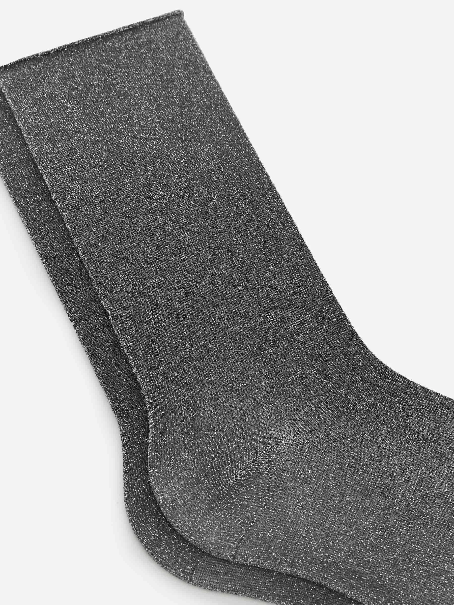 Strumpor stickade med en Lurex-tråd för en glittrig effekt. Rullade kanter.